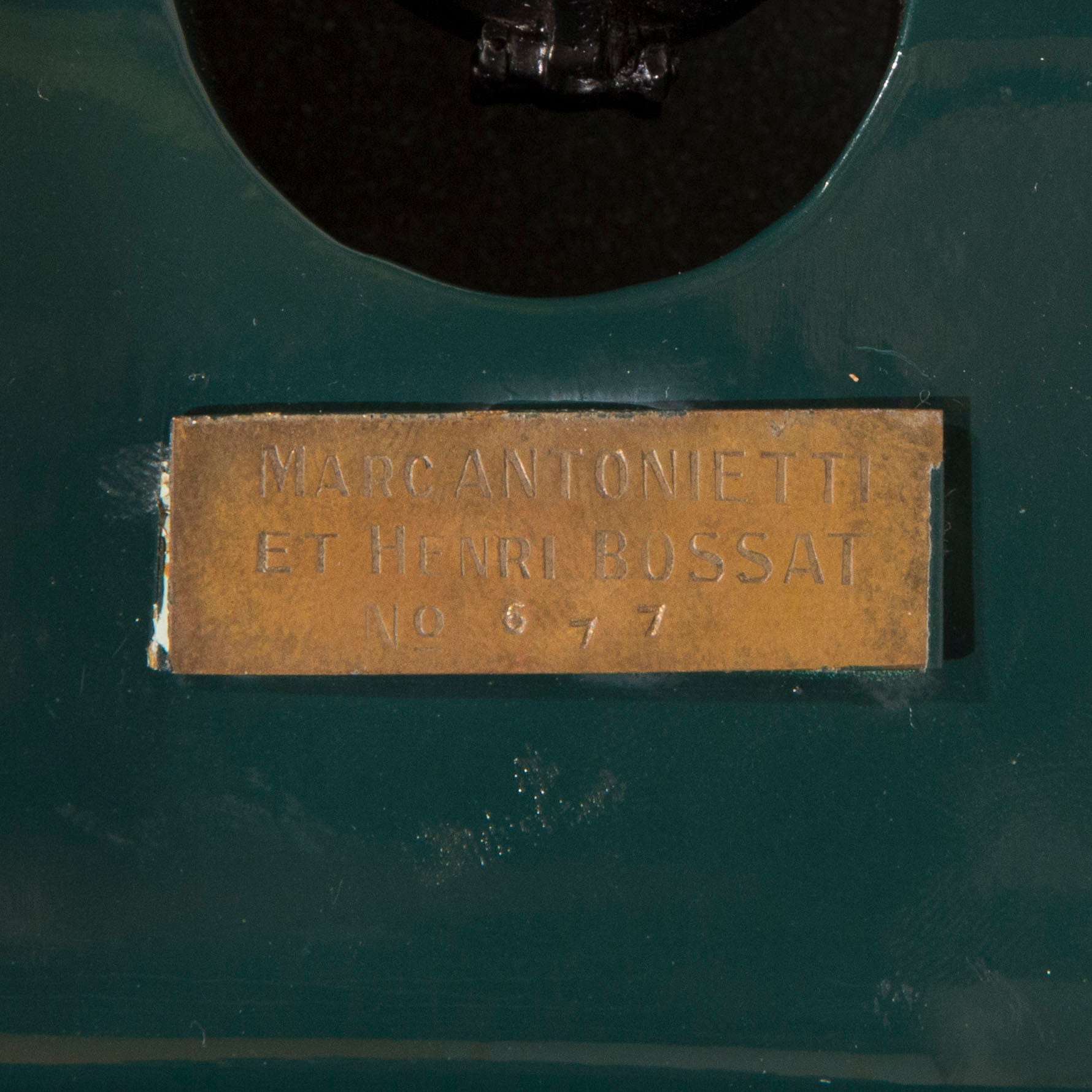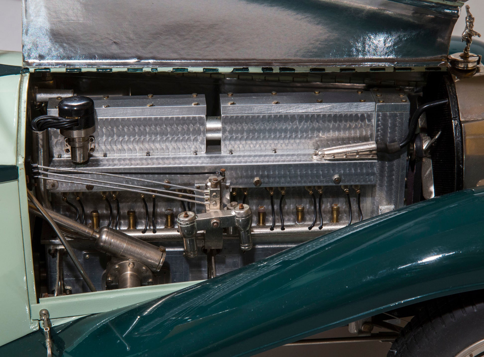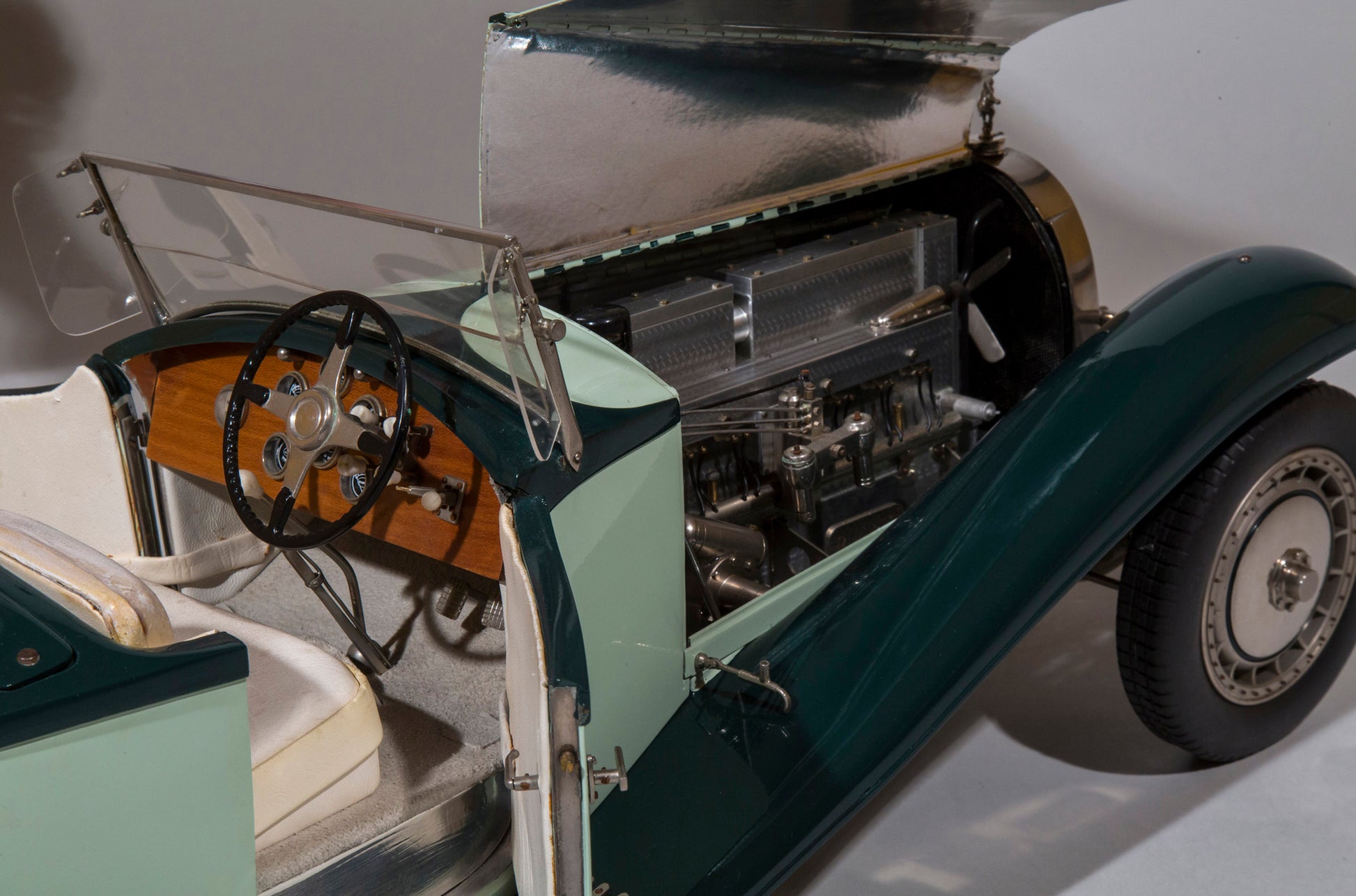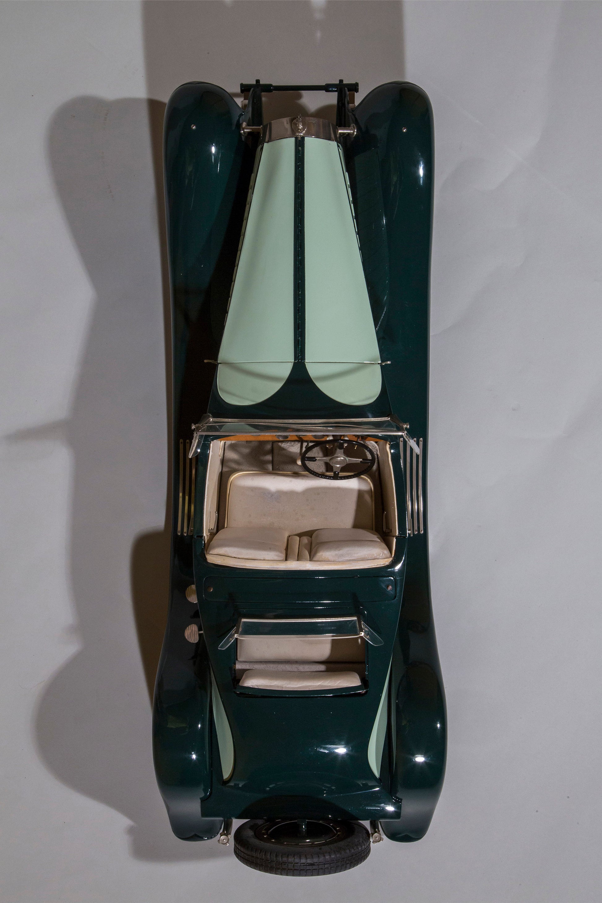 Custom-built at the Antonietti-Bossac workshop in circa 1960's, from in excess of 4000 individually prepared hand-made brass, steel, aluminium and copper parts. The exquisite details include a miniature Rembrandt Bugatti Elephant mascot on the hinged bonnet, revealing a fully detailed engine, aluminium wheels fitted with rubber tires, articulated steering to front wheels and rear suspension, handle-operated doors, opening to a padded cream leather interior, polished wooden dashboard with finely detailed instruments, a panel opening to rumble seat to rear, bodywork primed and finished in three layers of two-tone green paintwork and many others. There is a brass plaque to rear underside inscribed 'Marc Antonietti et Henri Bossat No 677'.