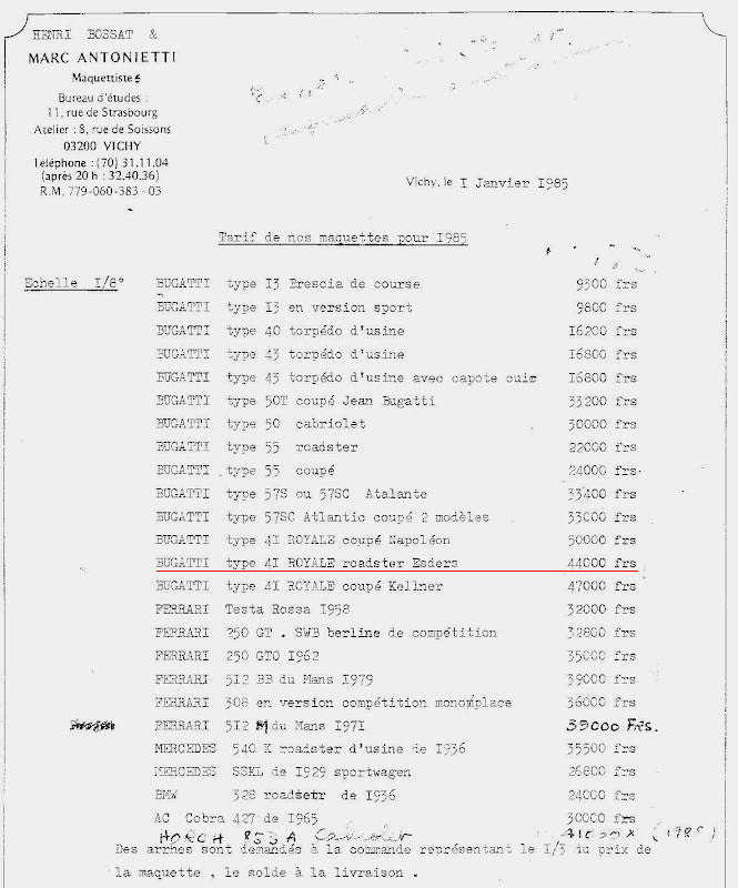 Antonietti's models rarely come to market; a less sophisticated miniature Type 59 numbered 664 was sold at Bonhams for $16,250 on August 16, 2013. Another Royale, the Coupe Napoleon, was advertised on eBay for $22,500 in 2012. The price of a new model, advertised by Antonietti in 1985 was Fr44,000, which was enough to buy an average car in the 1980's.