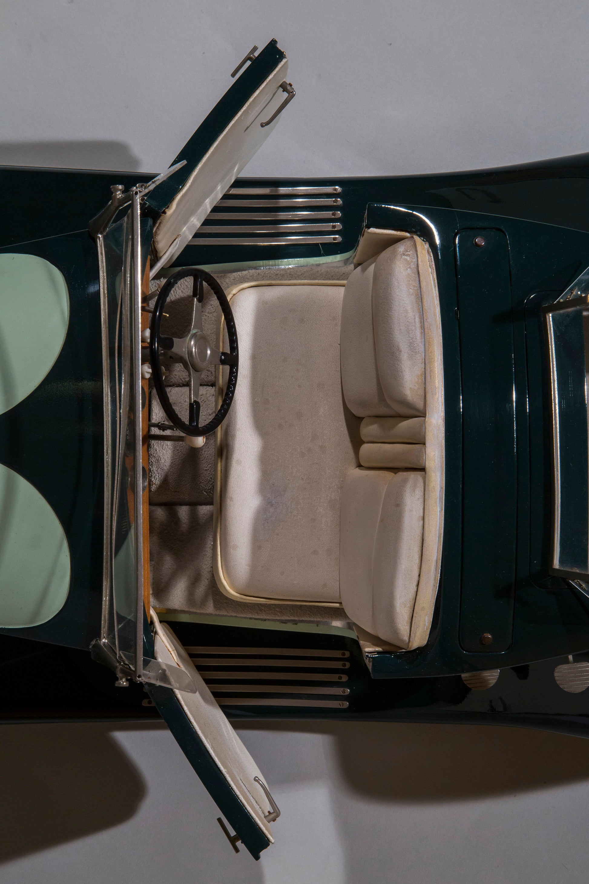 The condition of this superb miniature Royale is extremely good. The hand formed all metal body shows a little of its age as is expected with a piece around 40 years old, but this model truly wears its very mild/minimal patina very well. Some of the plated and raw metal parts show a little age, the leather interior is pleasingly patinated too. This model is amazingly well preserved and comes with a wooden platform and acrylic display case. It is a heavy piece with a combined weight of the model & case coming in at about 40 LBS.
