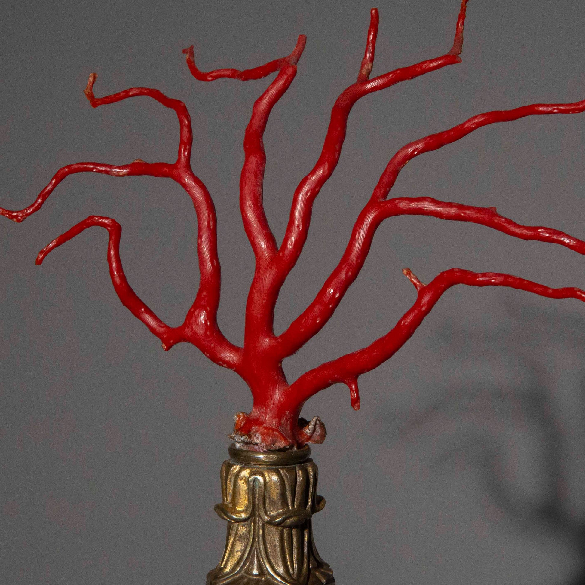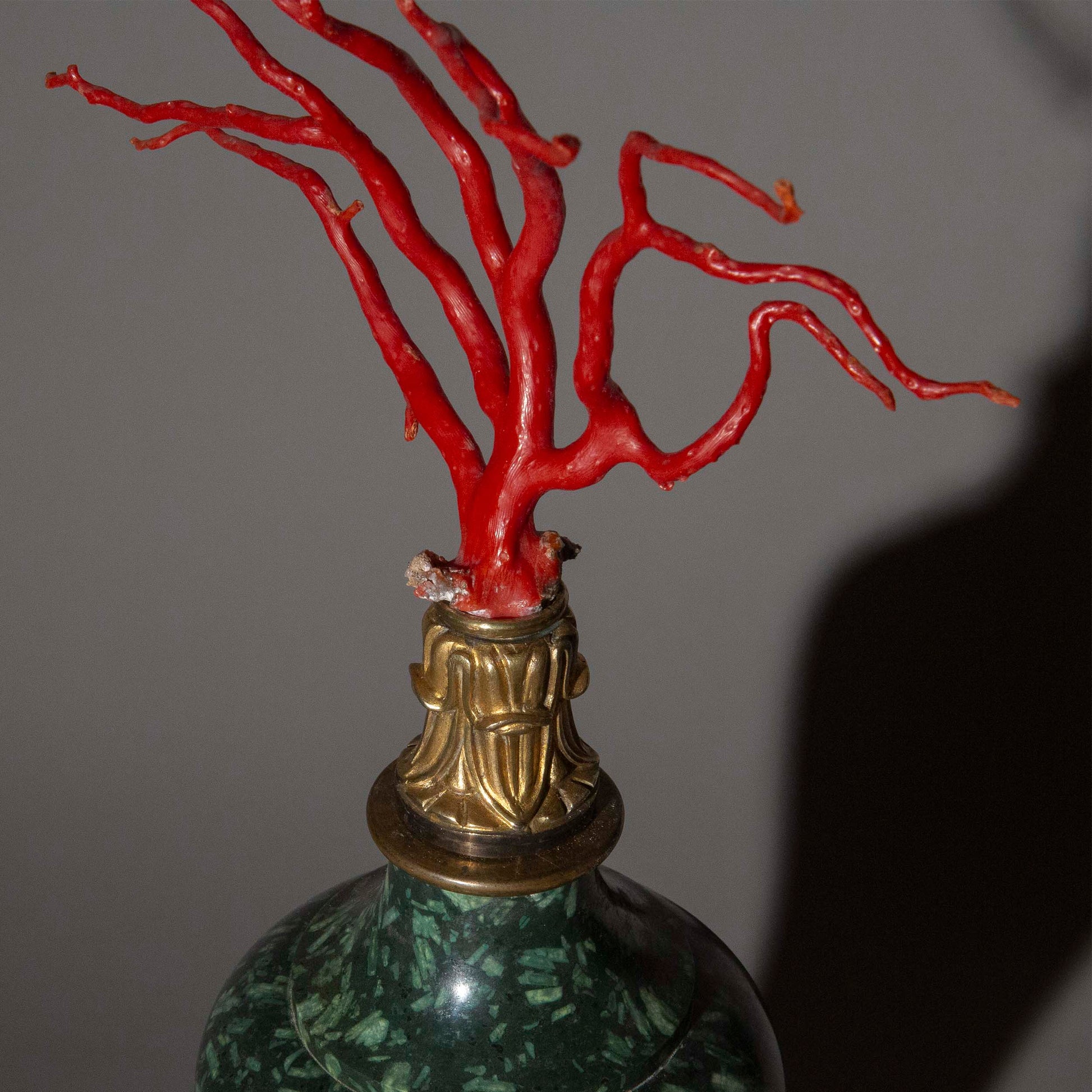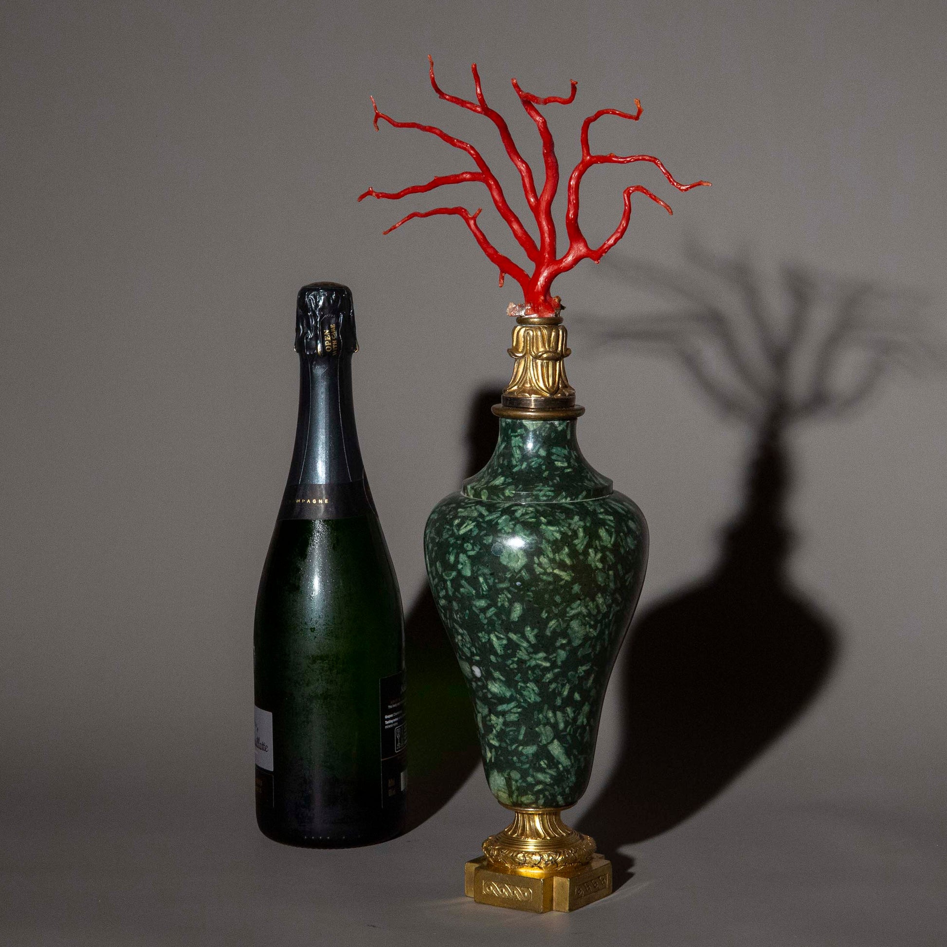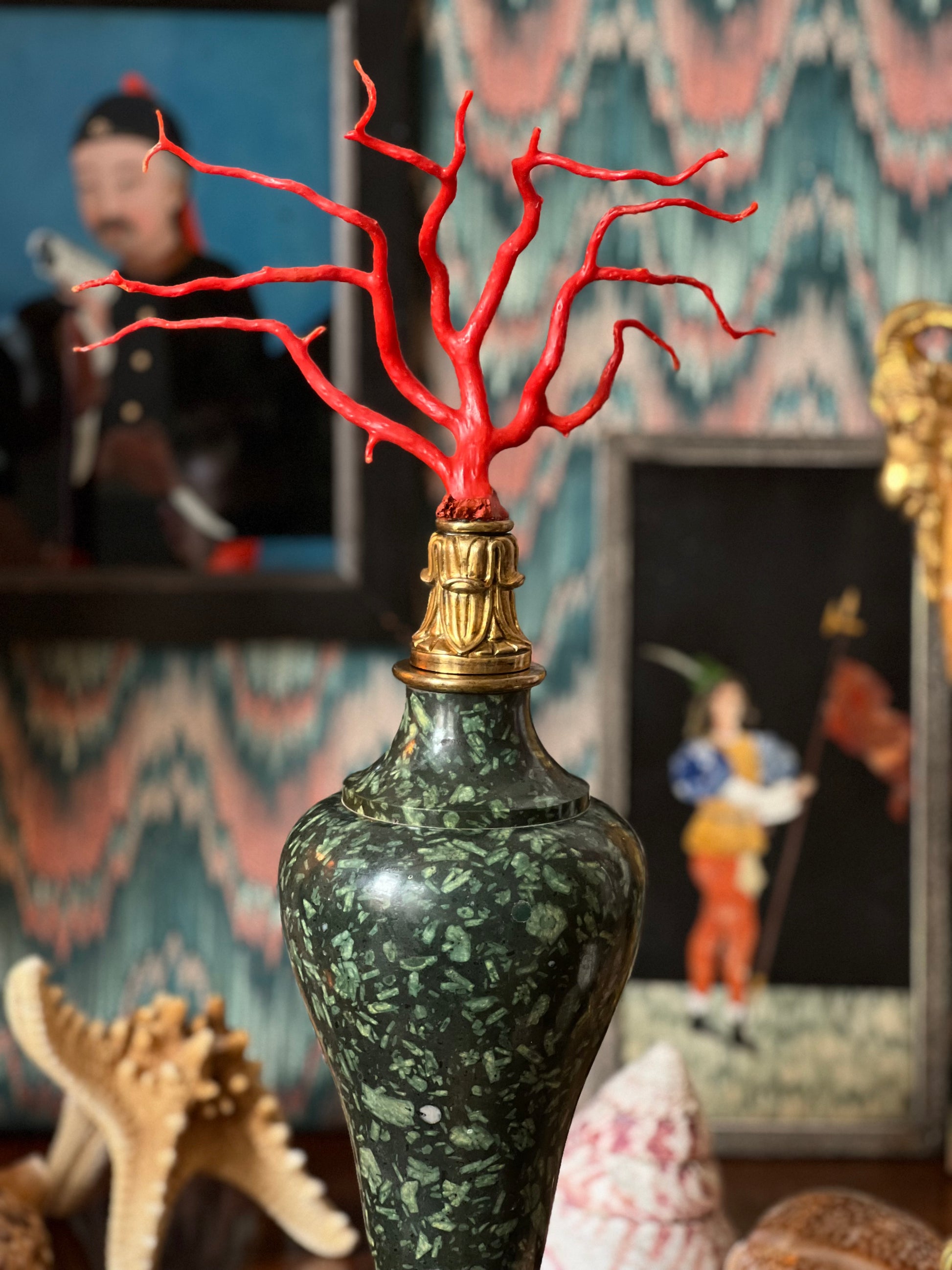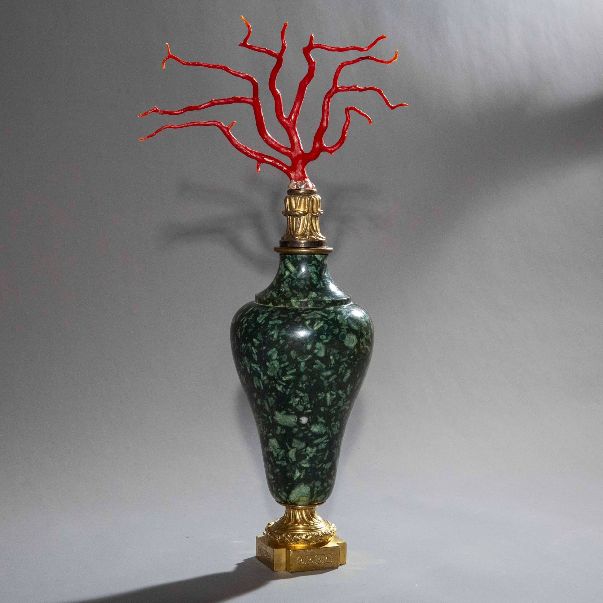 An exceedingly rare and sculptural red Mediterranean coral (Corallium rubrum) tree (i.e. a large single pieces of red coral), presented on an elegant, ormolu-mounted and extremely rare large solid agate-speckled green porphyry (Porfido Verde Agatato) urn. Italy, 18th century and later.