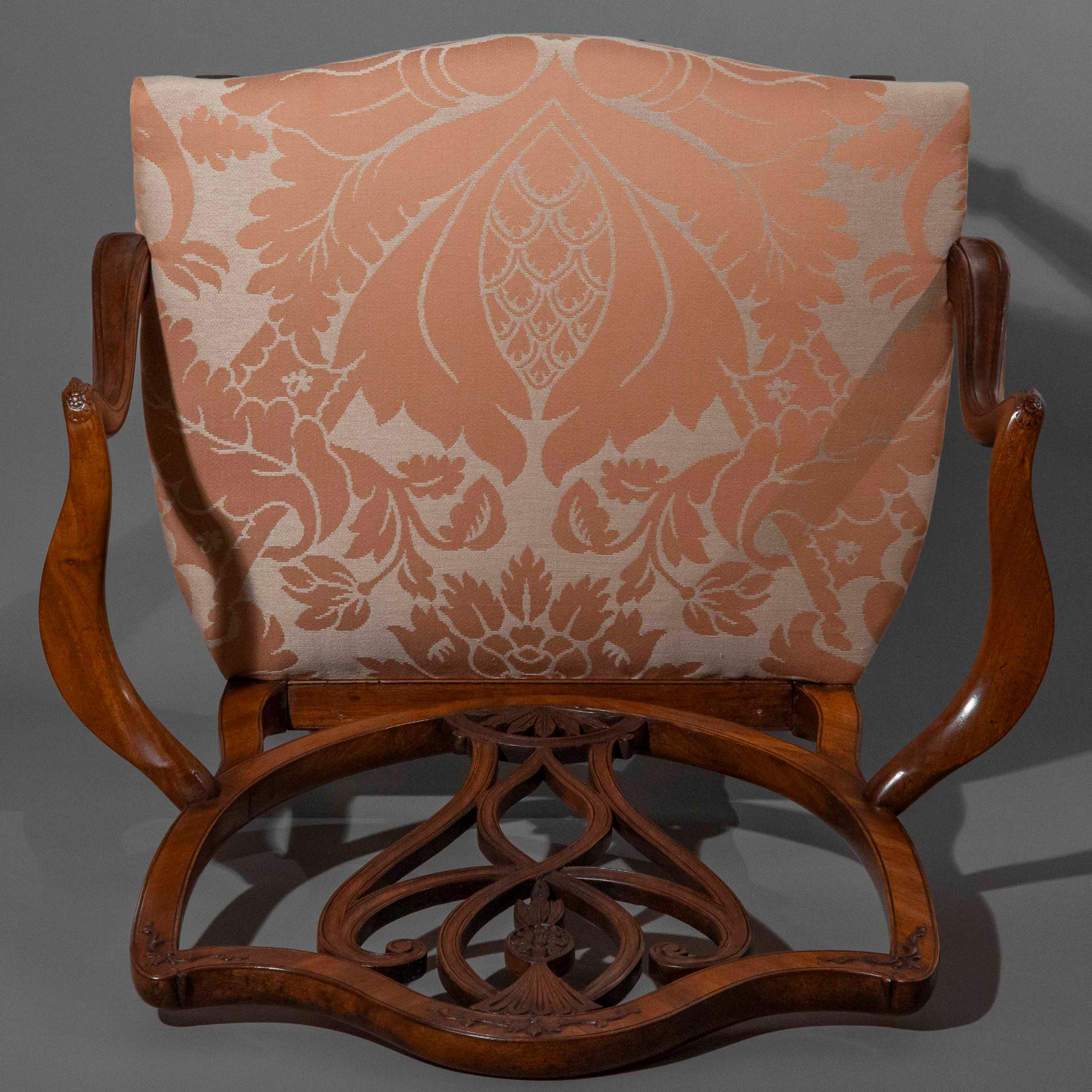 We love the grand scale of this armchair, with its confidently drawn, elegant back; the sculptural, superbly carved armrests and the gloriously golden colour of the mahogany. The fine carved ornaments on the crest rail are very rare and unusual. Perfect as occasional seating in a living room as well as a generous desk chair, this beautifully reupholstered armchair is bound to be a statement piece in your home.