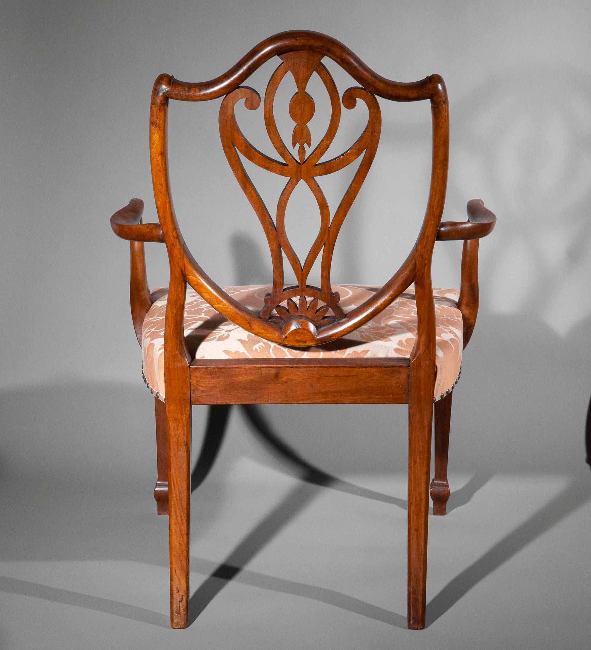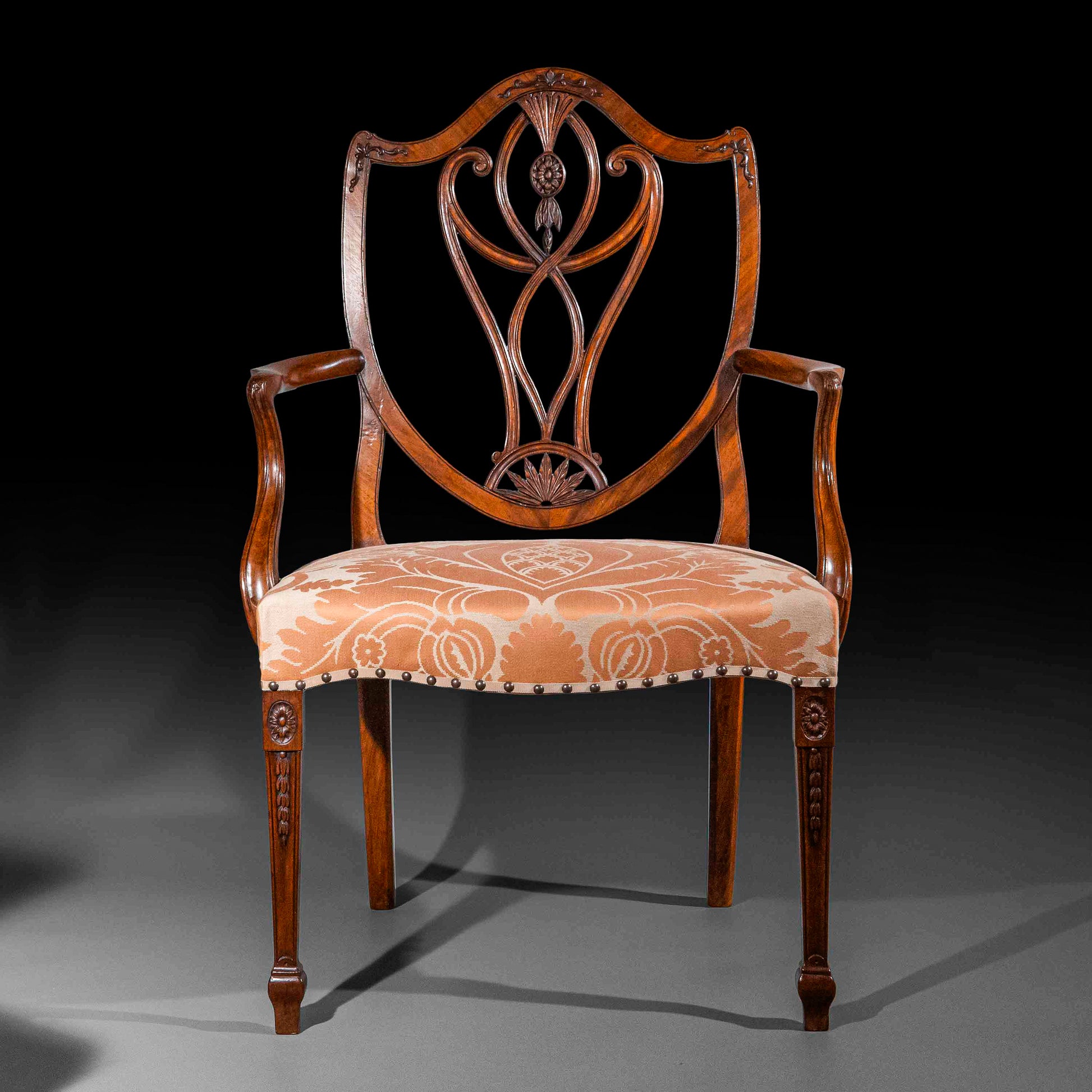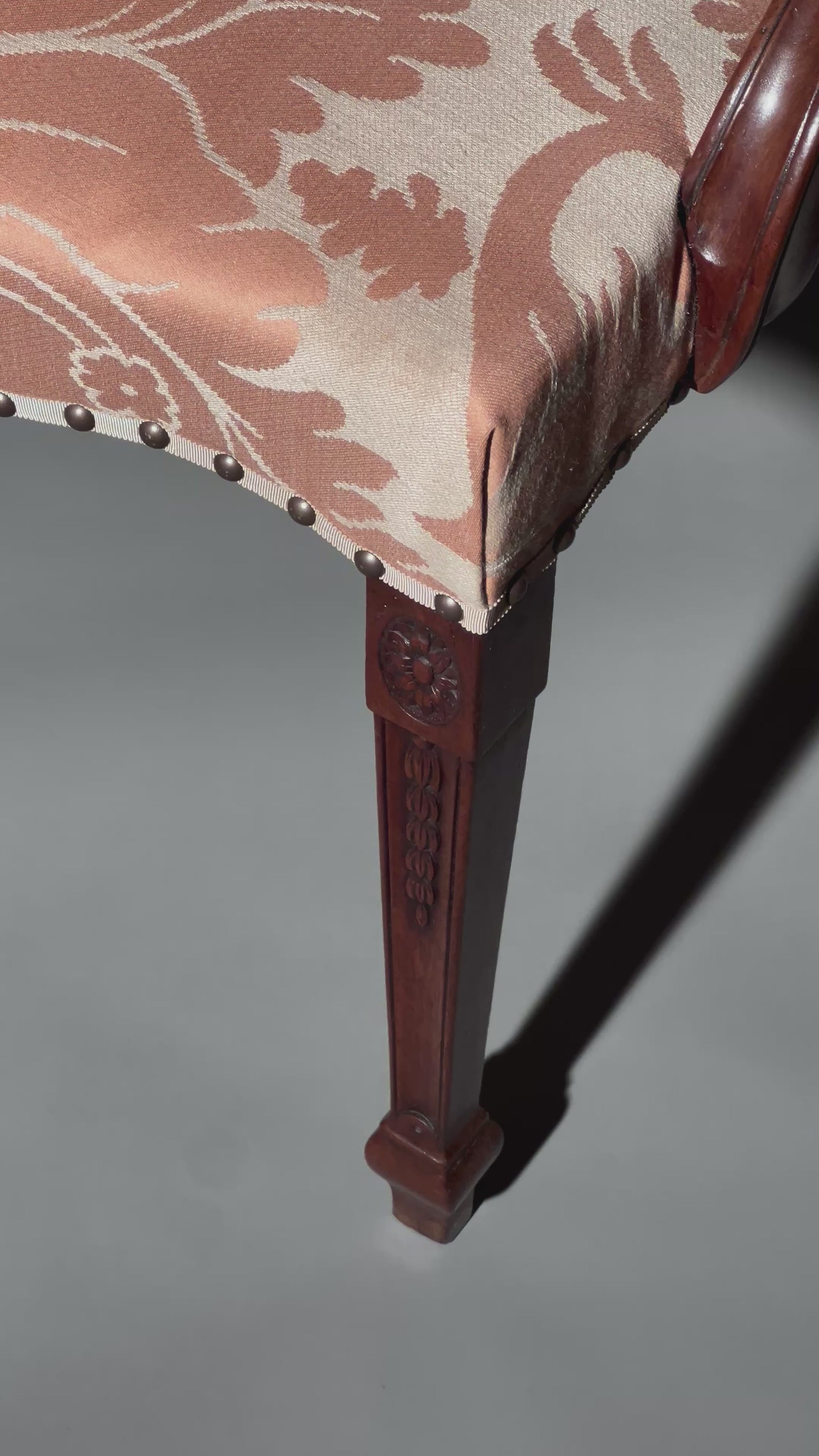 A very elegant late 18th century Adam period armchair or desk chair of very generous proportions, newly recovered in splendid Italian archival silk and linen damask, exquisitely finished to perfection with patinated bronze studs over matching trim. England, circa 1790's.