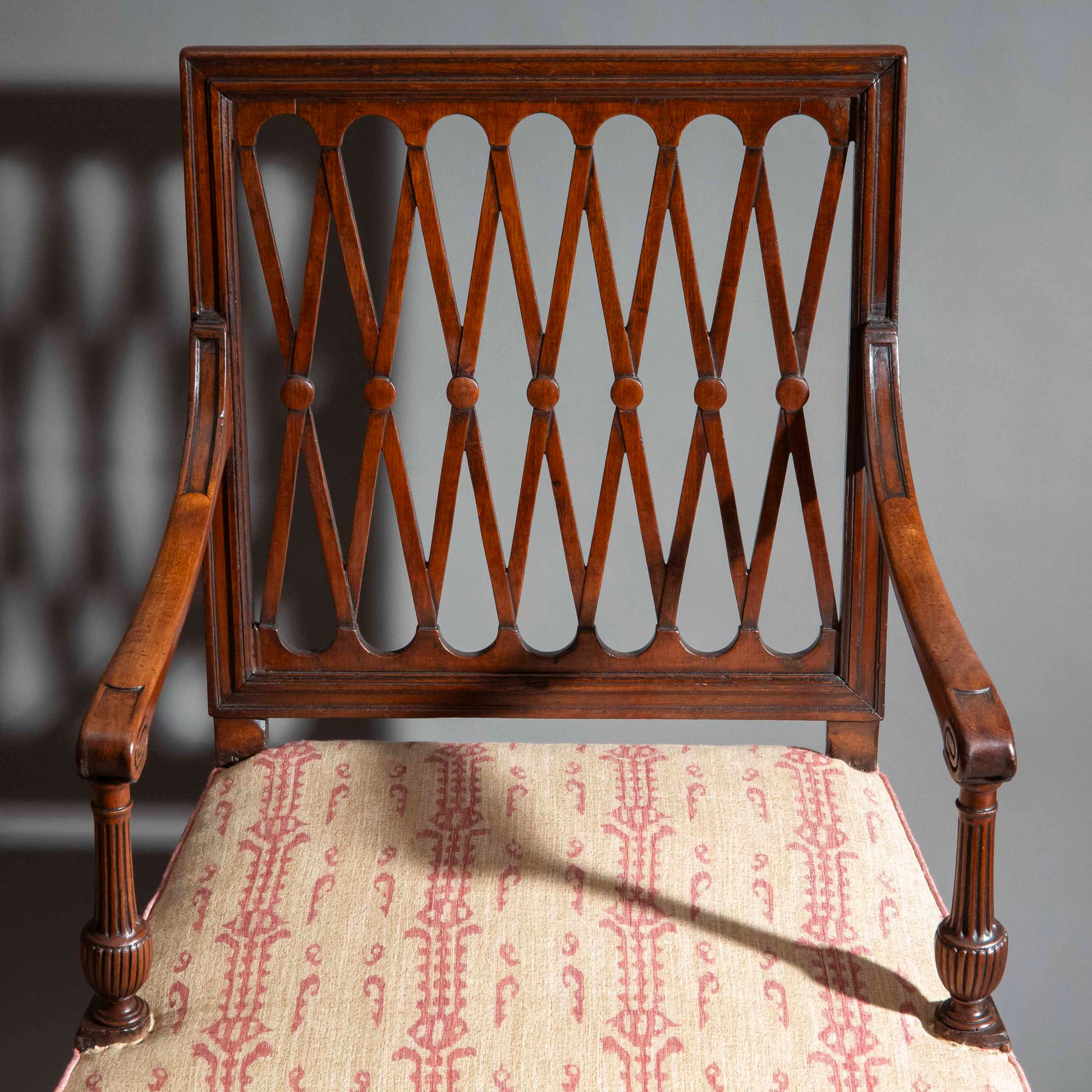 The design was adopted by the influential architect/designer Sir John Soane (d. 1837). He commissioned the set of twenty 'mahogany trellis chairs' for the Governor’s Room at The Bank, supplied in 1809 by the cabinet-maker David Bruce (d. 1823) of Aldersgate Street, London (see M. Jourdain, 'Early 19th-Century Furniture at the Bank of England’, Country Life, 3 October 1947, p. 676, fig. 2). Soane owned a pair of armchairs of the Bank design at his own home at Lincoln’s Inn Fields, now the Soane Museum, and adapted the design for a set of dining-chairs supplied by John Robins in 1821. Robins' invoice described these as 'trellis back chairs moulded & Paneled [sic] seats French stuffed covered with black Spanish Morocco red welts [and] stout turned feet to pattern’.