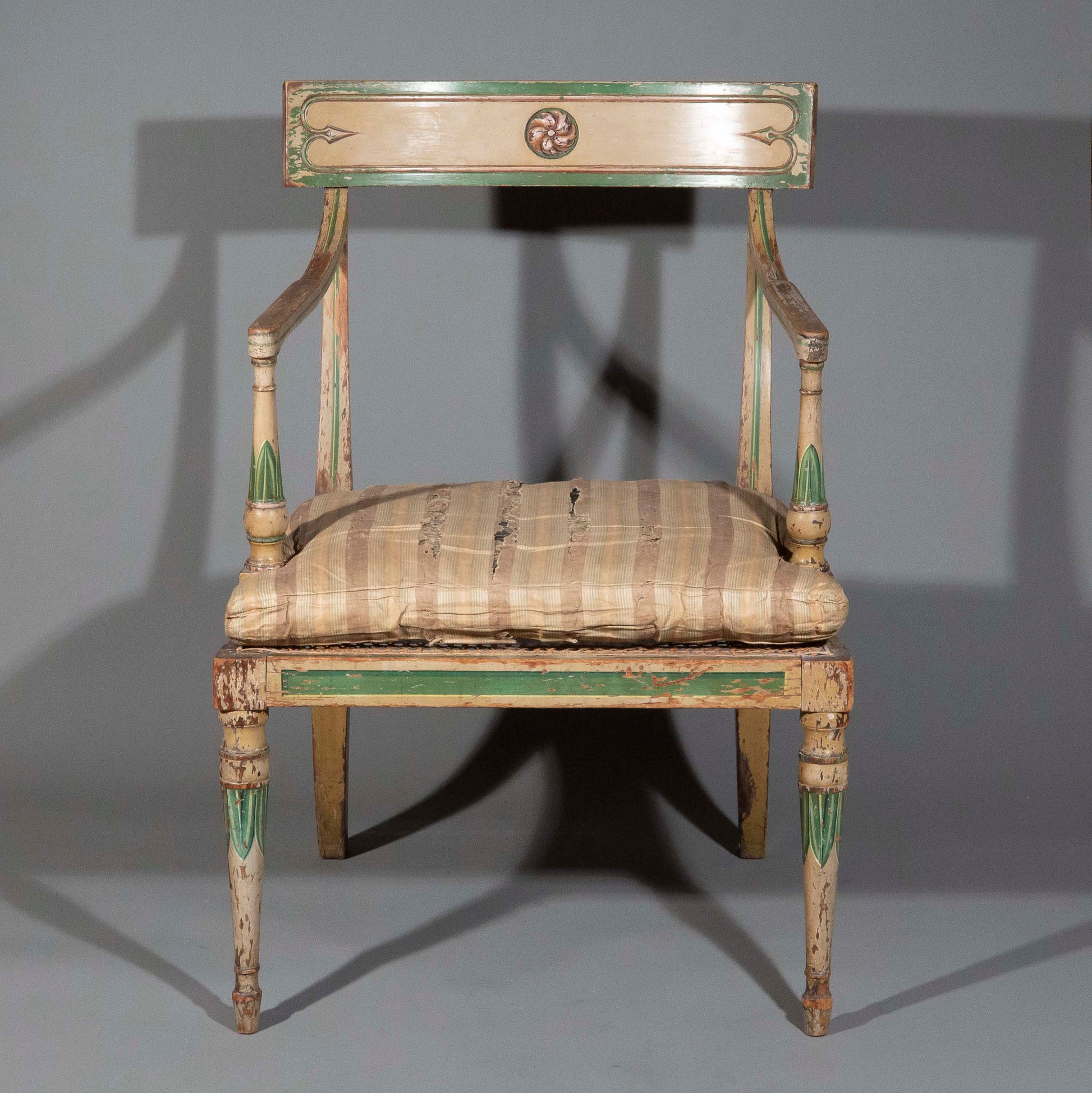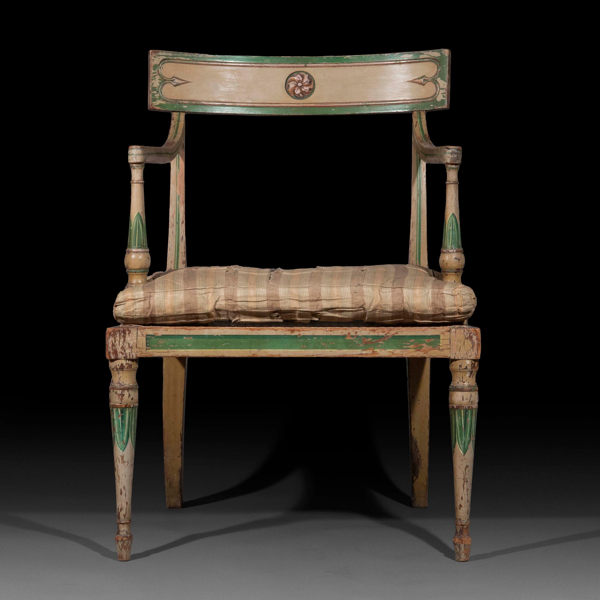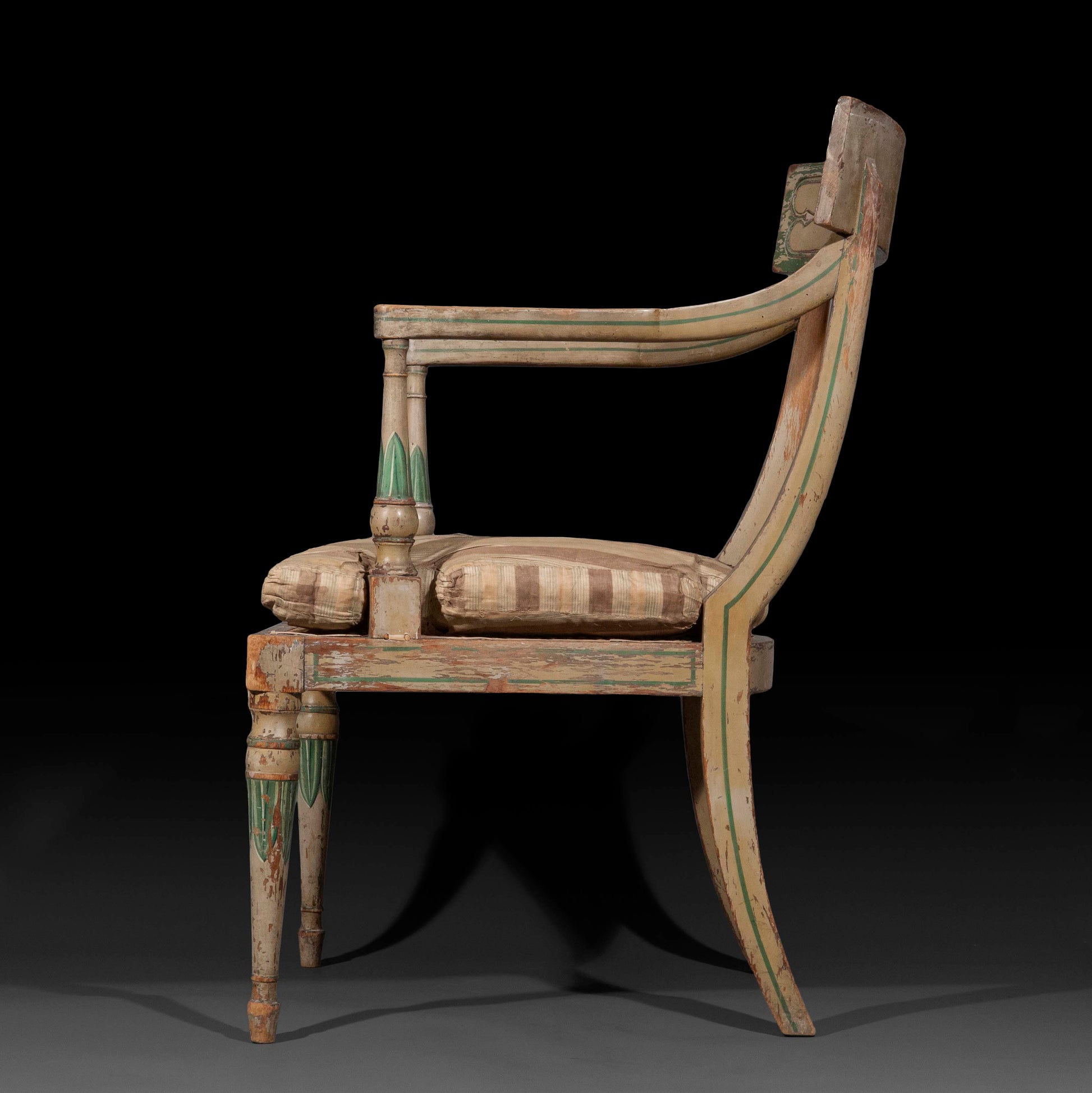 An elegant cream and green painted armchair of George III period, attributable to Gillows of Lancaster and London. England, circa 1805–10.