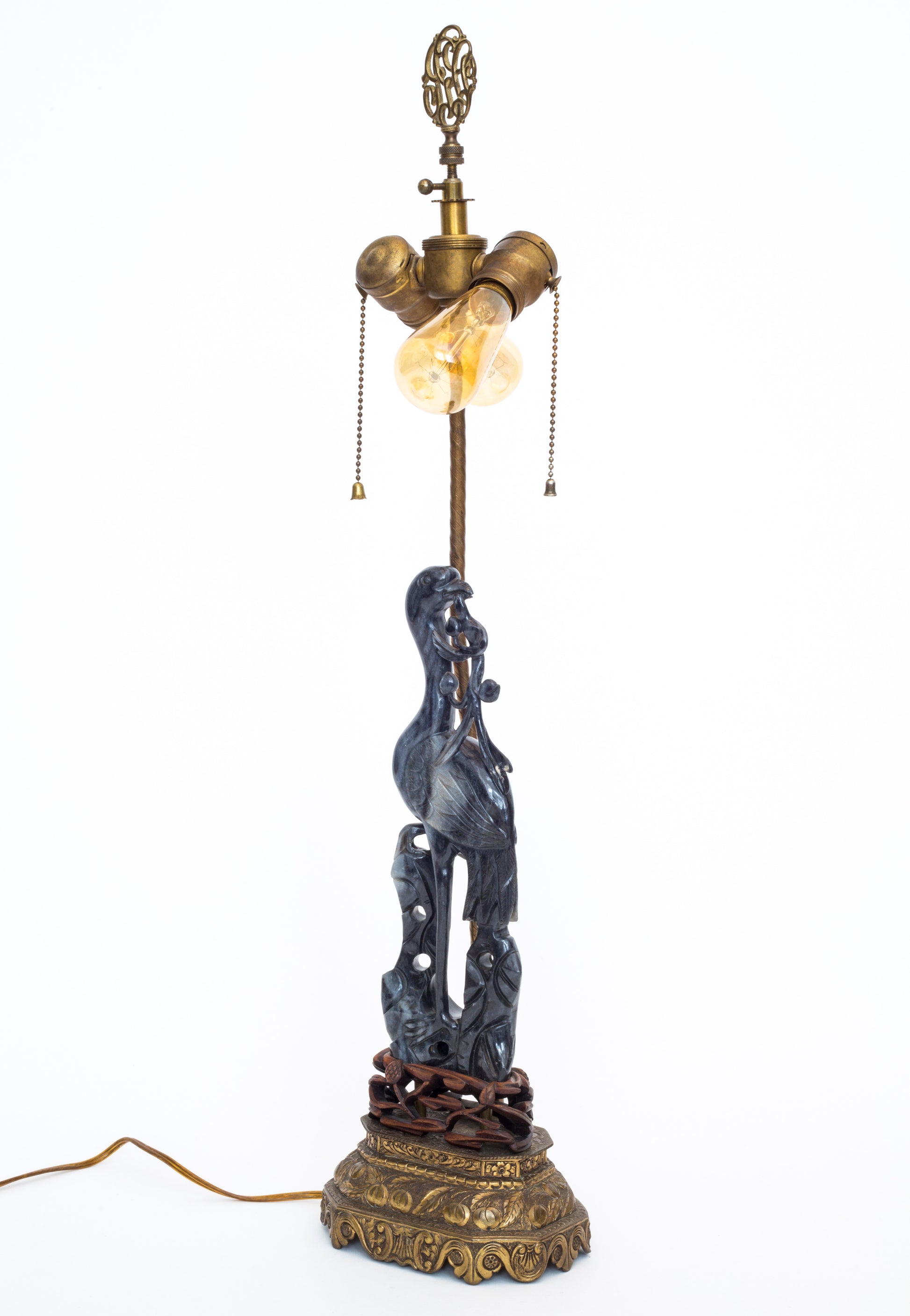Antique carved black hardstone figure of crane, now mounted as lamp.