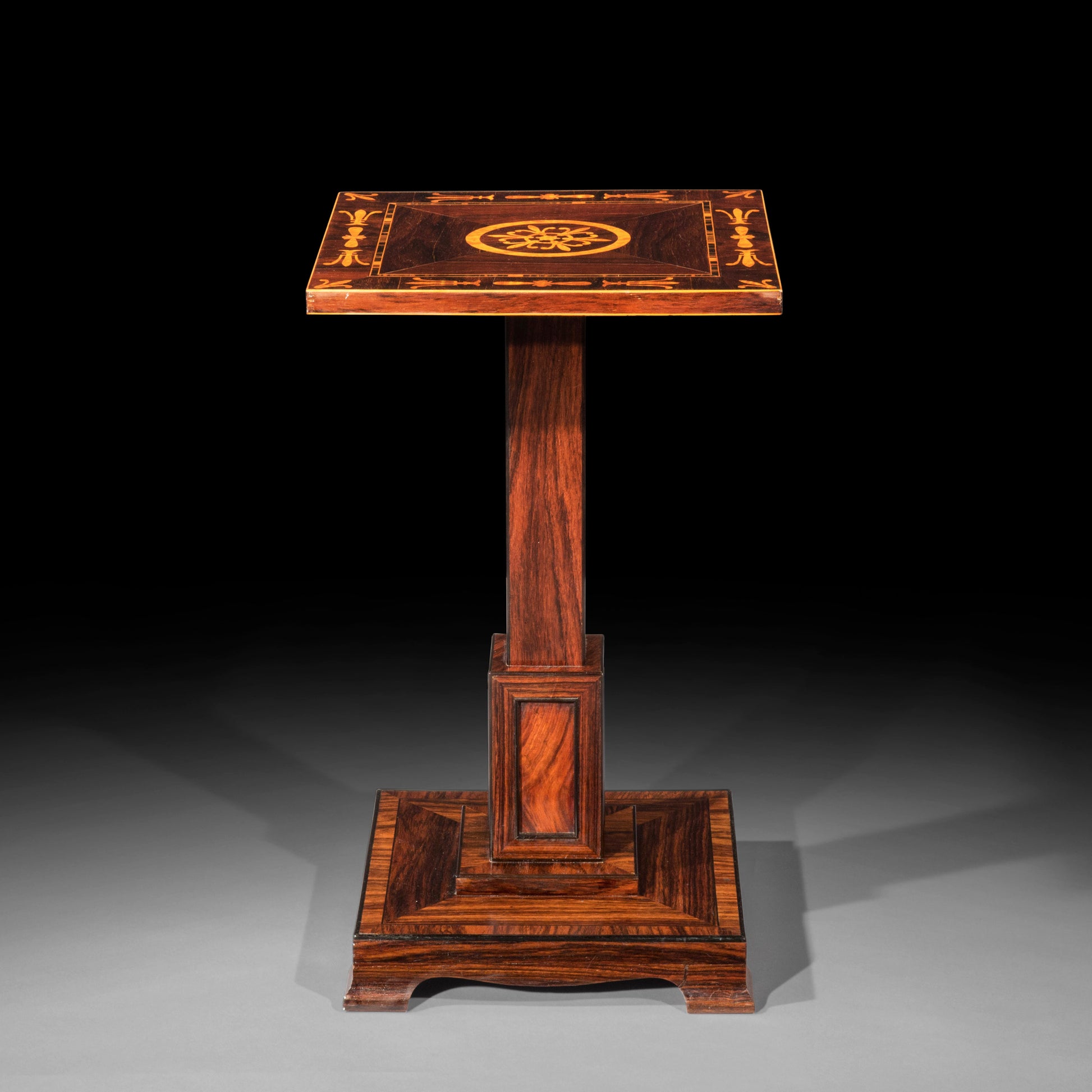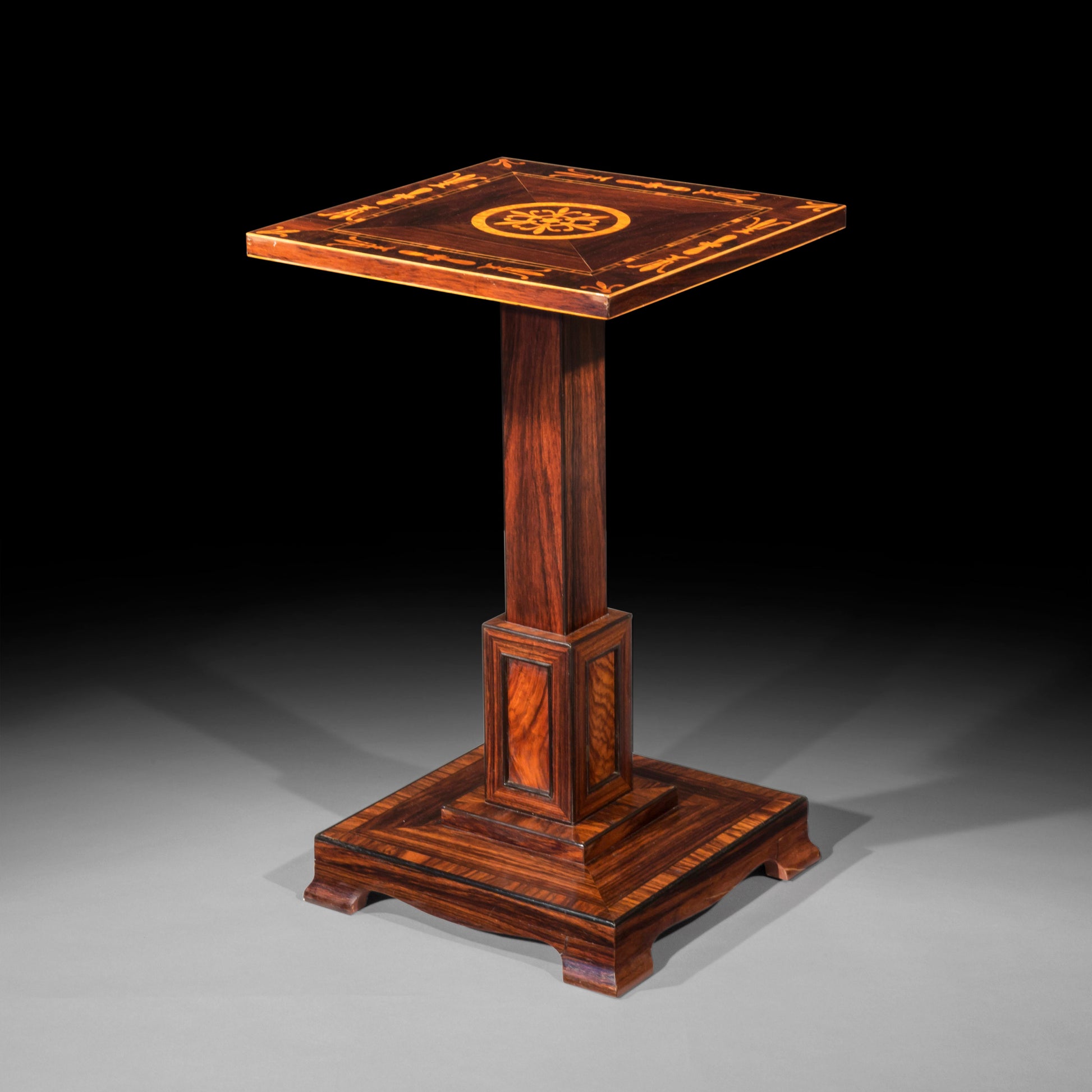 We love the unusual, architectural design of this little table, with its stepped and panelled column and classical marquetry to the top. A highly decorative and useful piece.