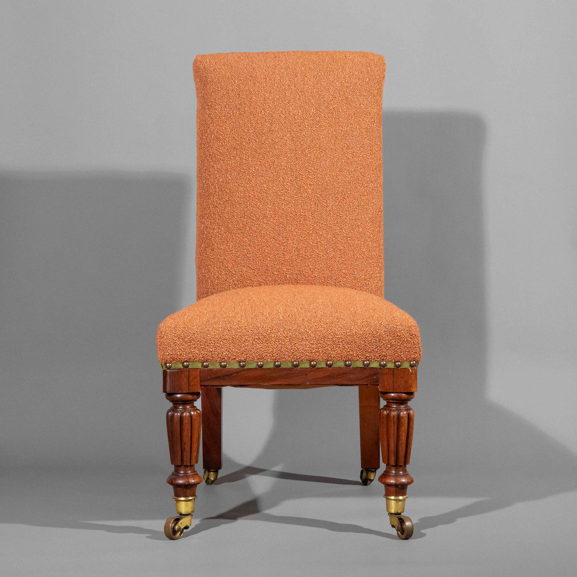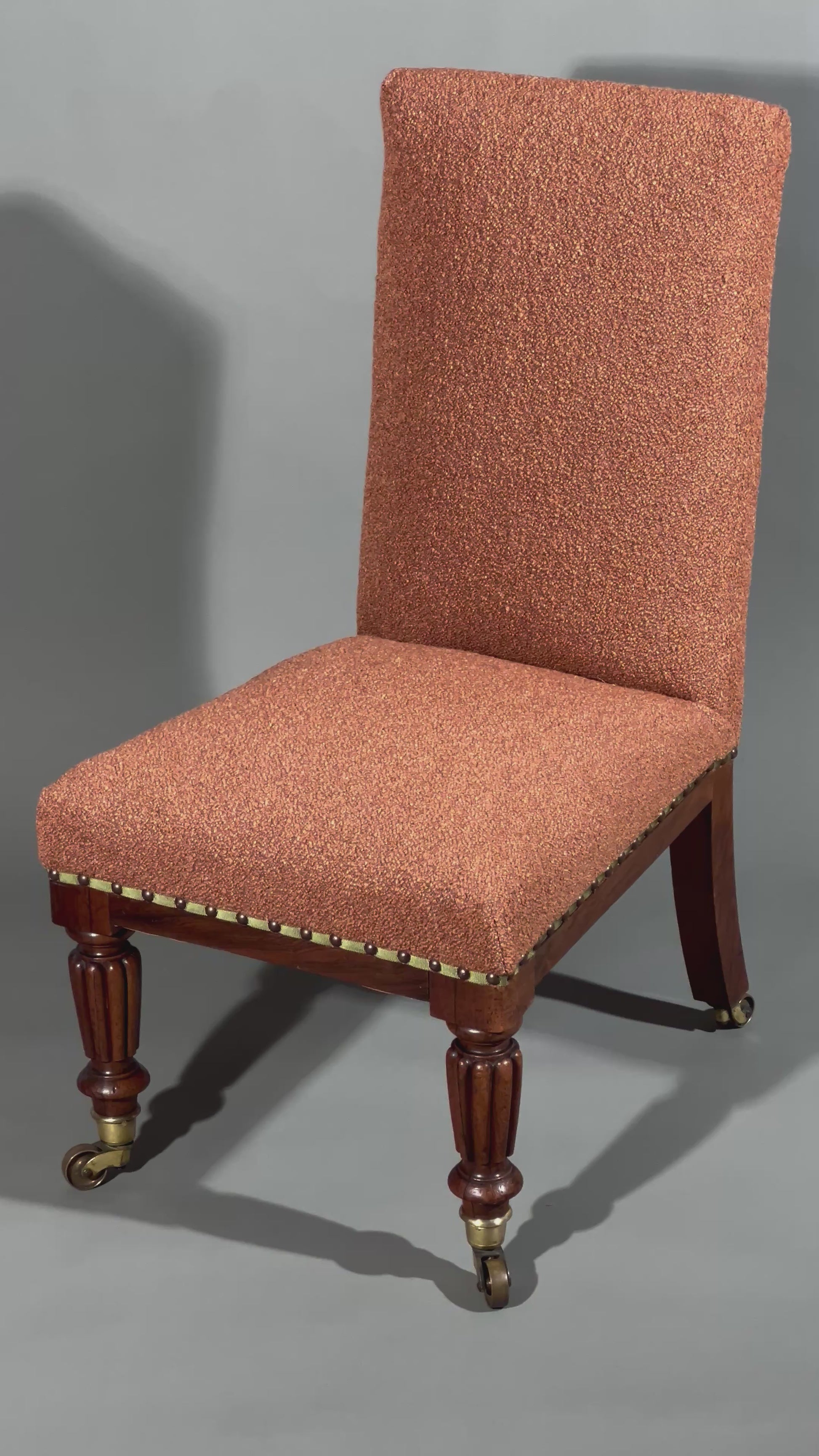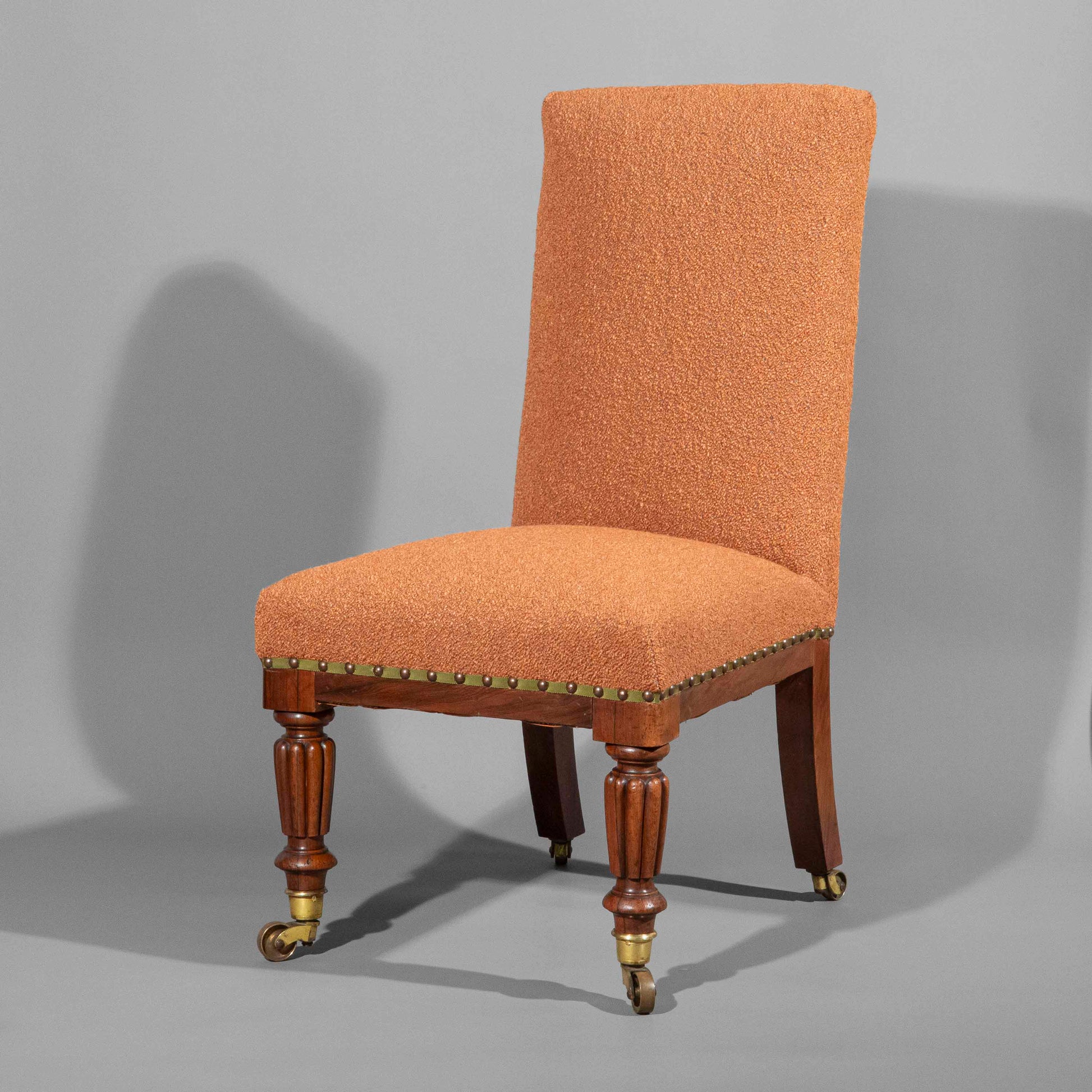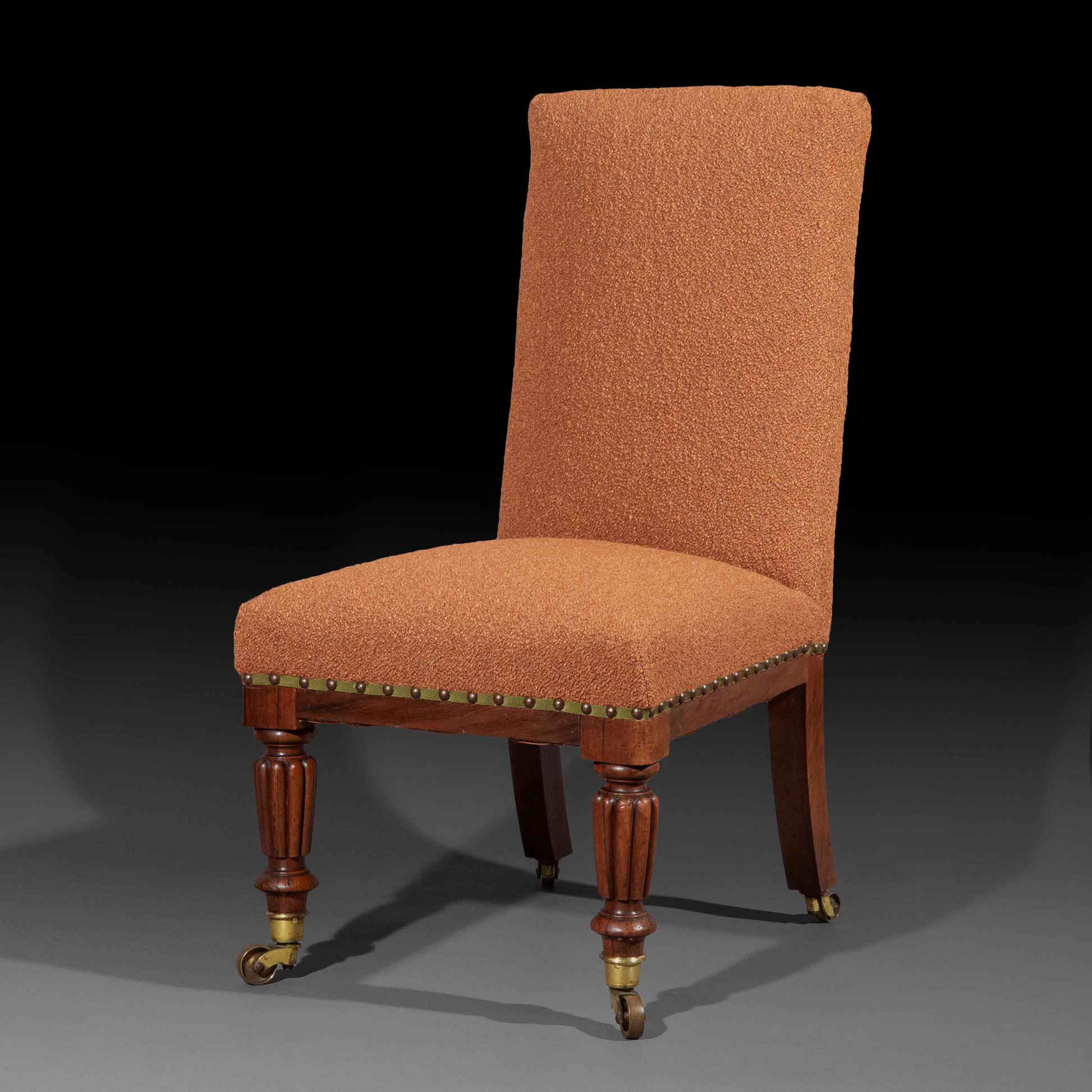 A very smart and comfy early 19th century slipper chair, newly recovered in super-chic C&C Milano 100% wool Italian textile, exquisitely finished to perfection with patinated bronze studs over olive trim. England, circa 1820.