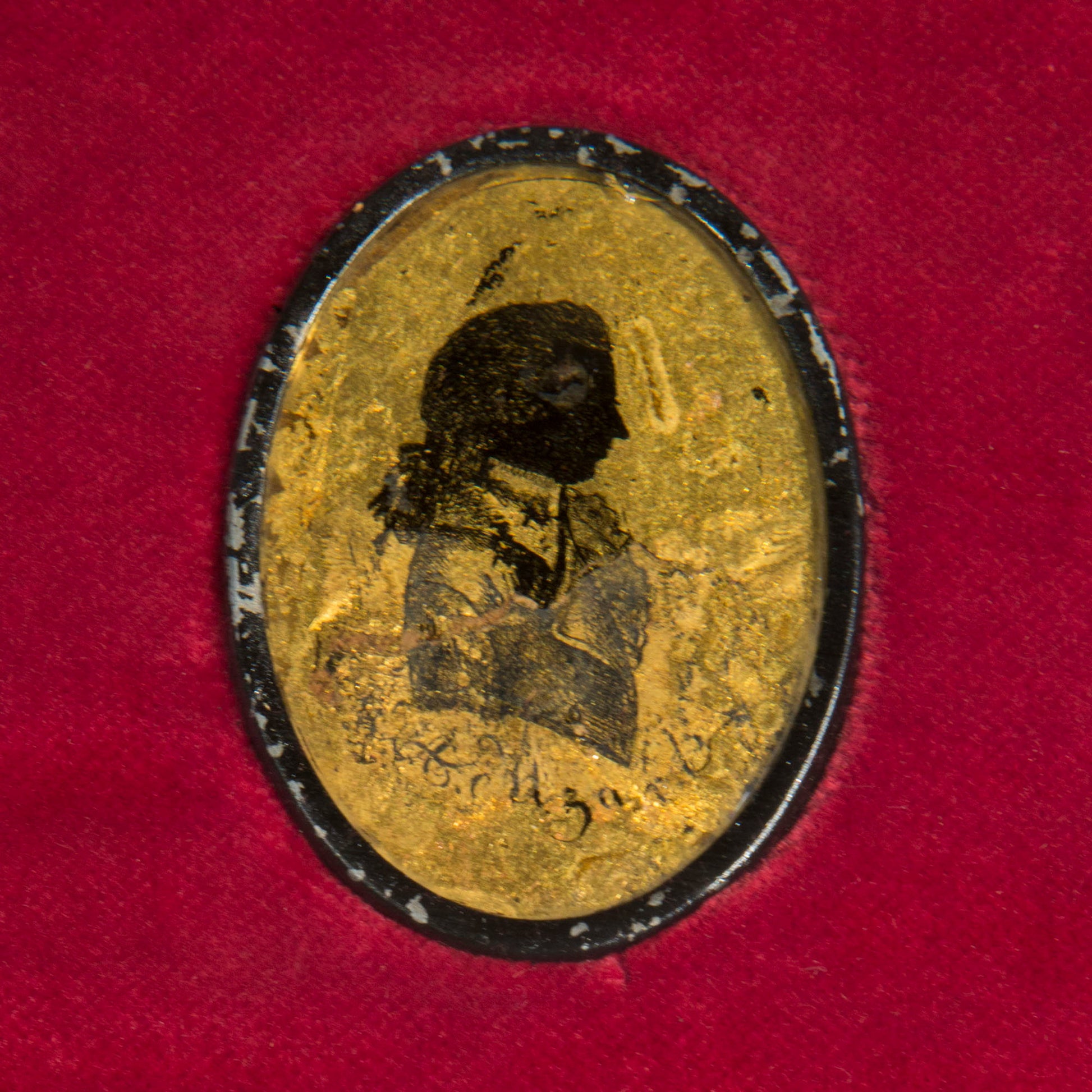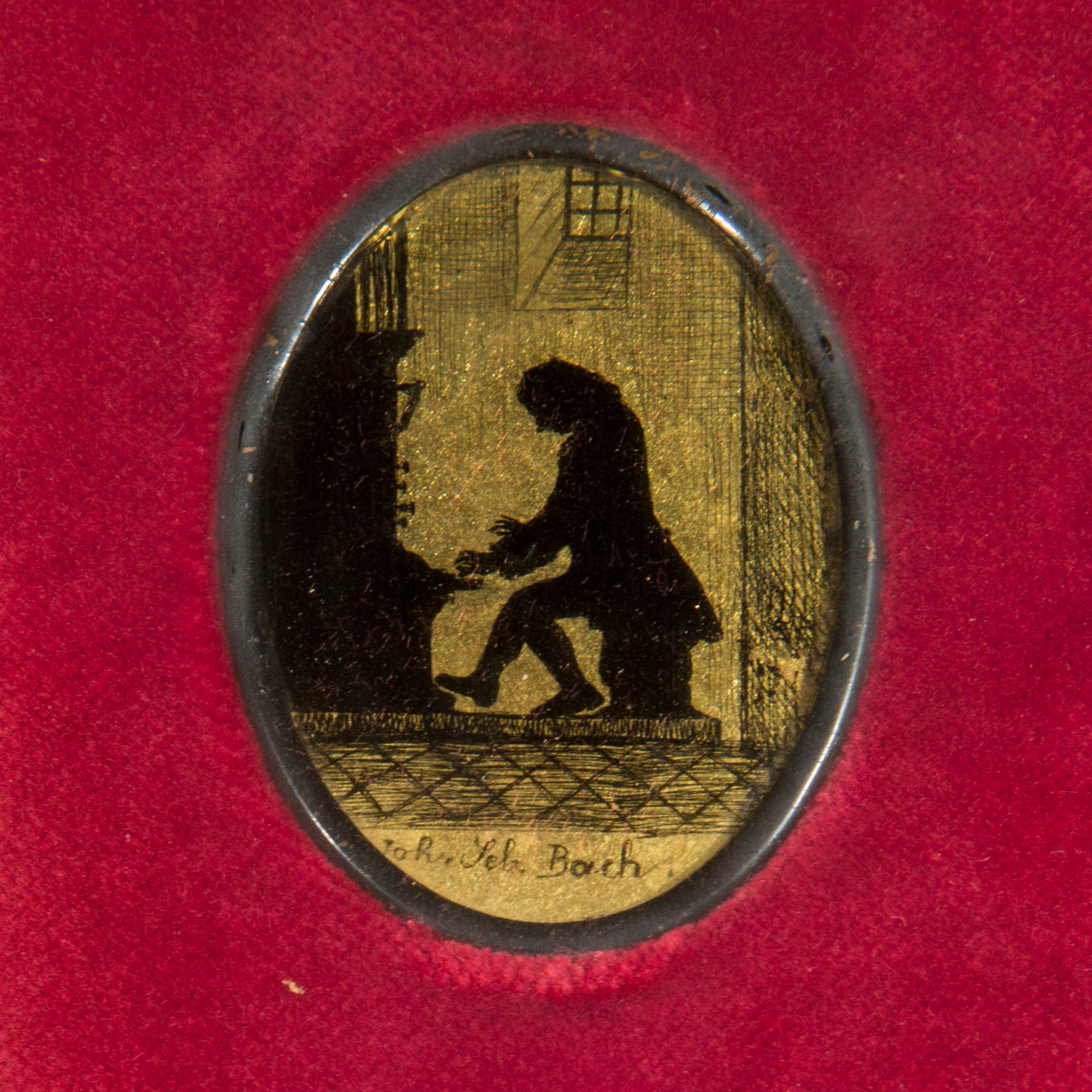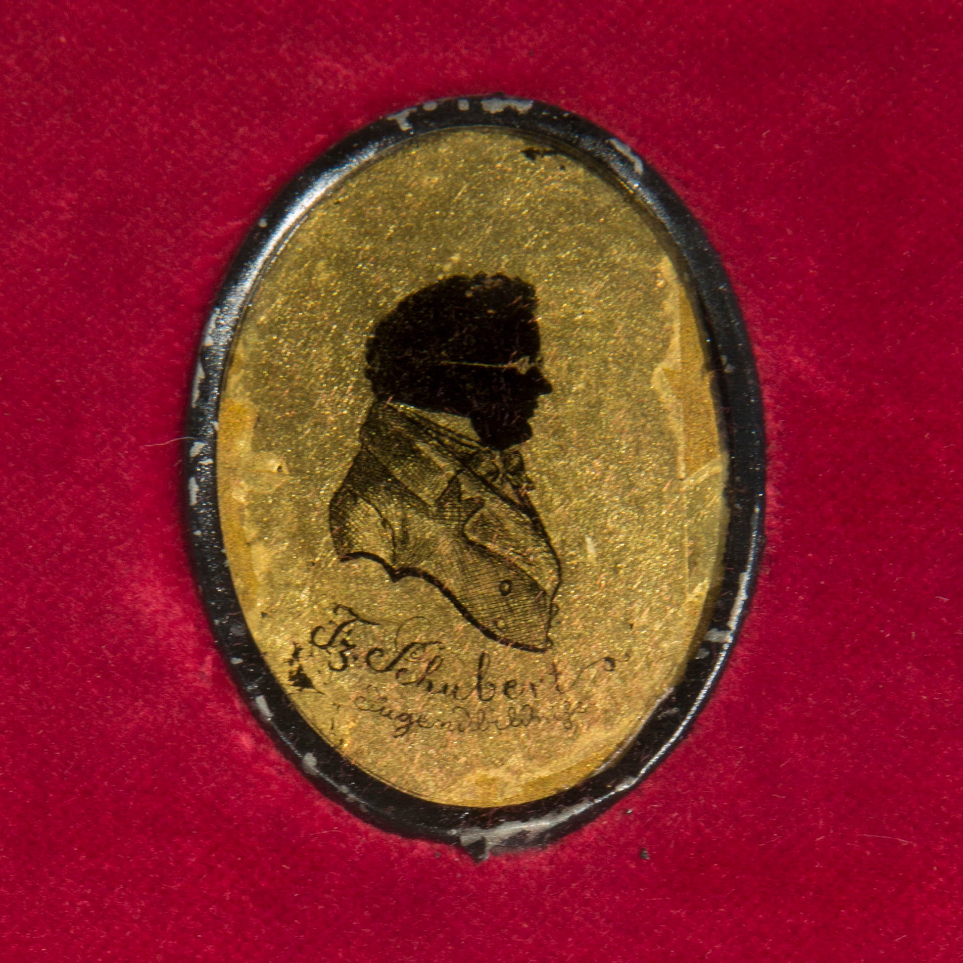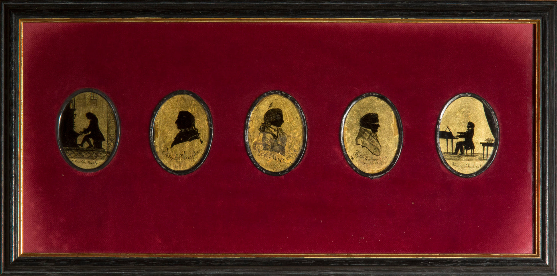A charming 19th century framed set of five gold leaf silhouettes of classical composers, to include Bach, Haydn, Mozart and Schubert.