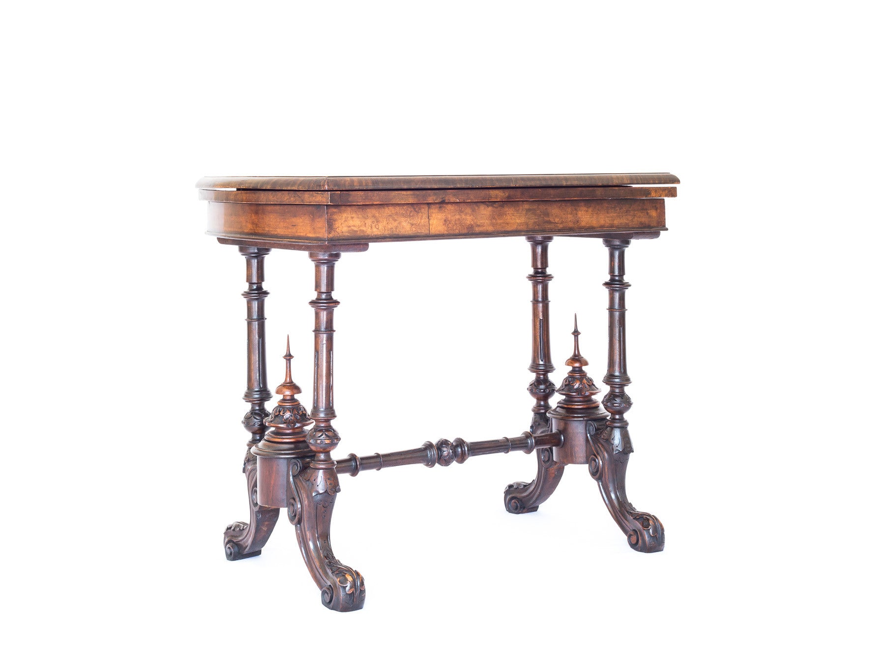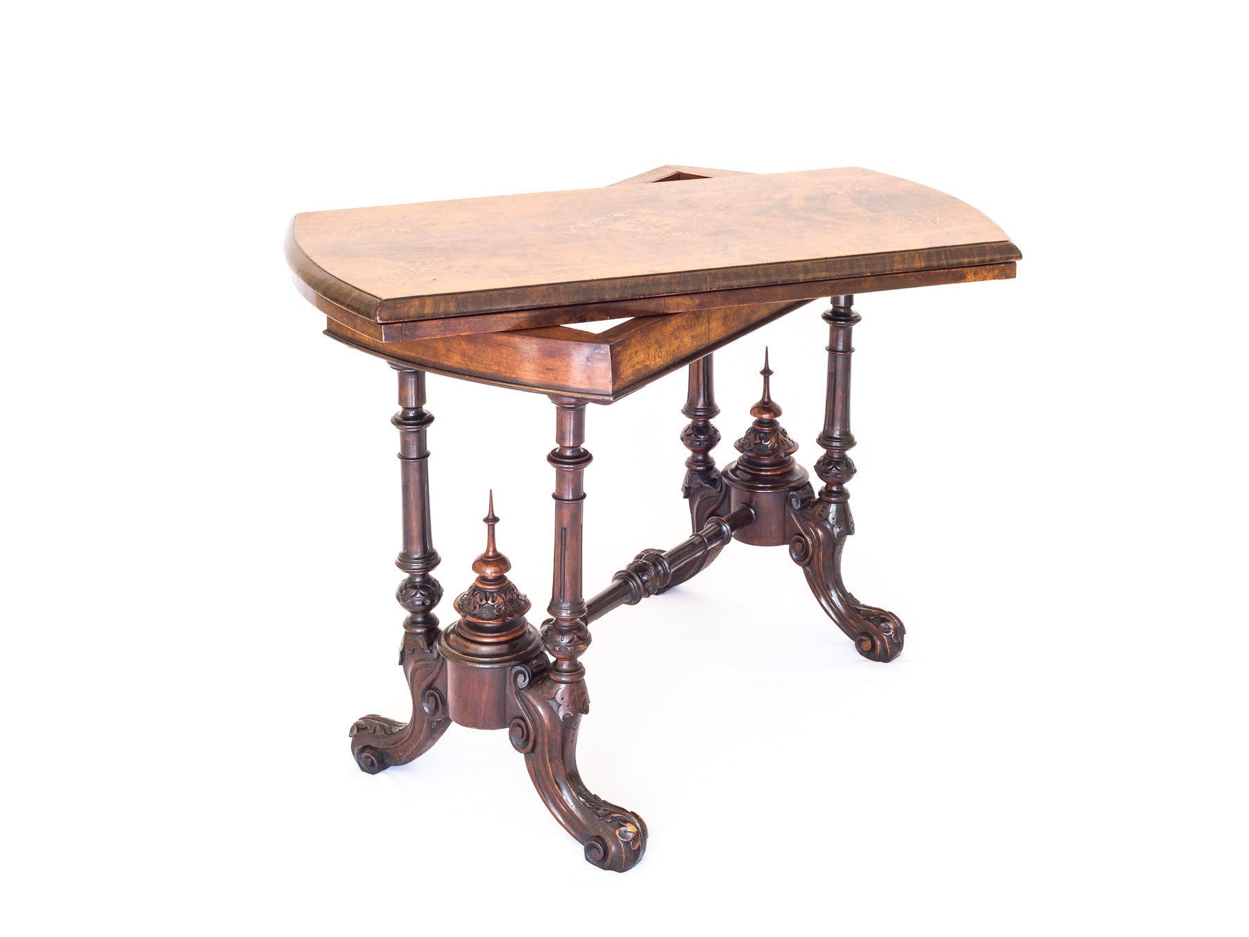A fine Victorian Fold-over Card Table in Walnut and Burr Walnut veneer, decorated with Marquetry Inlay to the top, c. 1860.