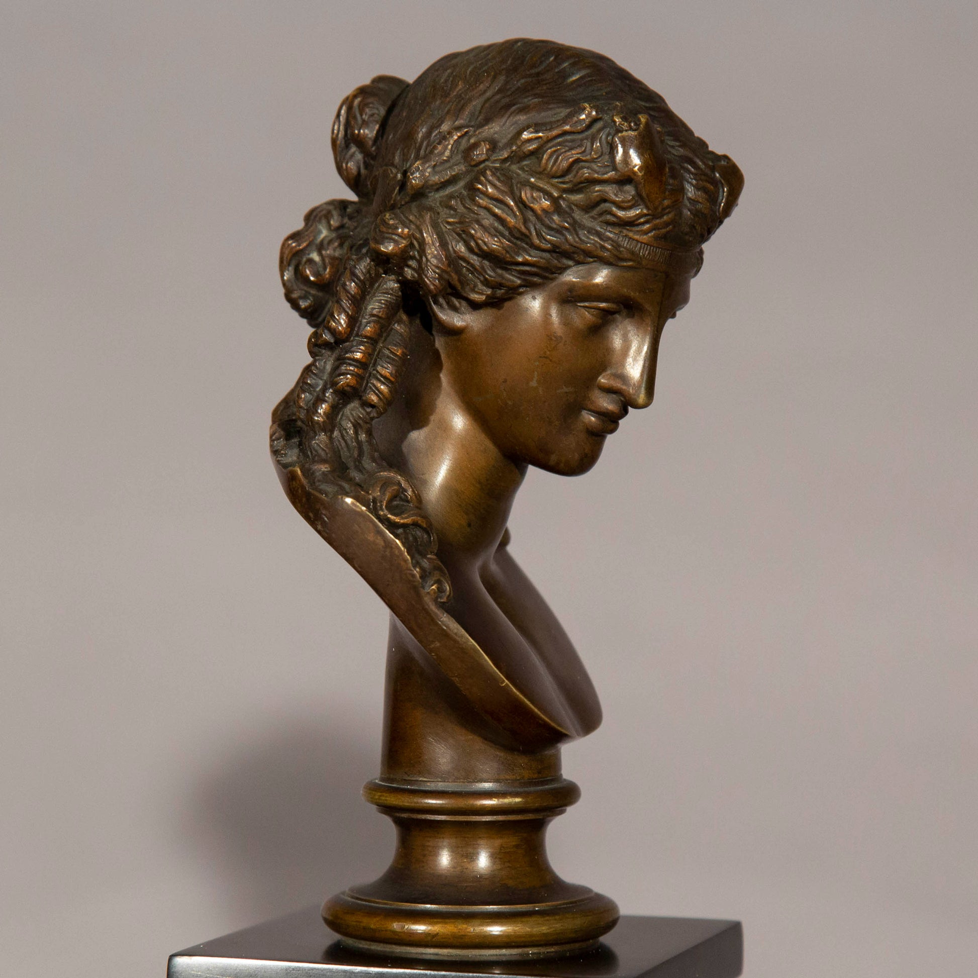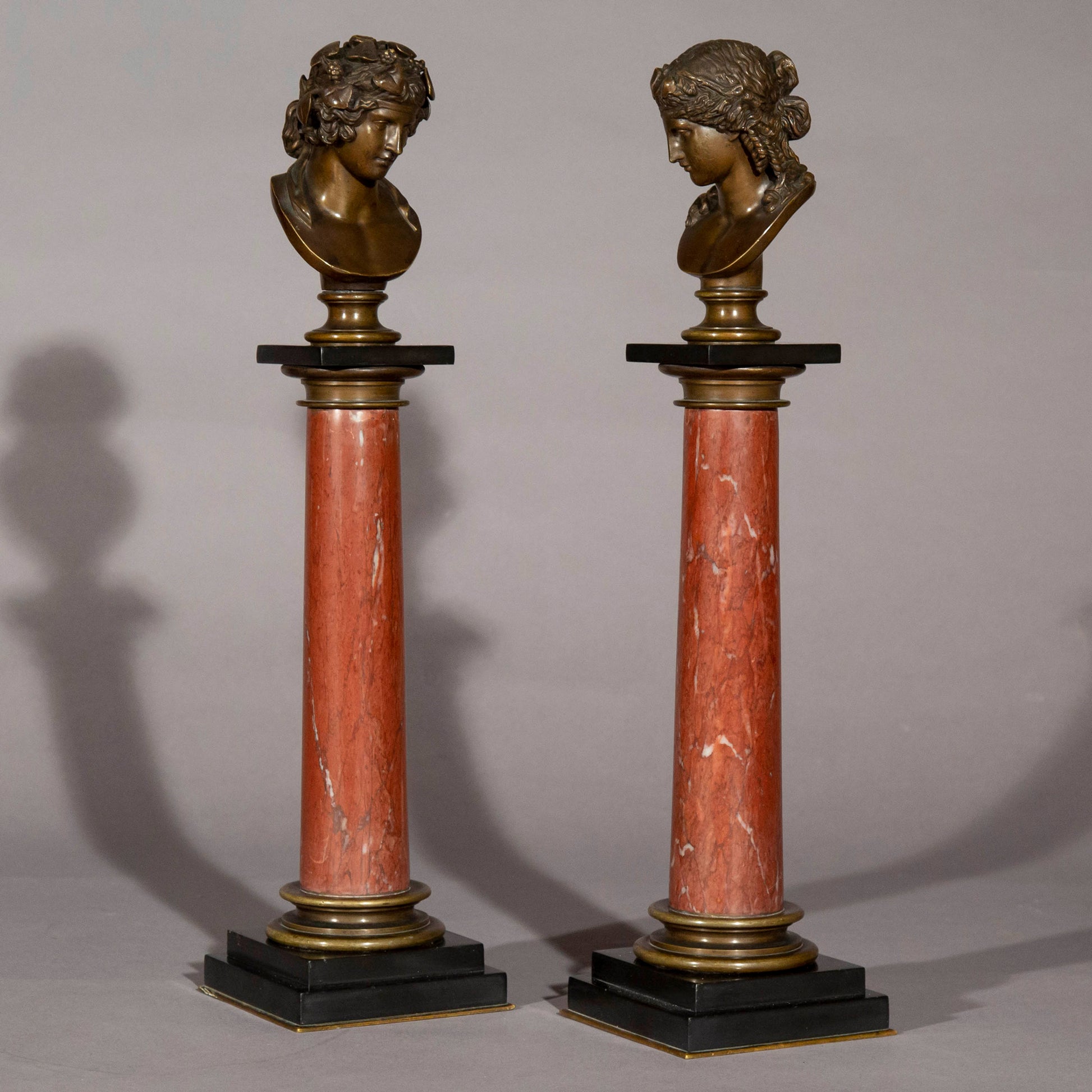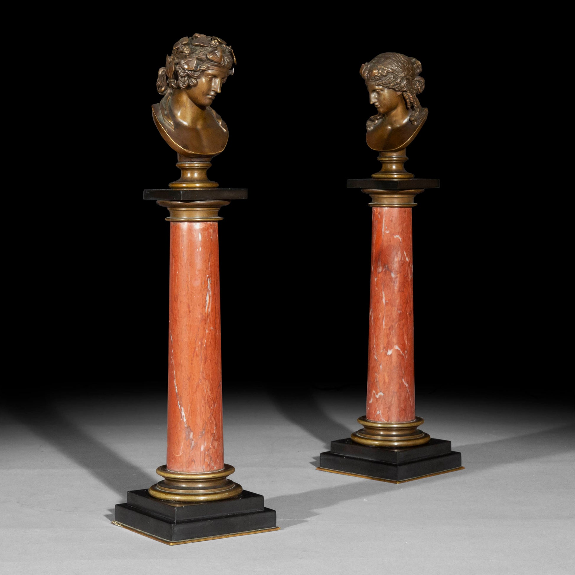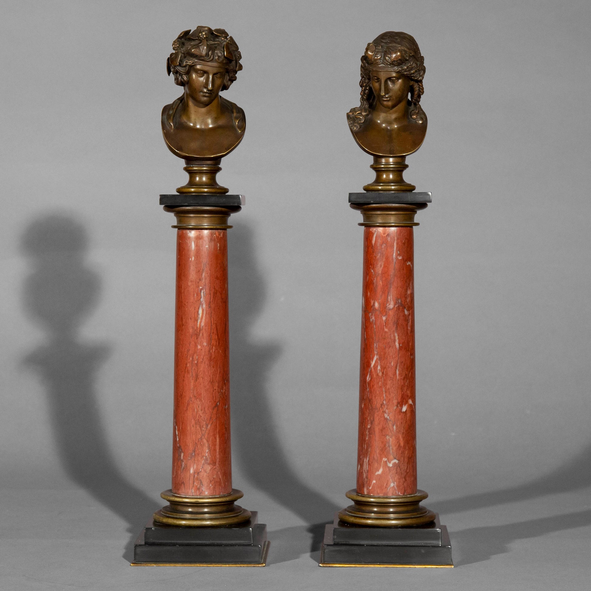 An exquisite pair of 'Grand Tour' bronze busts, one after the Lansdowne Antinous (modelled as Bacchus), the other one after the Capitoline Dionysus (Bacchus); on marble columns, by Georges Émile Henri Servant