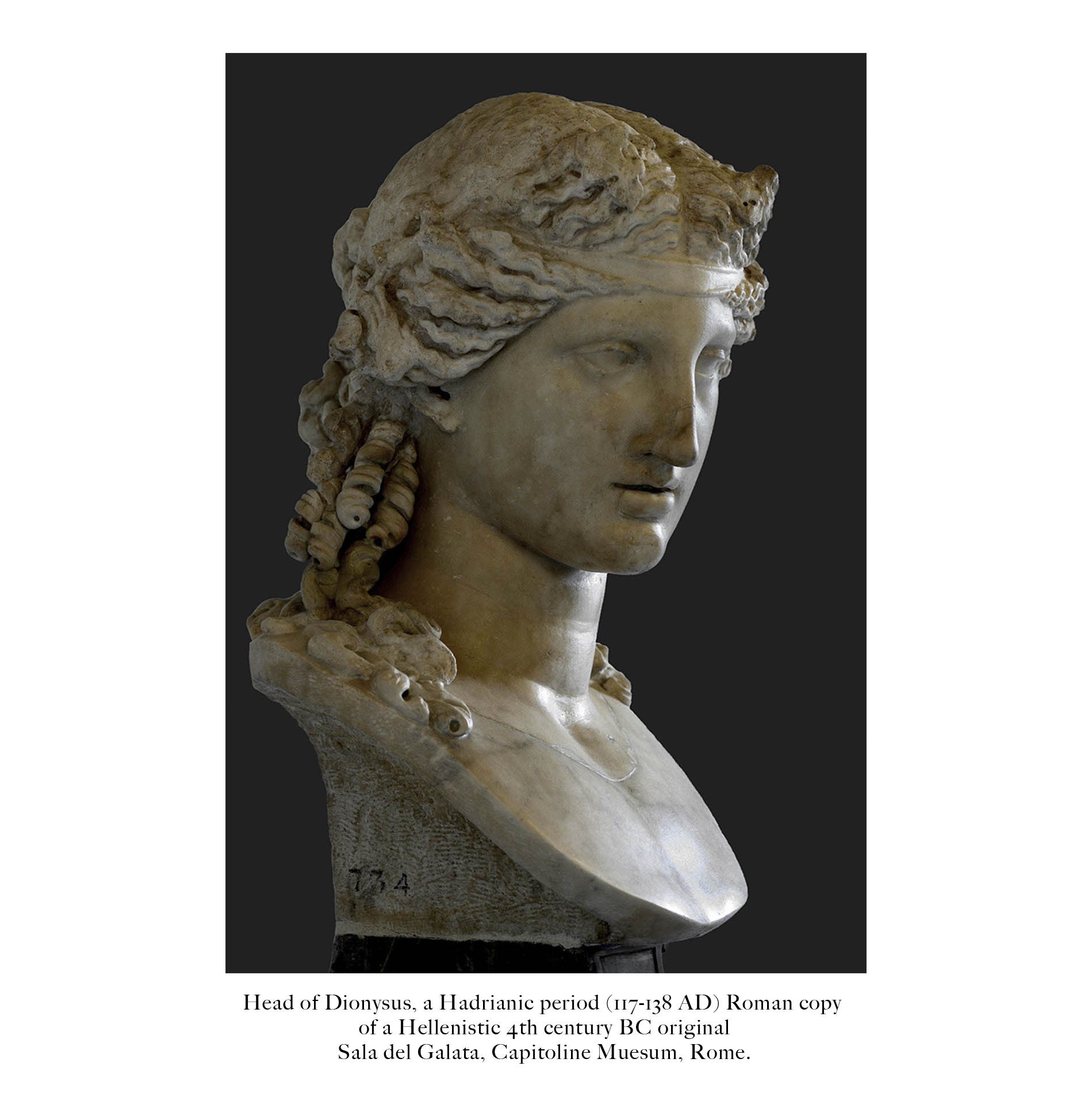 The model for the other bust is known as the Lansdowne Antinous, found at Hadrian’s Villa near Rome in 1769, now in the Fitzwilliam Museum, Cambridge. Antinous, from the province of Bithynia on the Black Sea coast, was the beloved companion of the Roman Emperor Hadrian, and in October 130 CE he drowned in the River Nile. Hadrian was grief-stricken and, soon after, he declared that the youth had been reborn as a god. In death, as in life, Antinous’ appeal lay in his youth and beauty, and his face became one of the best known in the Roman world. The handsome, sensual features of this statue – with its round face, almond eyes, strong brows, full lips and thick, tousled hair – are found on many other representations from all over Hadrian’s empire. In art Antinous was often assimilated with other, more traditional gods. Sometimes he is represented as Apollo, sometimes as Dionysos (Bacchus). The identification between Dionysos and Antinous went beyond the visual. Like the Greek wine god, Antinous was believed to have died and been reborn.