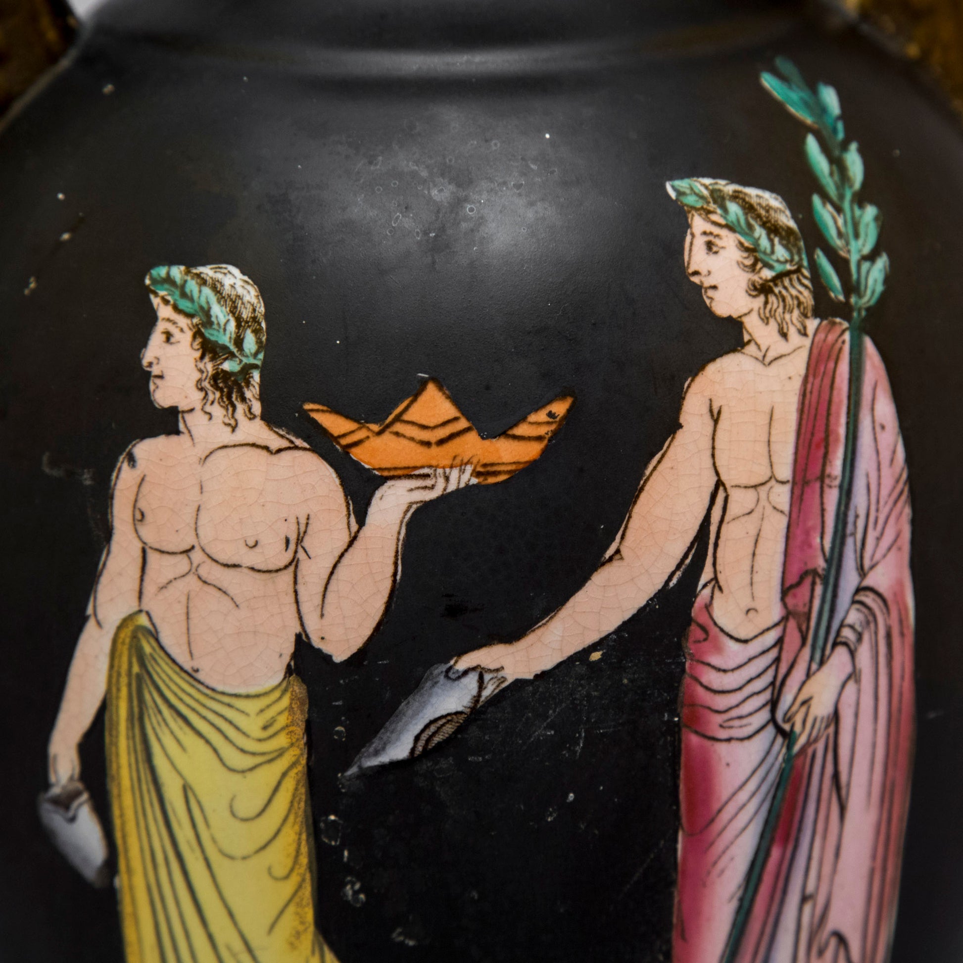 A charming late 19th - early 20th century porcelain vase, polychrome decorated in ancient Greek style, measuring 30 cm tall.