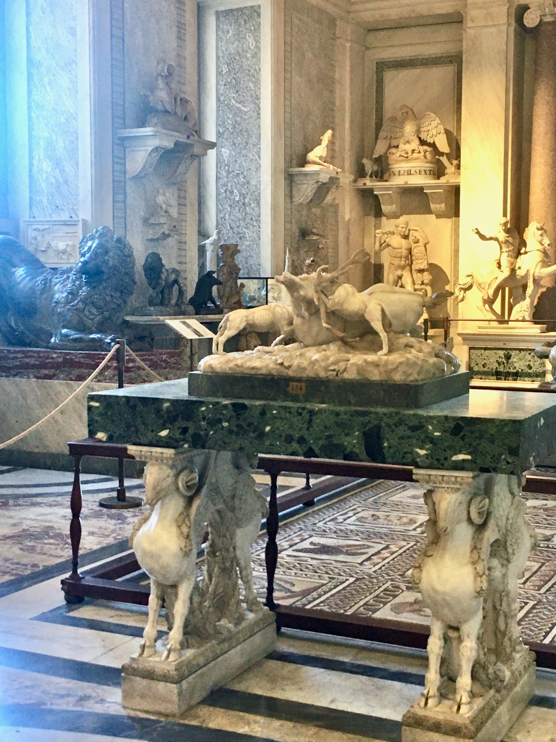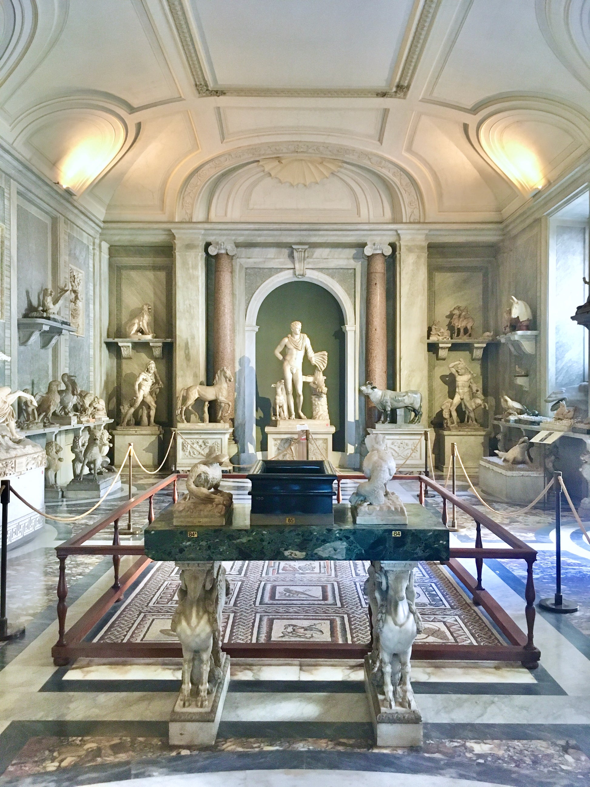 The Galleria degli Animali, or Hall of Animals, was created during the papacy of Pius VI (1775–1799) as a “stone zoo” of sorts, using ancient sculptures that were often restored and occasionally reimagined. This ambitious project brought together prominent artists of the 18th century, including Francesco Antonio Franzoni from Carrara. The artworks in this space reflect themes of nature and hunting, with coloured marbles chosen to suggest the textures and colours of animal fur, feathers, or to create eye-catching contrasts.