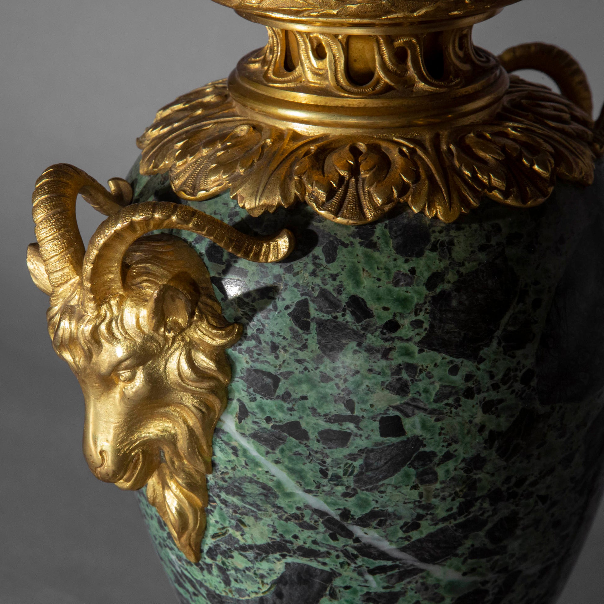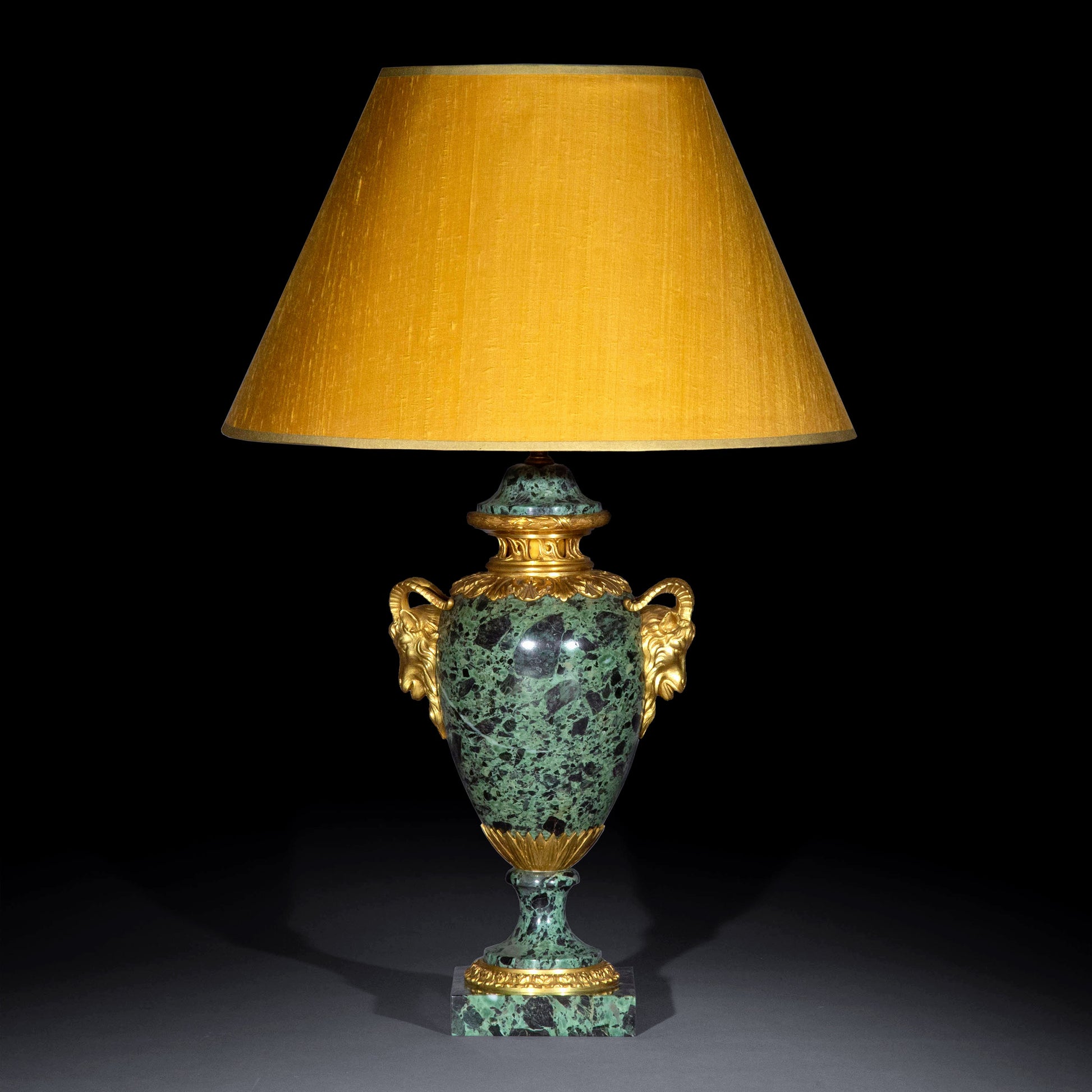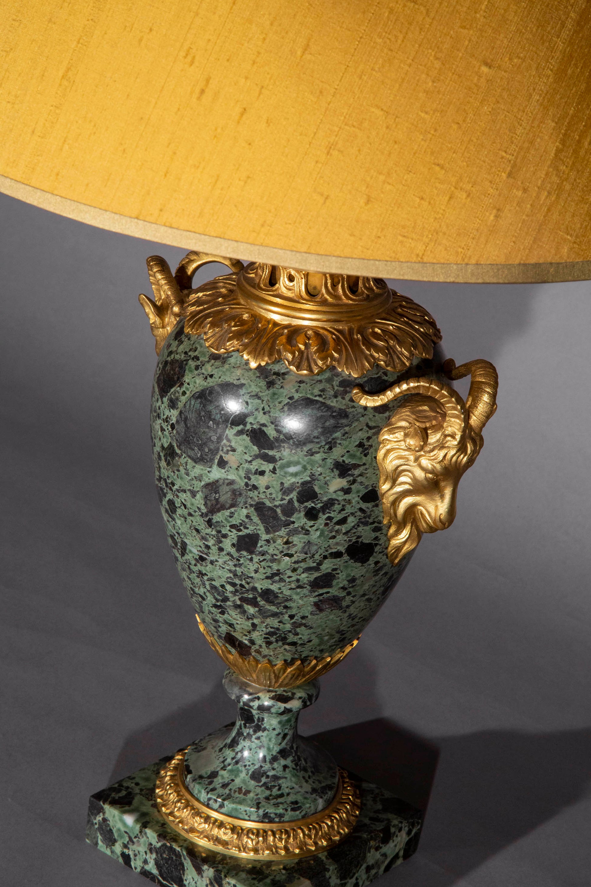A superb quality gilt bronze mounted urn in Verde Antico marble, now fitted as a table lamp. France or Italy, late 19th – early 20th century.