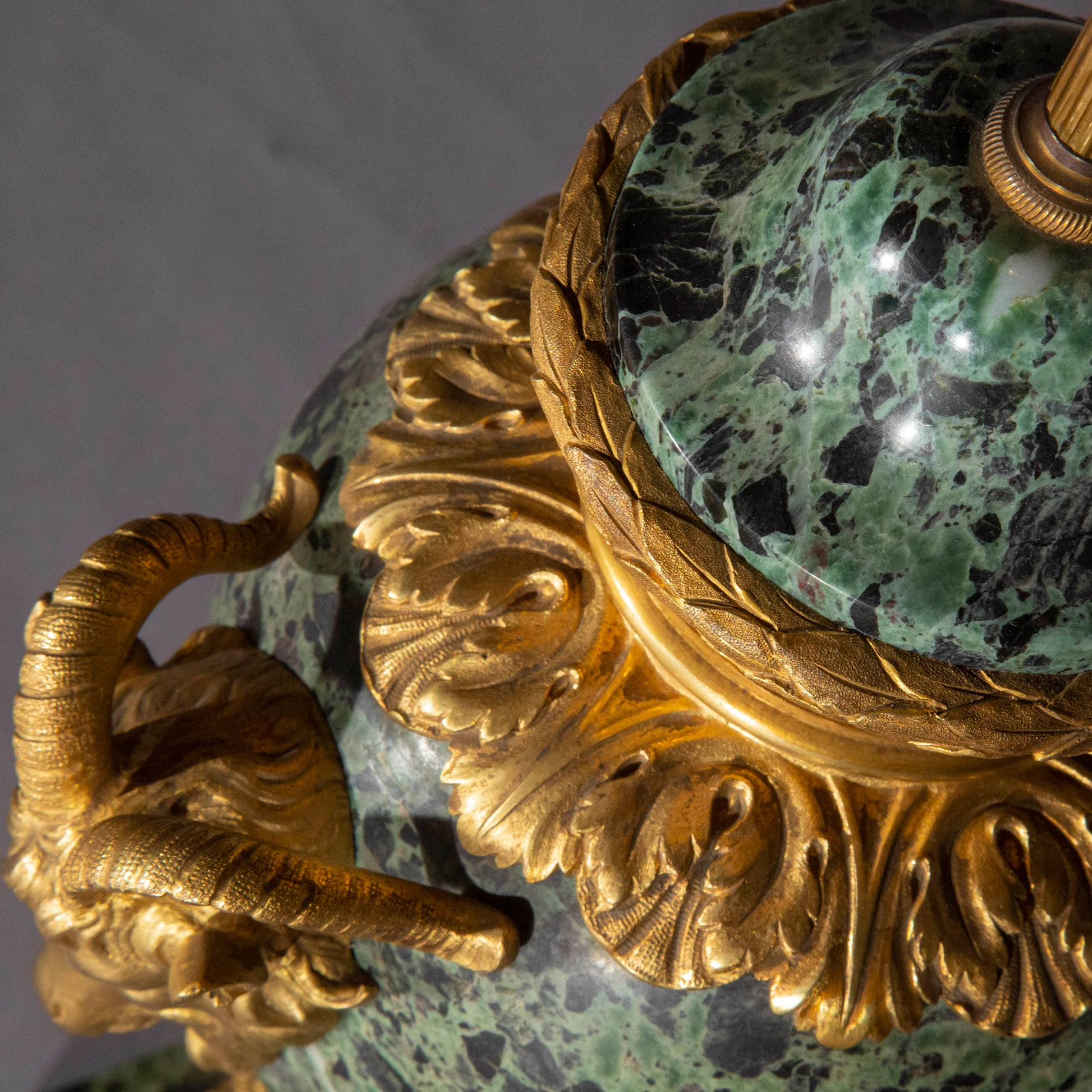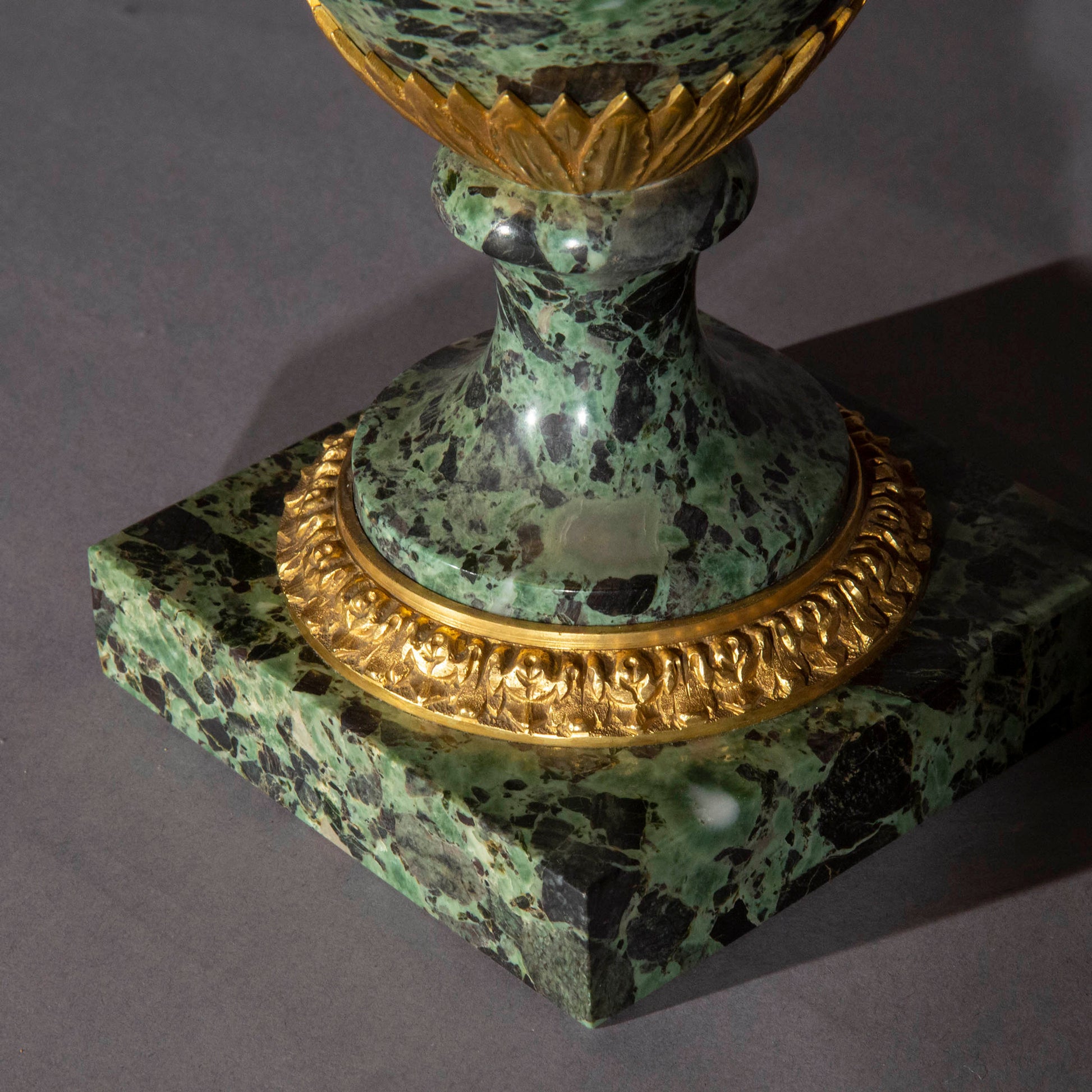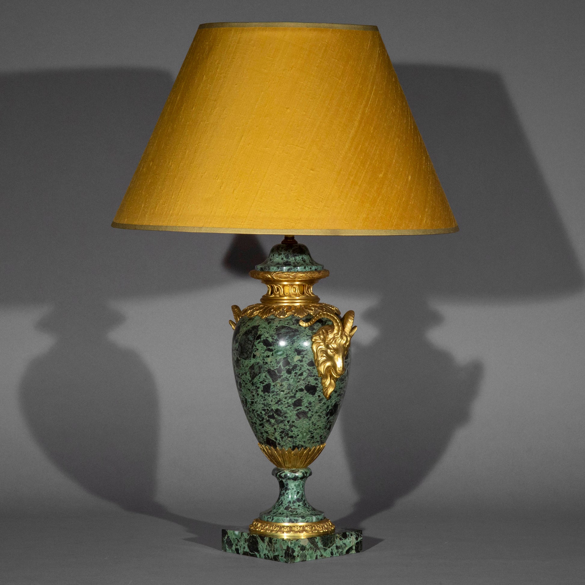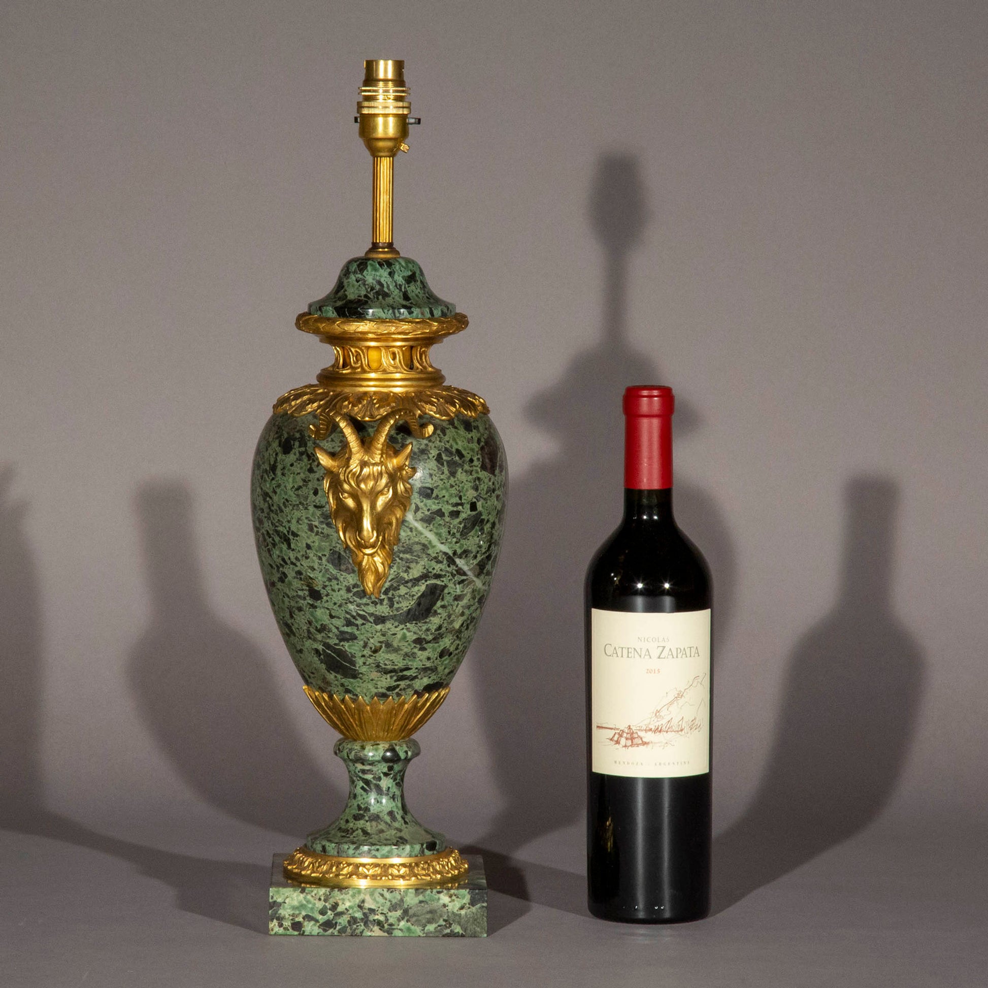 A superb quality gilt bronze mounted urn in Verde Antico marble, now fitted as a table lamp. France or Italy, late 19th – early 20th century.