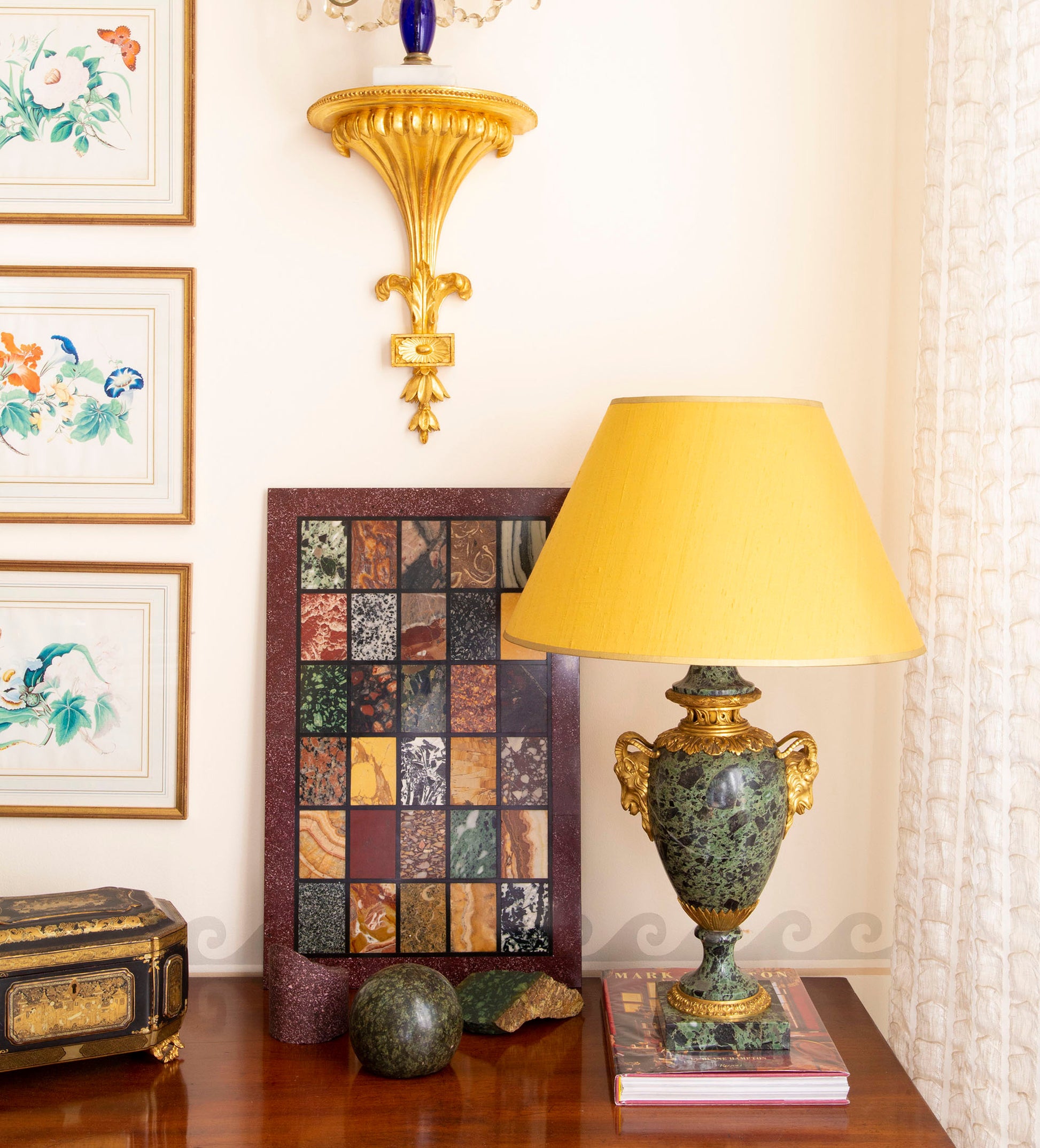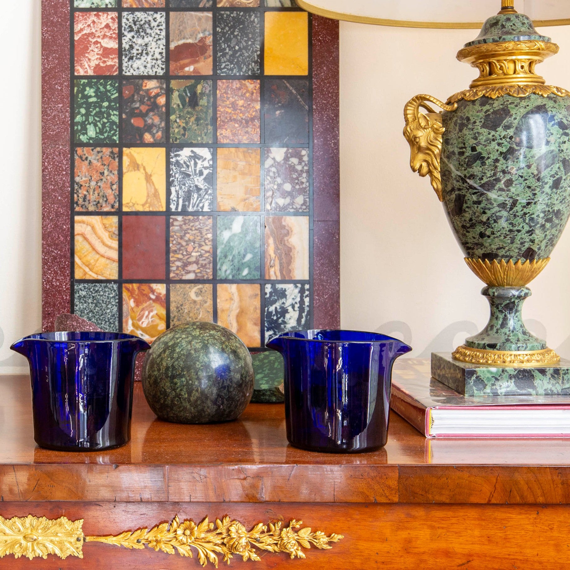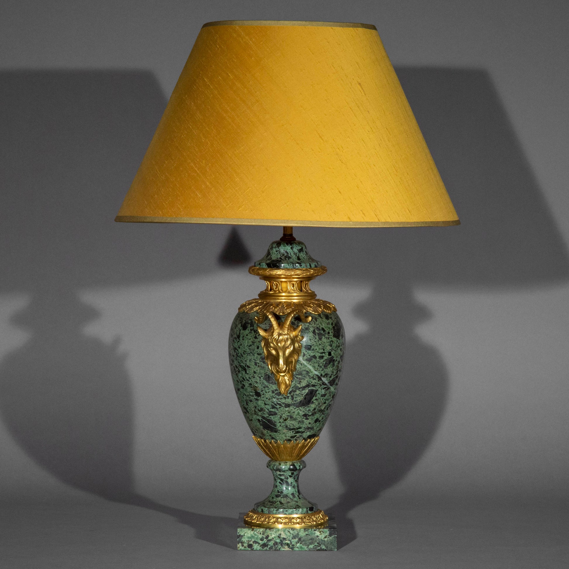 Combining Verde Antico marble with high-quality gilt bronze accents, this lamp is a distinctive piece that brings historical character and timeless appeal to any space.