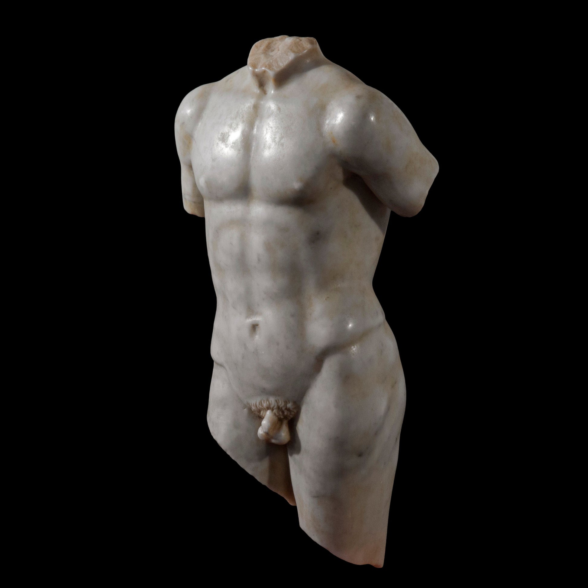 The form and details of the present example recall the Westmacott Ephebe, now in the British Museum, which is considered a Roman copy of a late 5th century B.C. original by Polykleitos. The type served as the inspiration for numerous variants during the Roman Period, with the addition of differing attributes changing the subject.