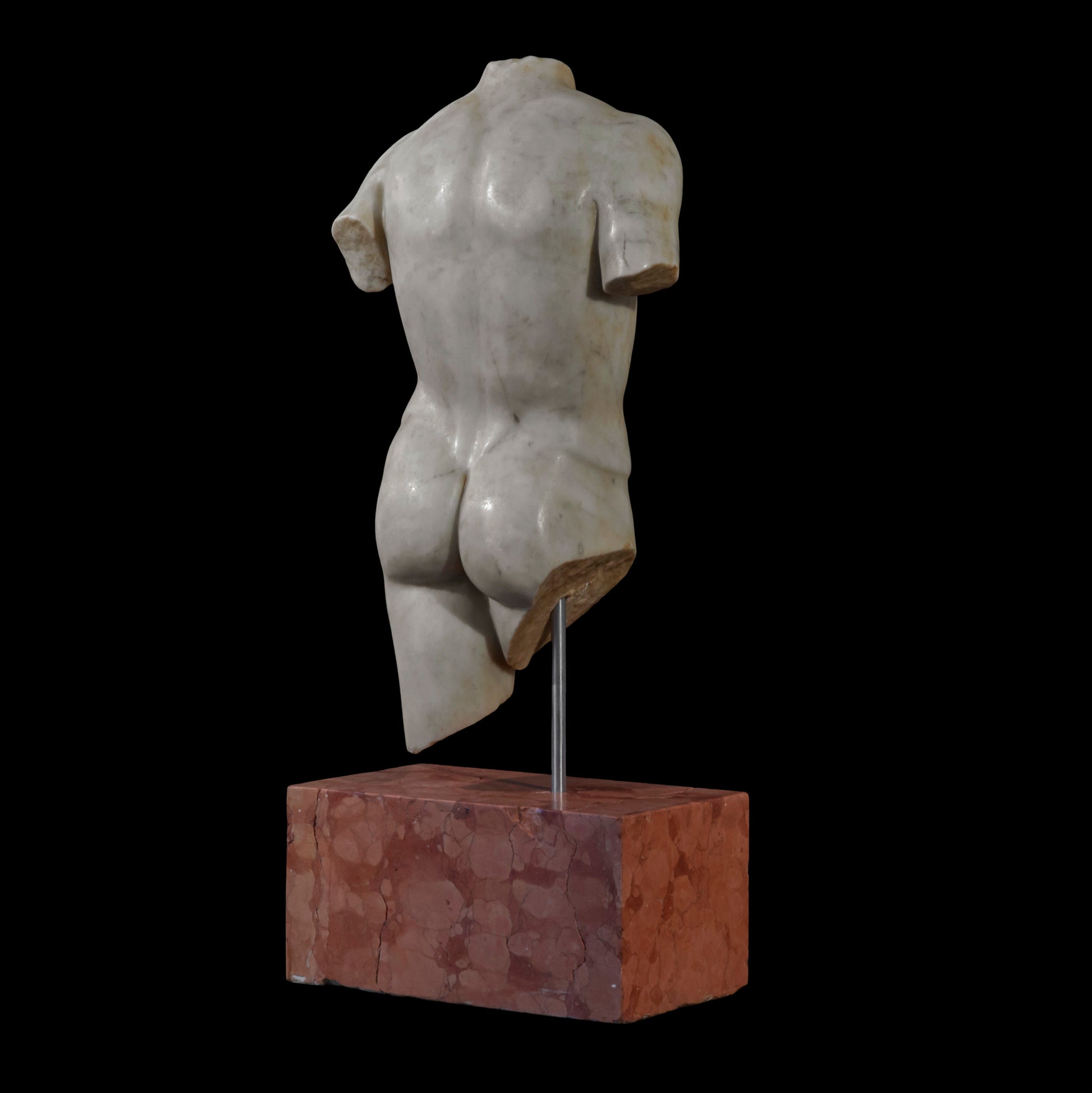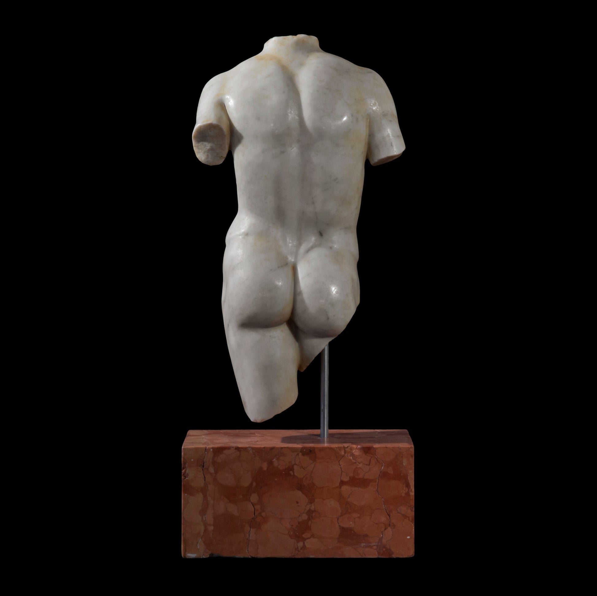 A delightfully detailed nude figure of a youthful athlete, finely sculpted Carrara marble in the ancient Greek or Roman style, mounted on a Rosso Verona base.
