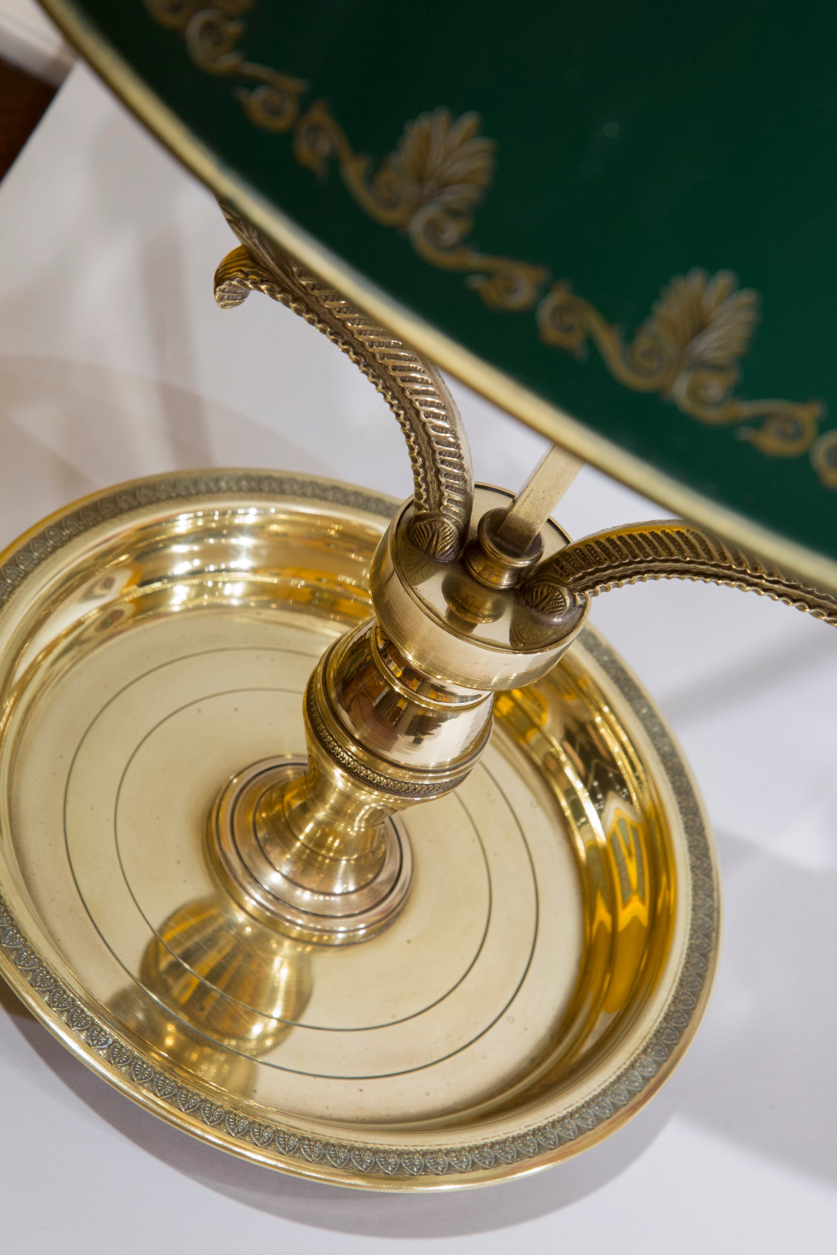 A large, superb quality Bouillotte table lamp, in solid brass, with adjustable green tole shade, measuring 27" / 69 cm high. 20th century.