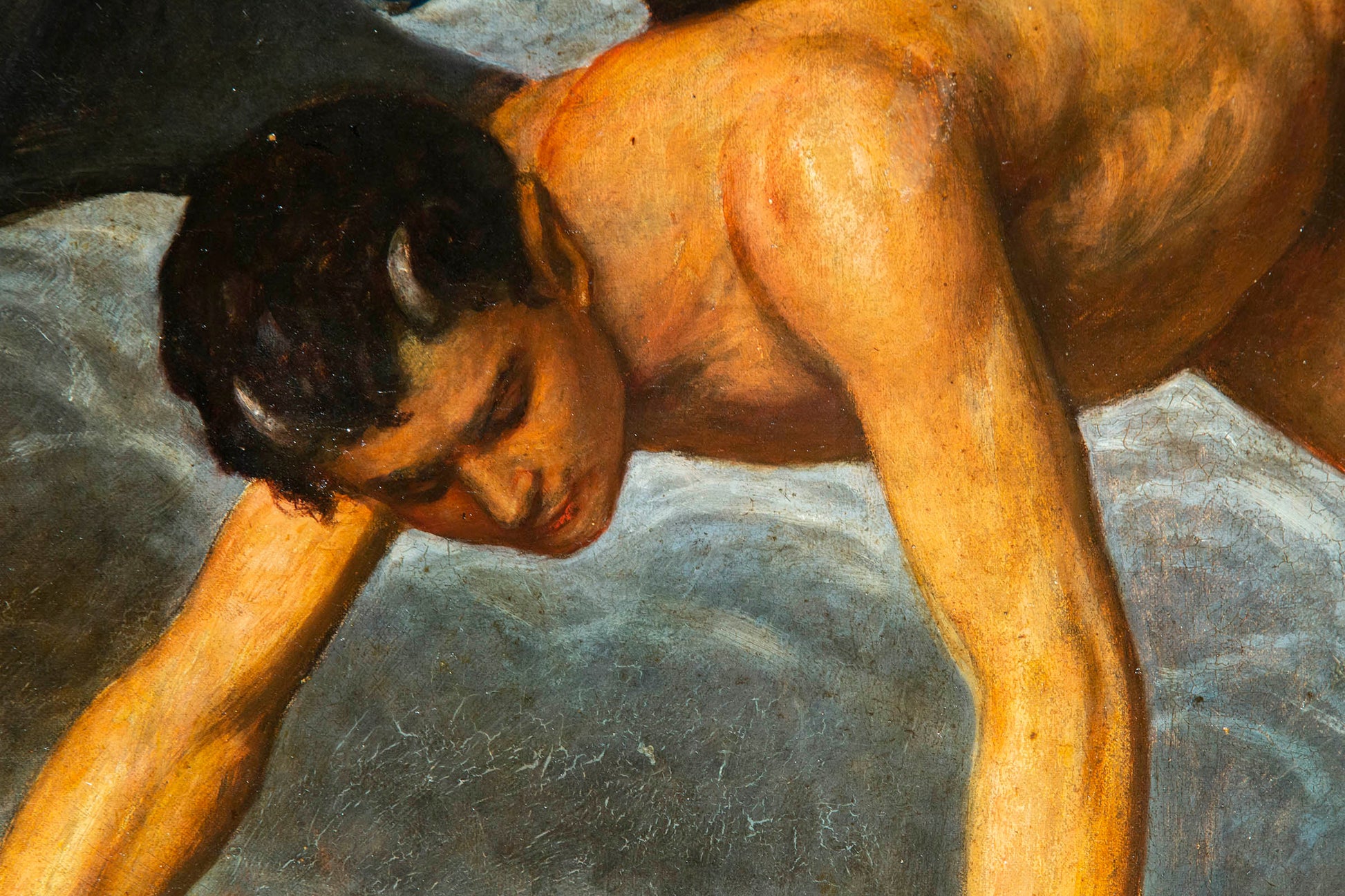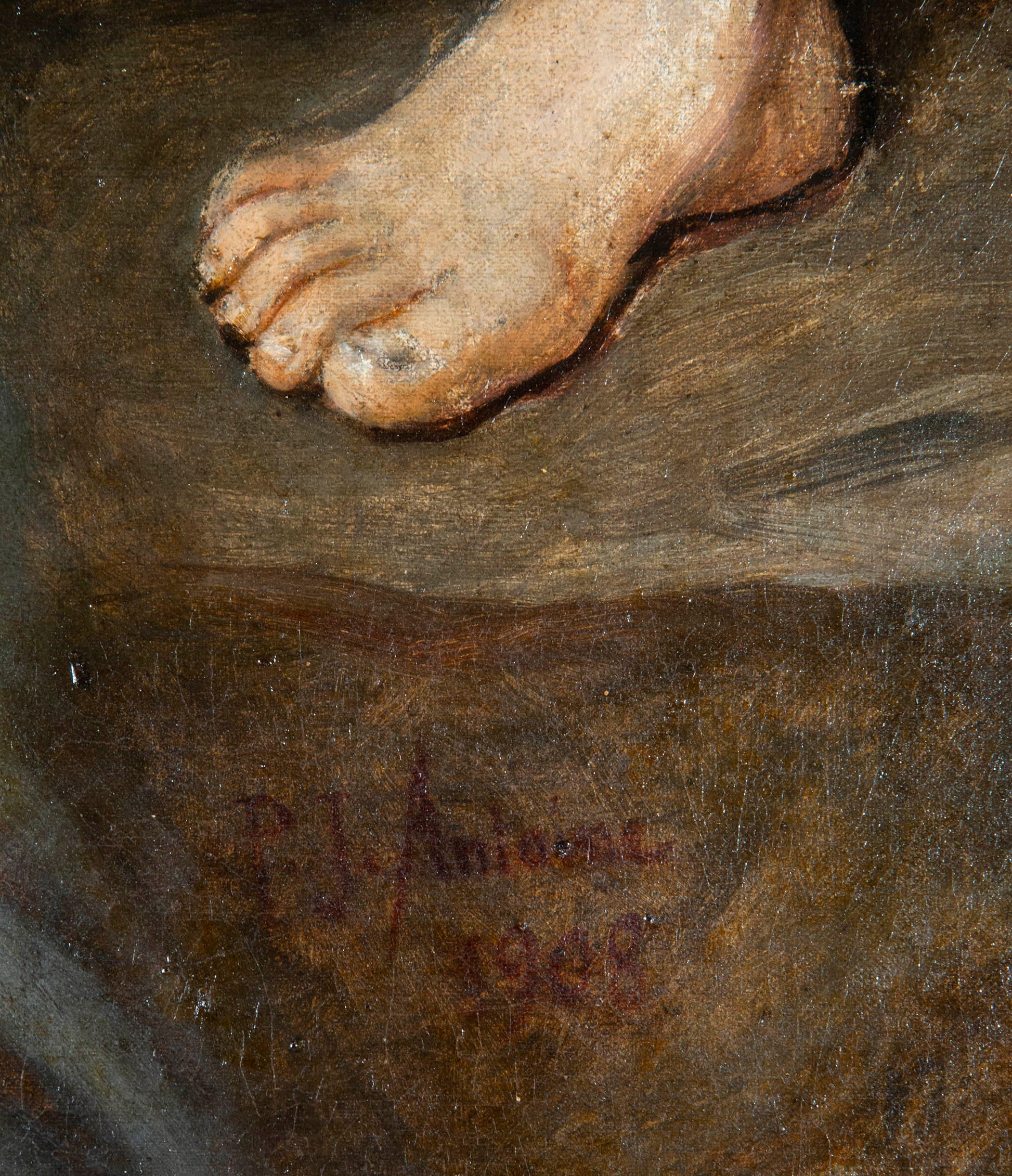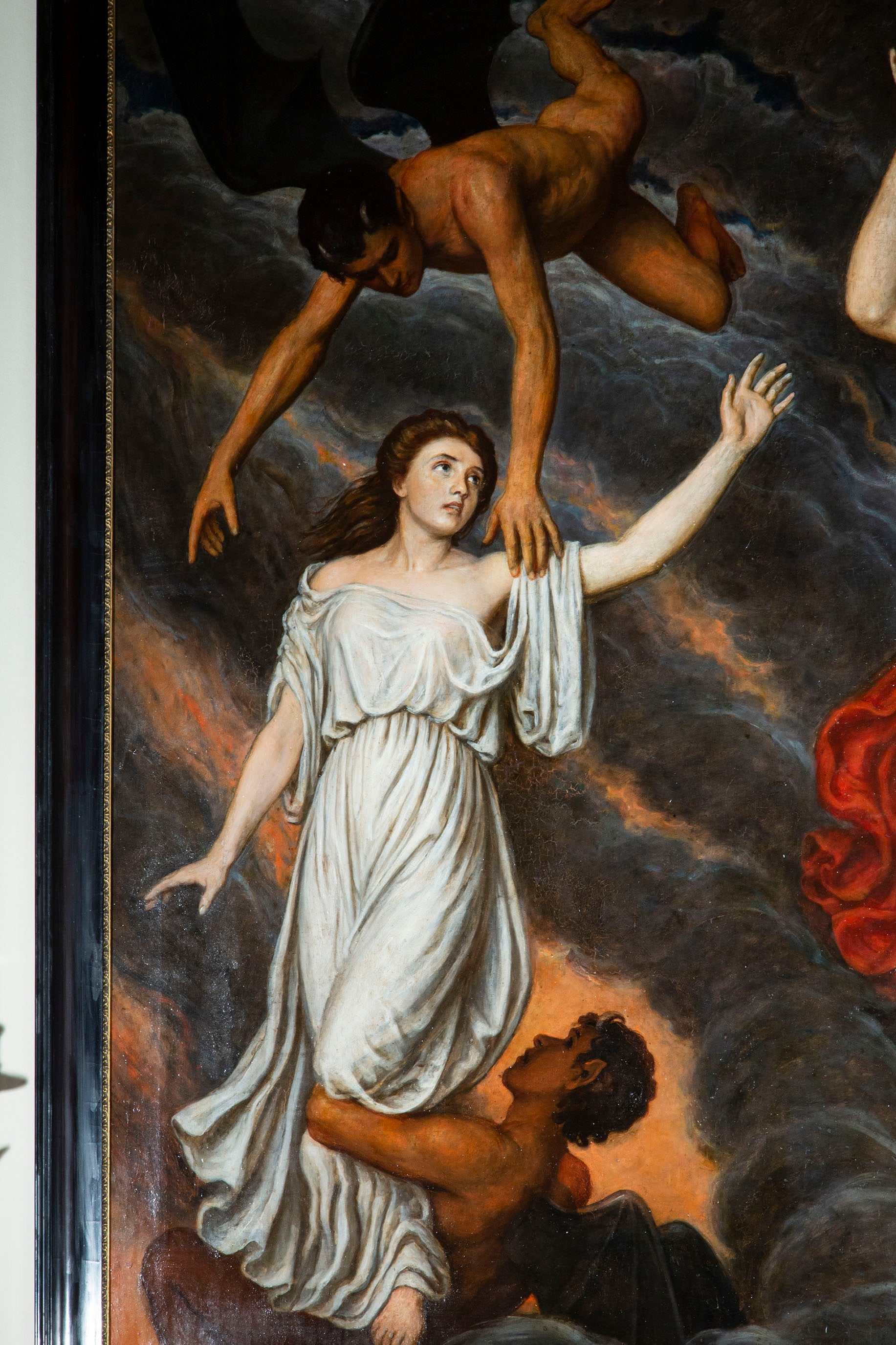 A large scale oil painting of Orpheus and Eurydice, in its original ebonised frame, signed P.J.Antoine.