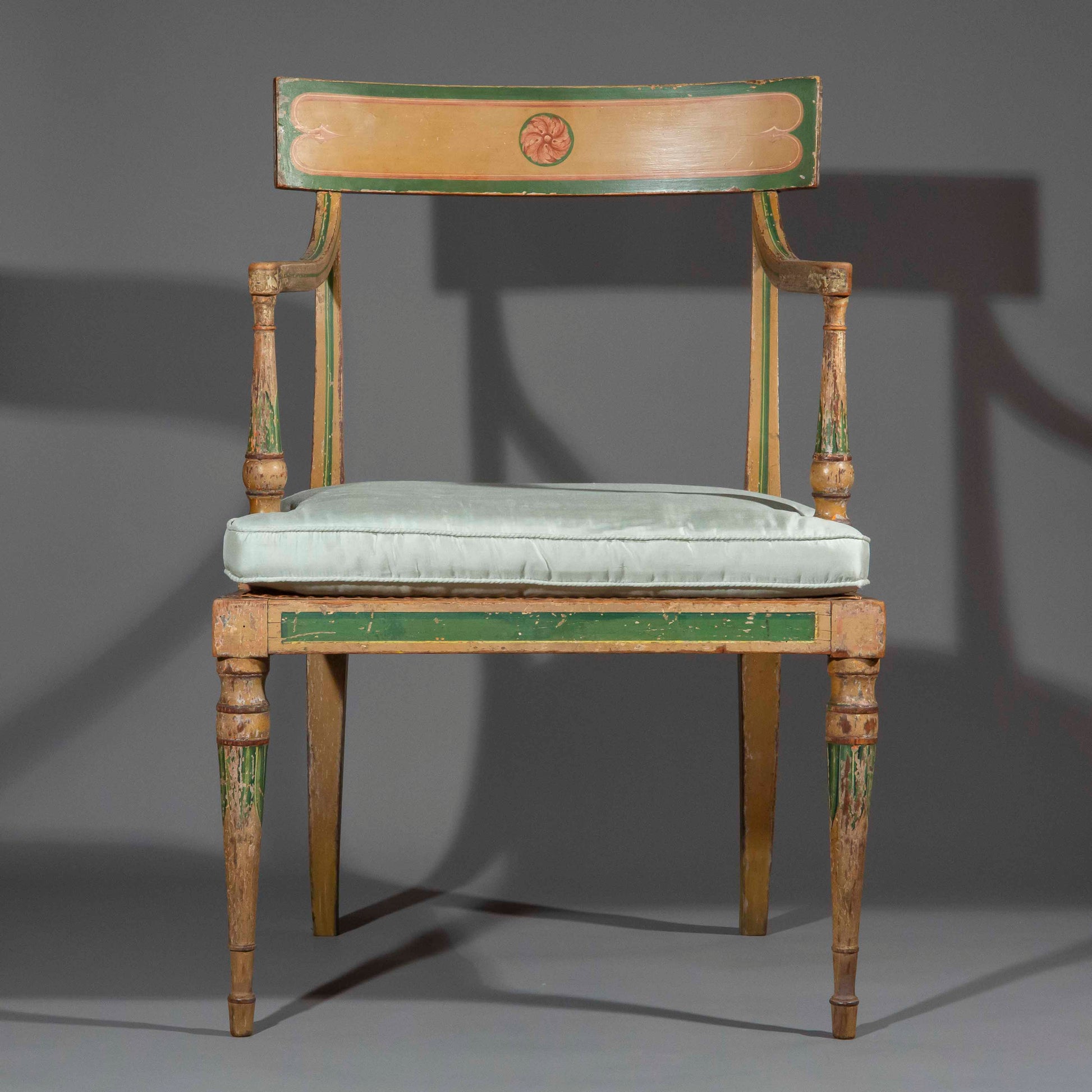 An elegant cream and green painted armchair of George III period, attributable to Gillows of Lancaster and London. England, circa 1800.