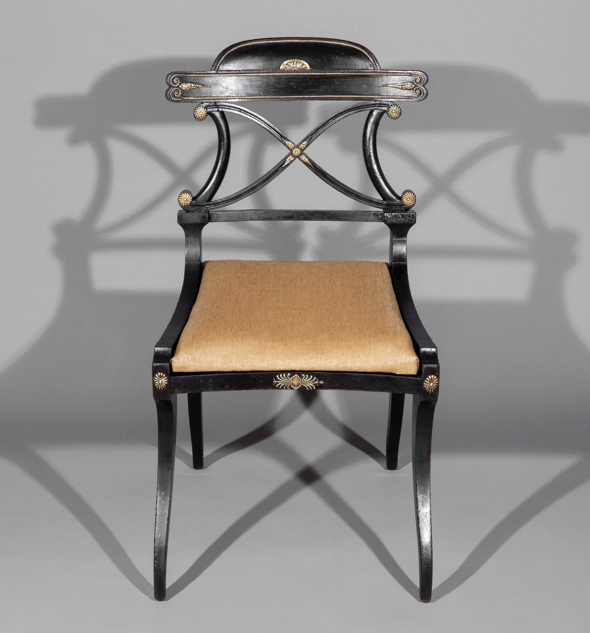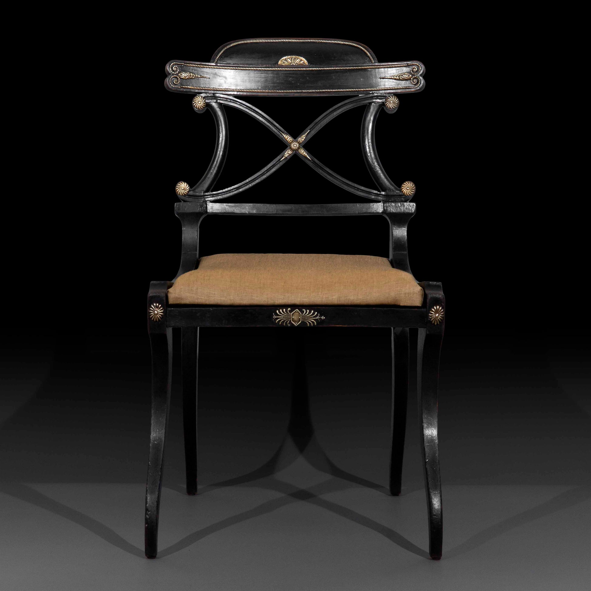 These handsome chairs, conceived in the Grecian manner, allude to Arcadia with their curved tablet backs, enriched with exquisite brass ornaments. Their distinctive, highly unusual profile with boldly curved legs and backs, is inspired by ancient Greek 'Klismos' chairs, often depicted on Attic pottery starting from circa 400BC. This design was promoted by the connoisseur-designer Thomas Hope (d. 1842) and popularised through the guide to his London mansion, Household Furniture and Interior Decoration, published in London in 1807.
