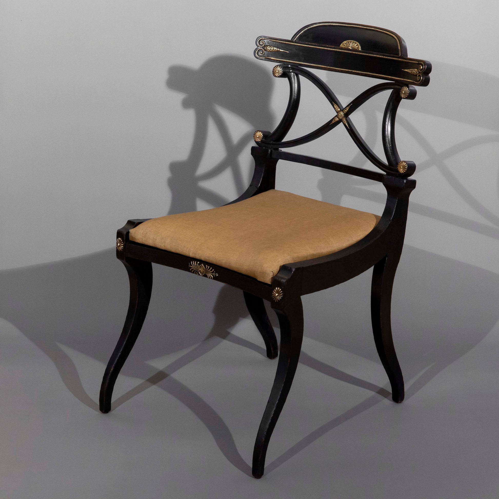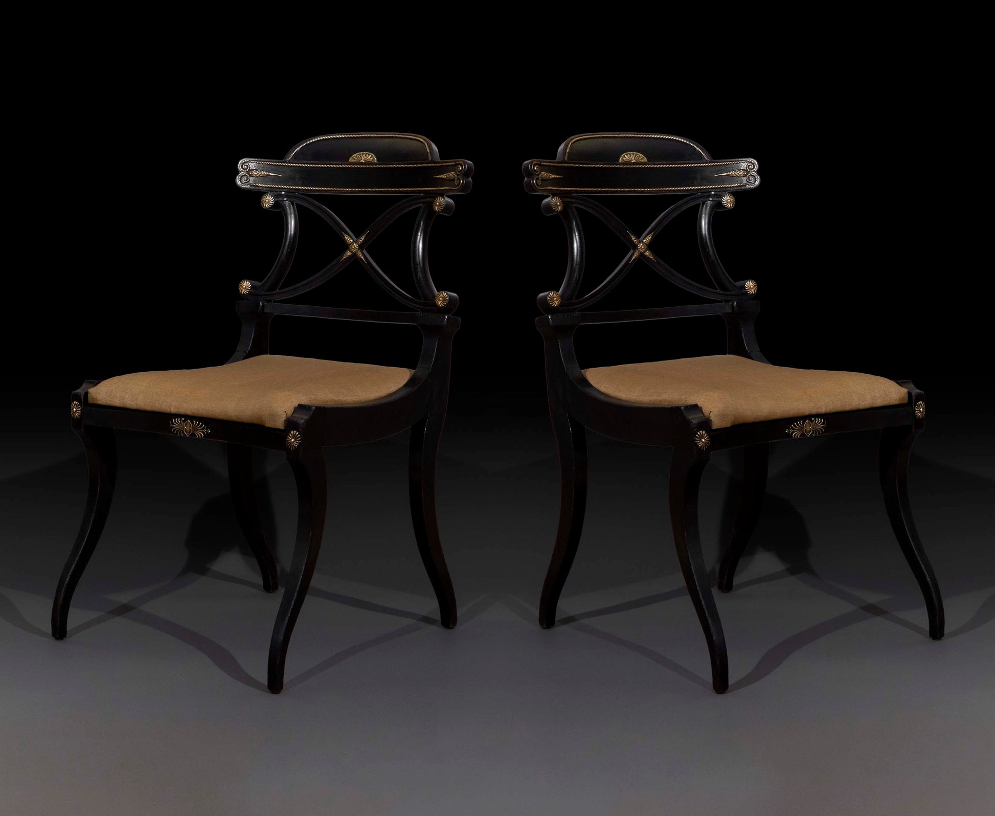 A rare and unusual pair of black painted ('ebonised') chairs, of exaggerated 'Klismos' form. England, circa 1810.
