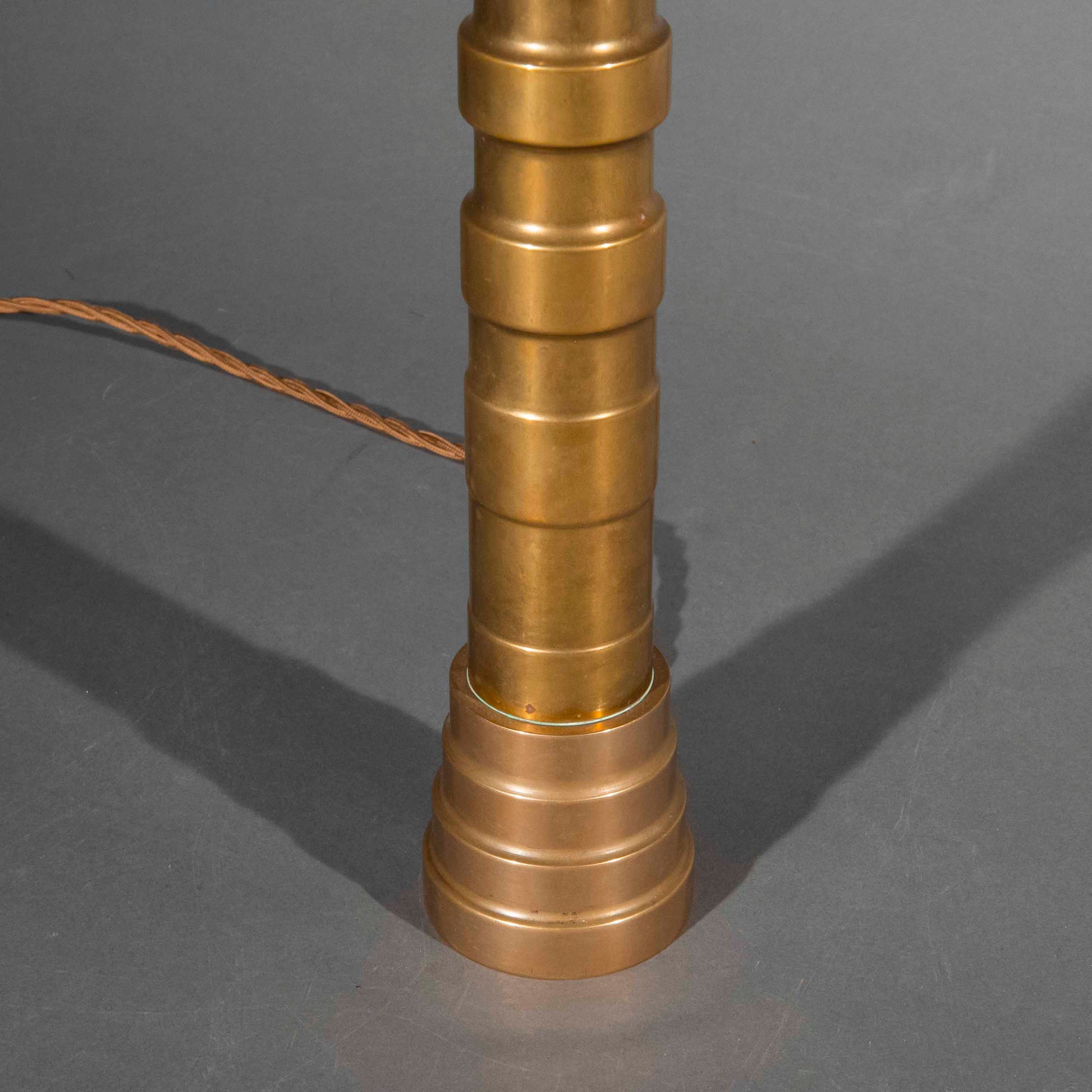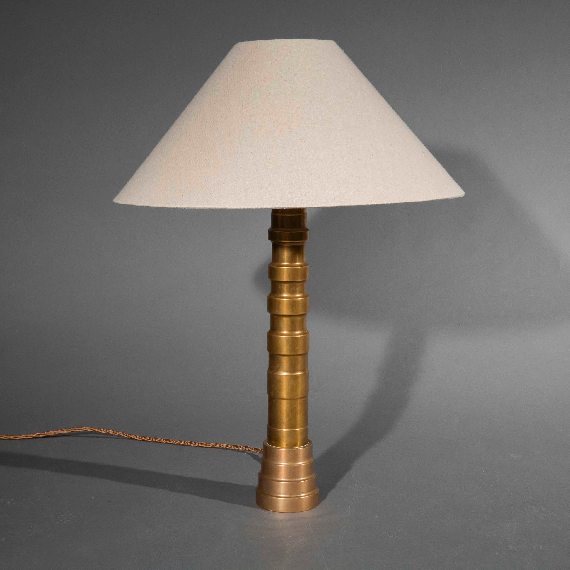 We love its unusual, boldly drawn shape, evoking the aesthetics of the 'Machine Age' of the 1920's and 1930's. Gently patinated surface. Extremely heavy, solid bronze table lamp of unique, timeless design.