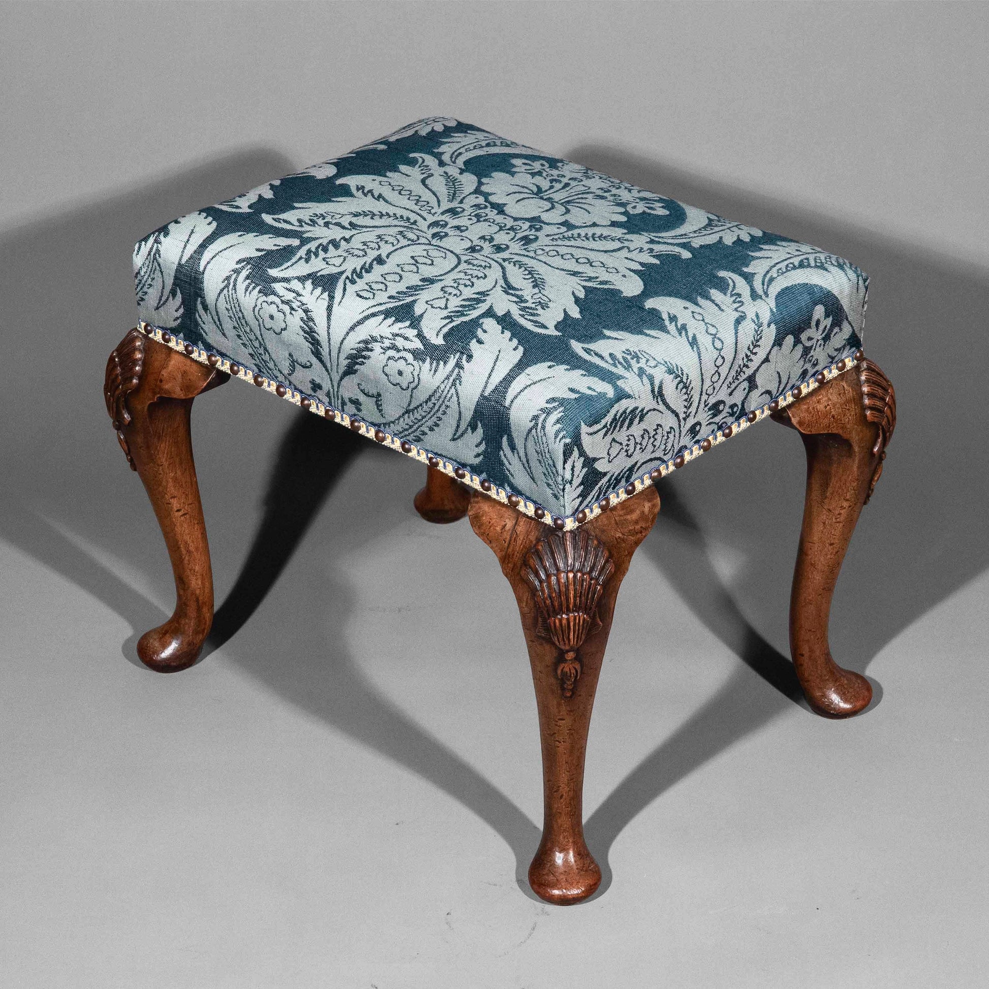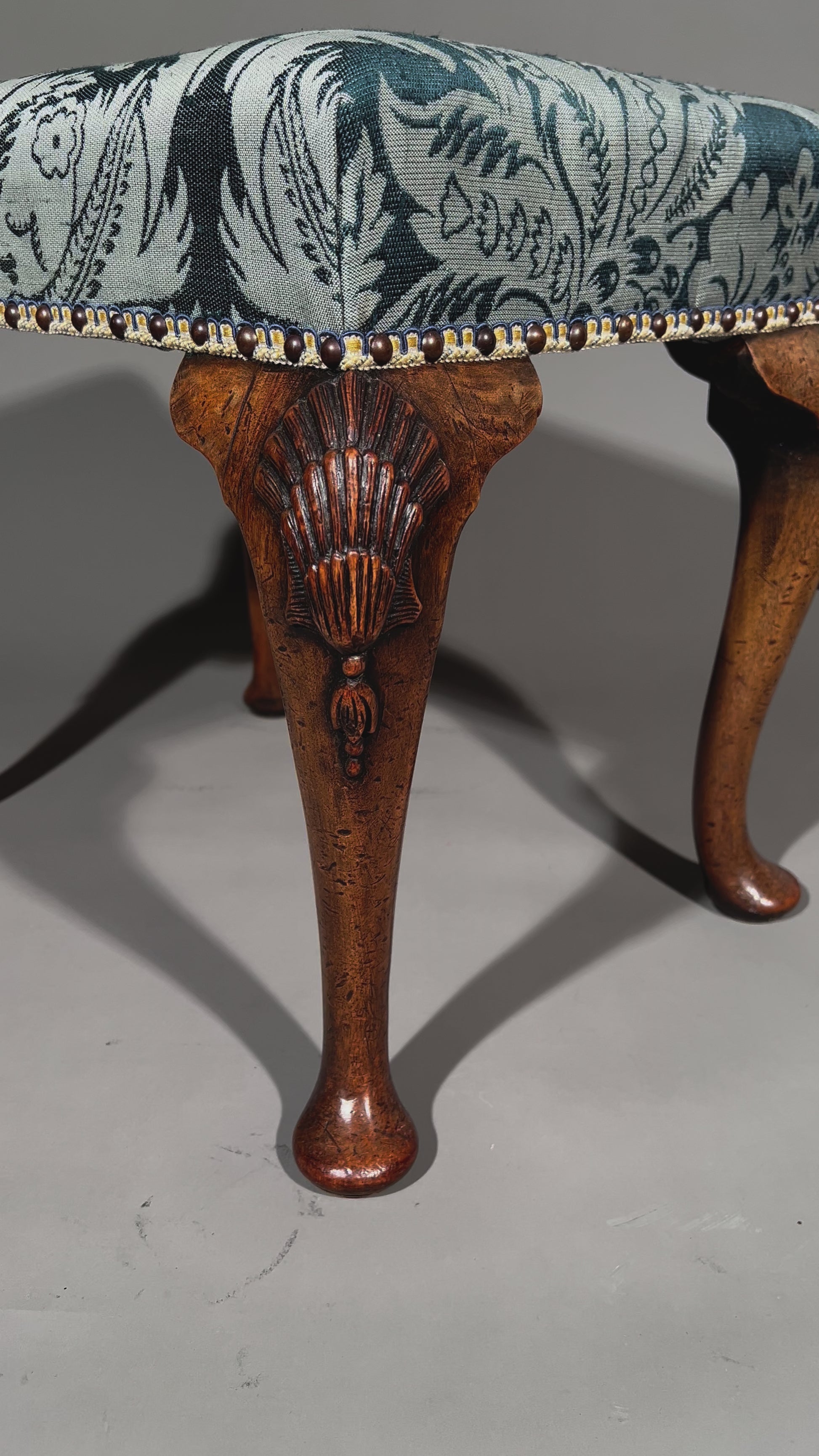 An elegant walnut stool or bench in the Queen Anne style, raised on finely carved cabriole legs with carved shells to the knees and with seat covered blue silk damask. England, circa 1920's.