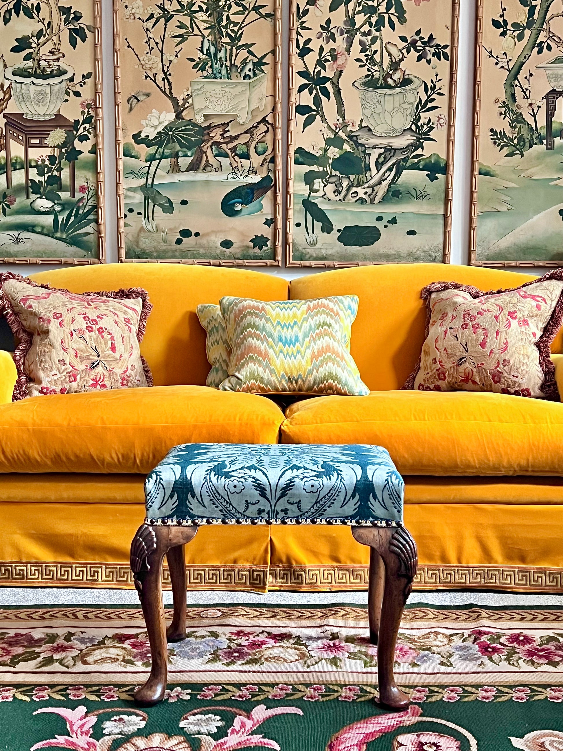 We chose a blue silk damask for the upholstery as we feel it is one of the best choices for this particular stool. The large acanthus leaf pattern creates a sense of movement across the surface, almost dancing as the light changes. The blue itself is a lovely, clear shade — evocative of a blue ocean, while the silvery highlights give the fabric a subtle depth. To complete the appearance, the studs, like a string of pearls, have been spaced with precision along the edge, adding an elegant, understated finish.