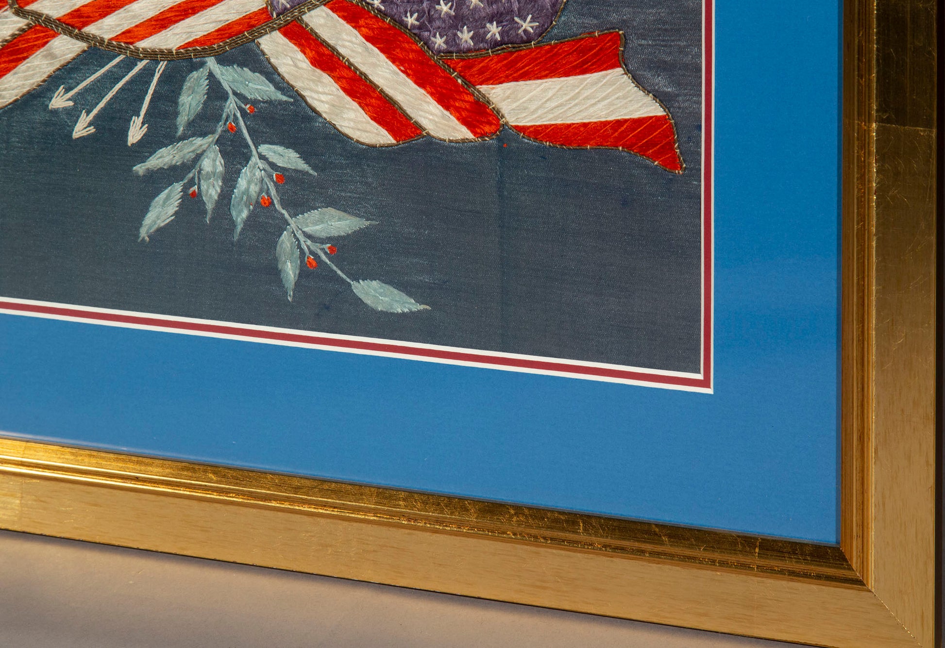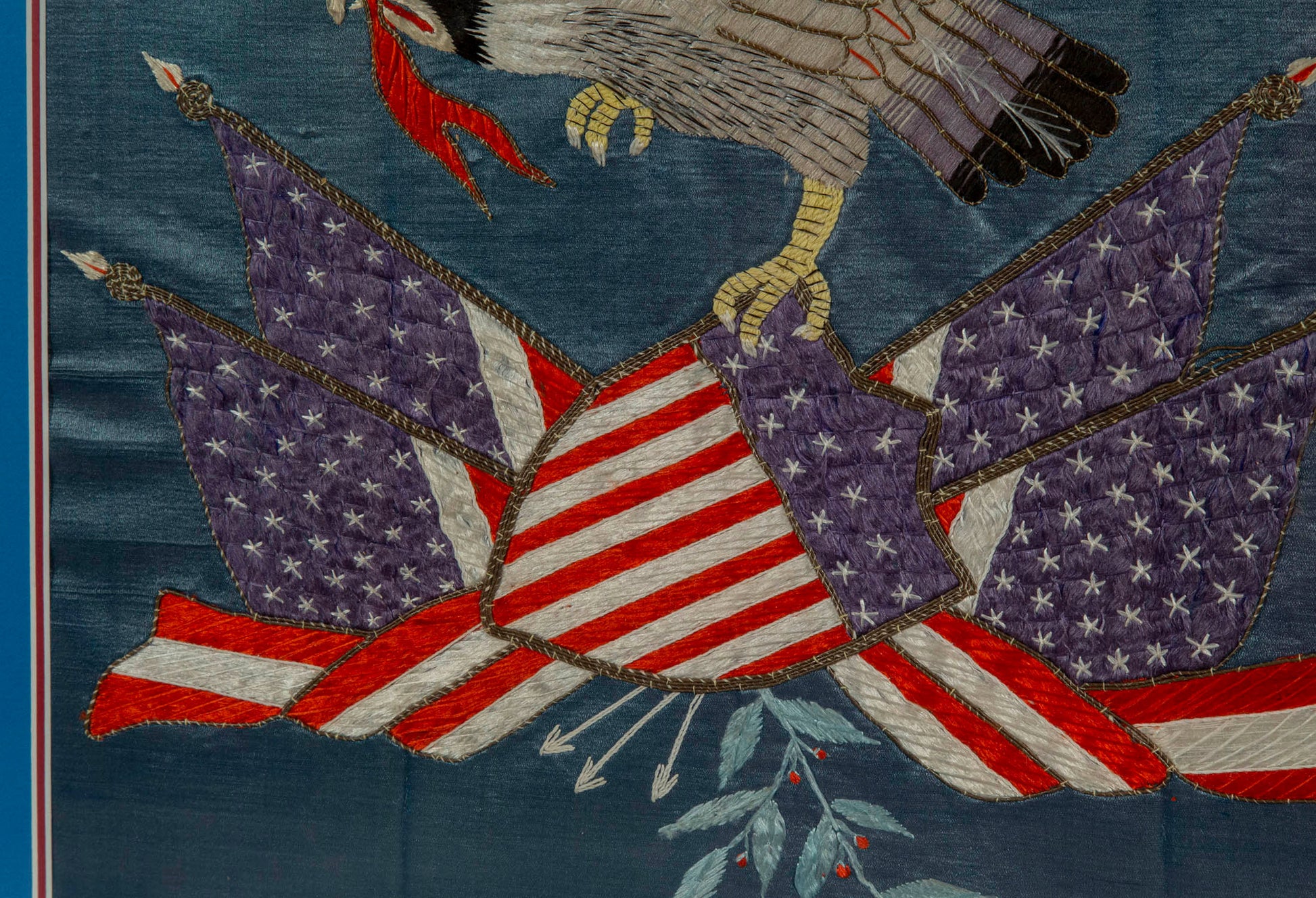 An early 20th century needlework picture of an eagle, holding a banner with the motto: "e pluribus unum", above a stars-and-stripes shield and flags; on a blue silk background, in modern gilt frame.