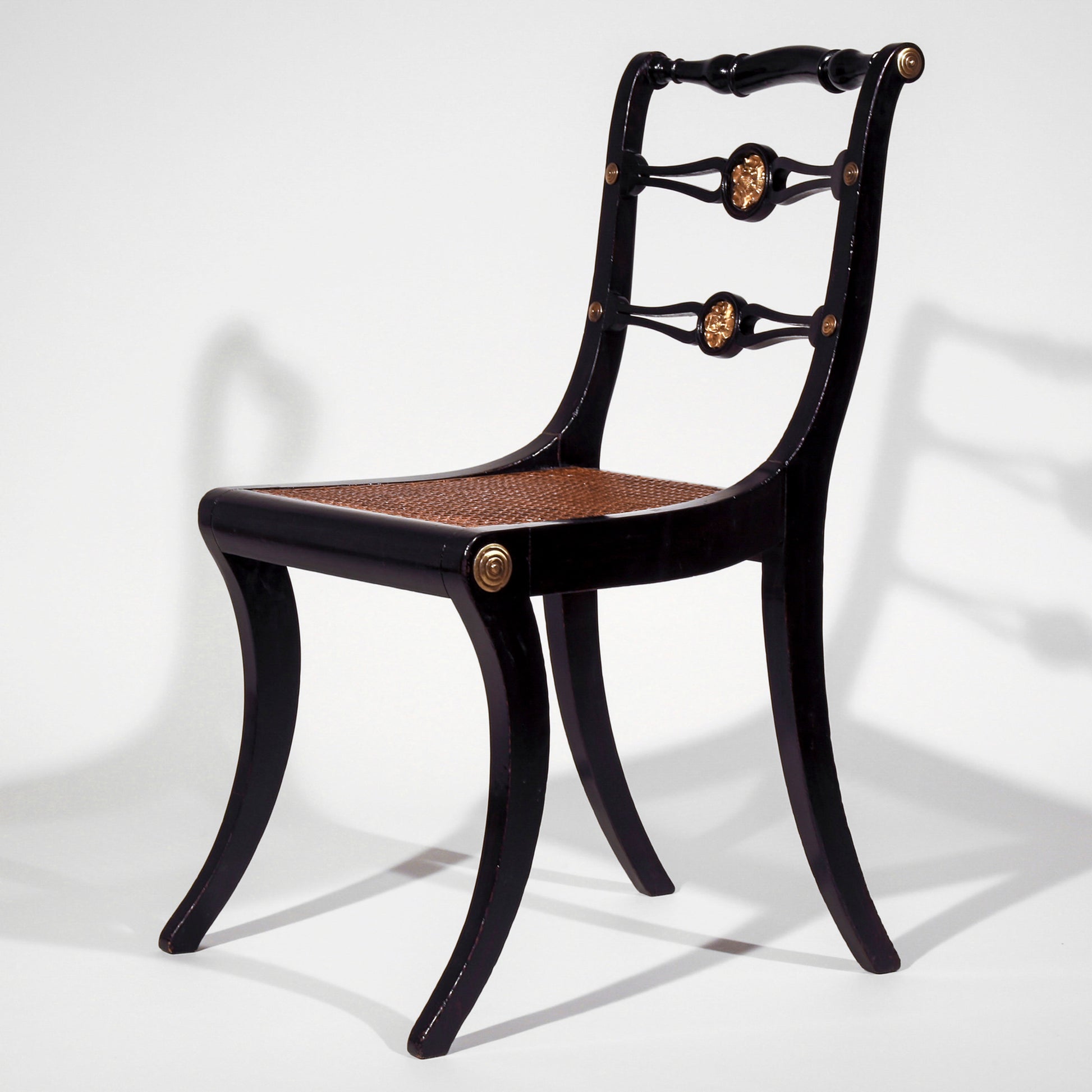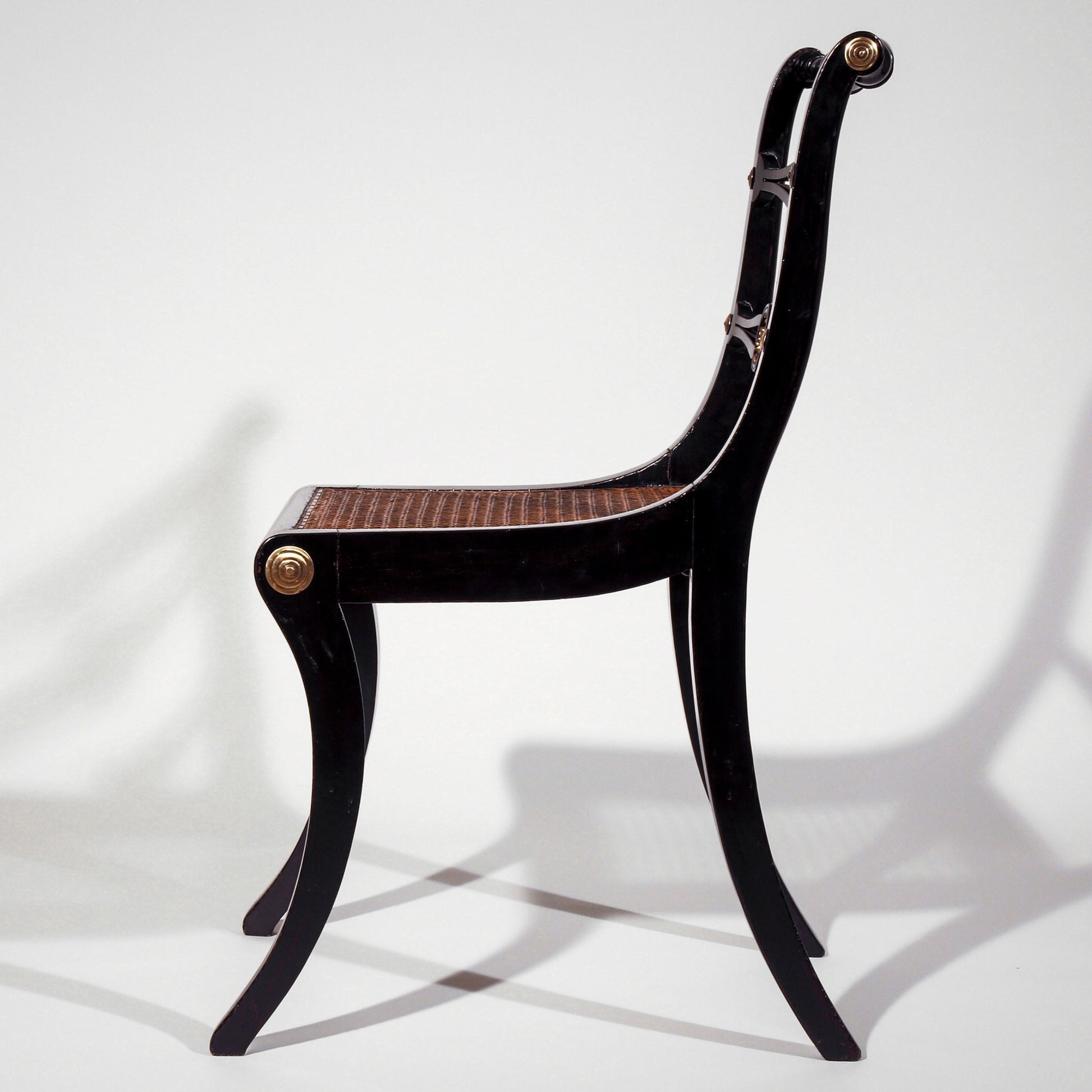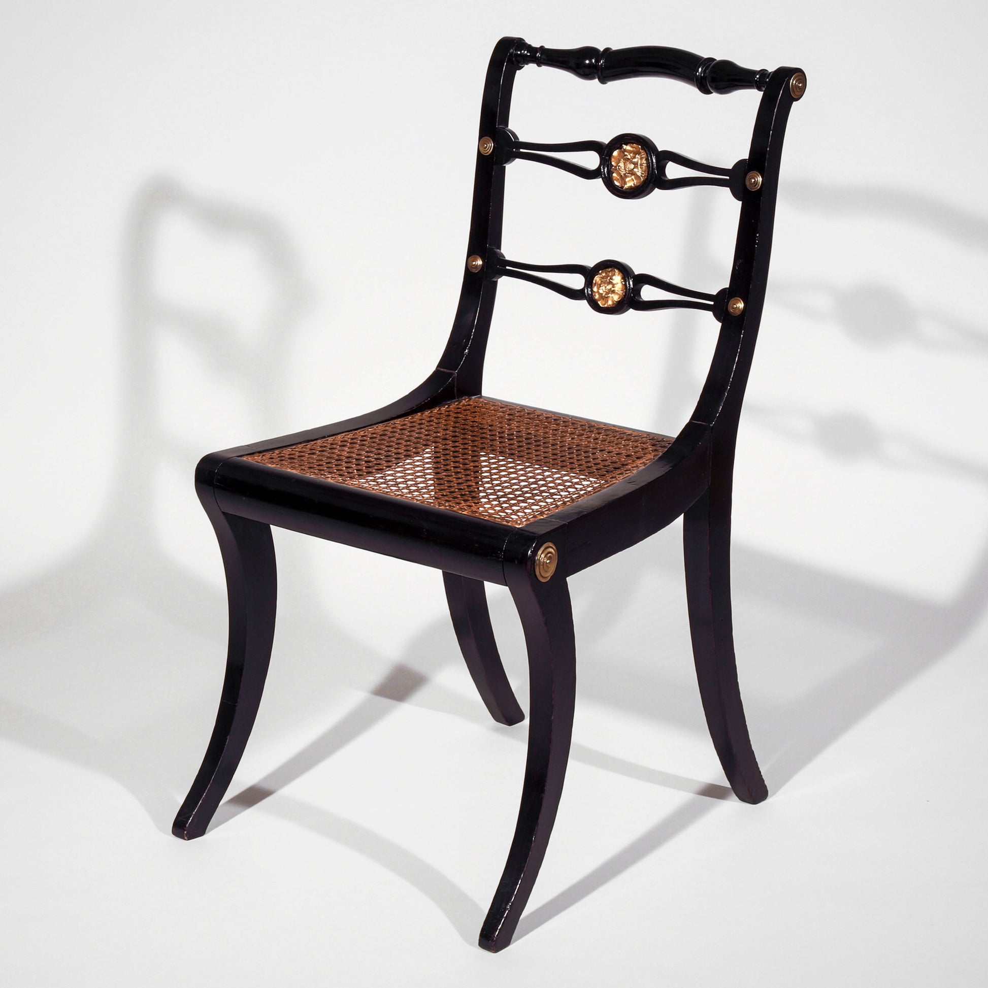 These black-japanned and cane-seated chairs, with Grecian boldly curved legs and gilt-brass paterae, are designed in the French antique fashion popularised by Thomas Hope and Henry Holland. Their superbly curved 'Sabre' legs derive from the Greek 'Klismos' chair, an epic timeles design, already popular in circa 400 BC, while the lustrous black japanning evoke the then newly fashionable fascination with Ancient Egypt.