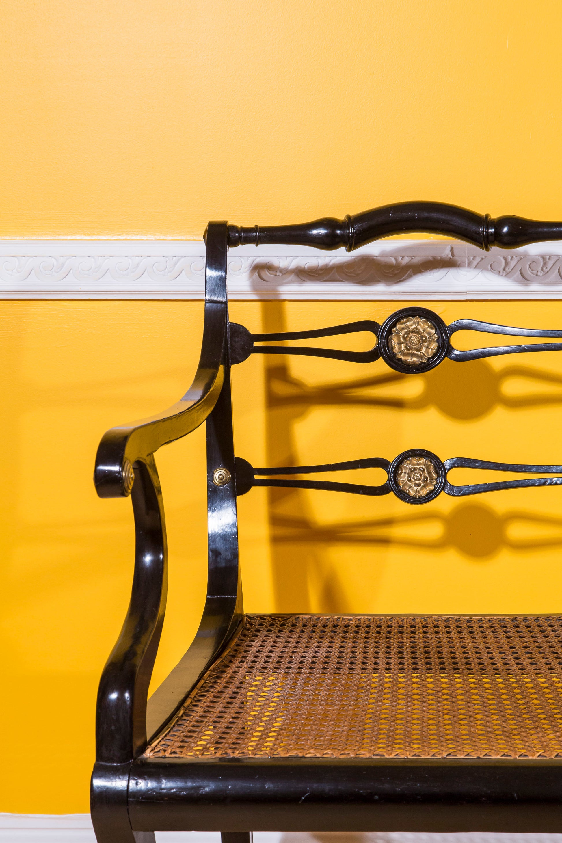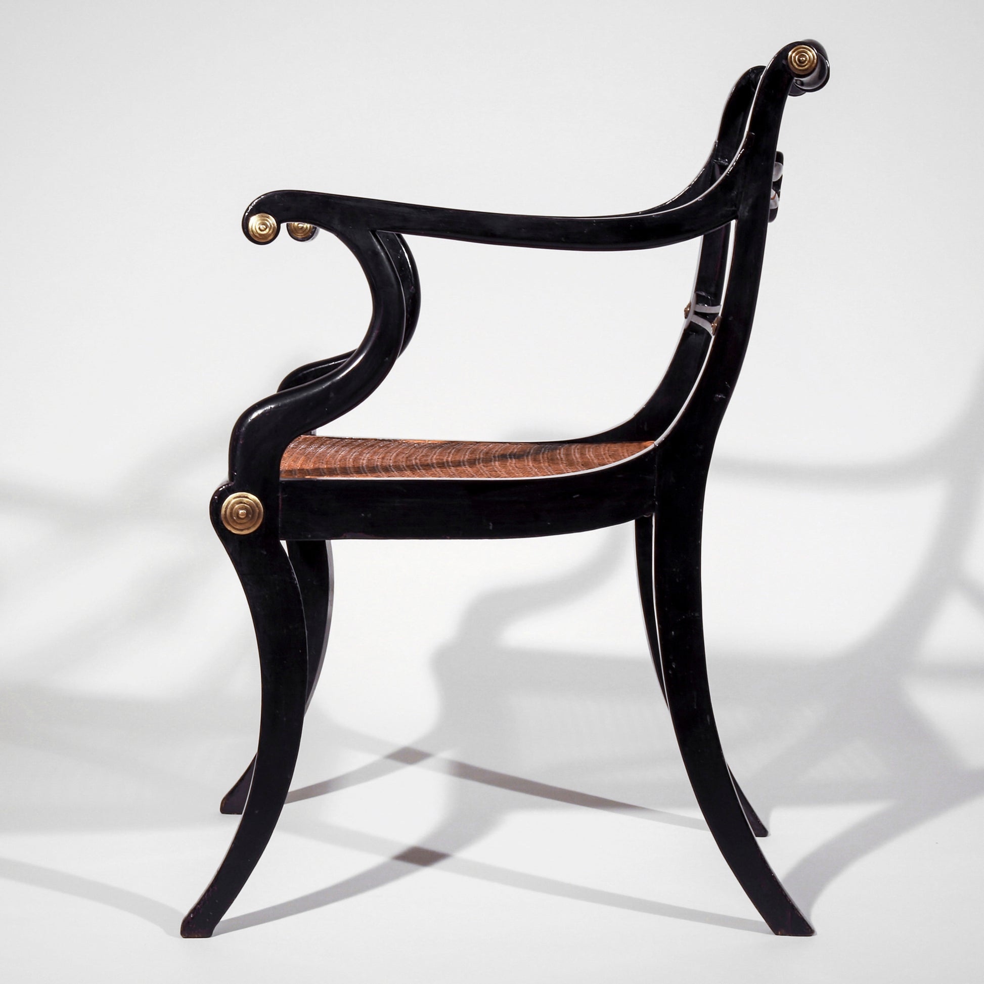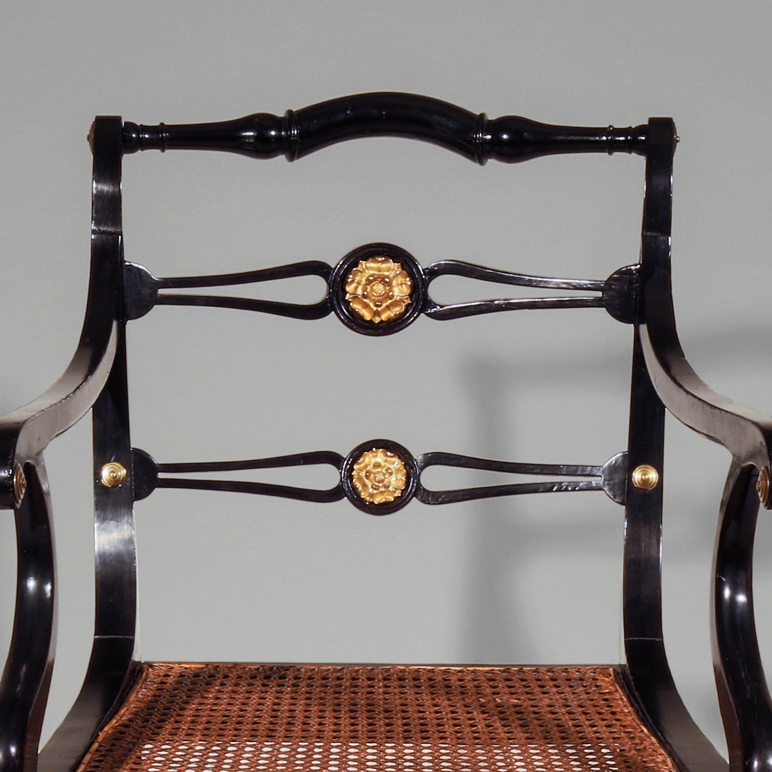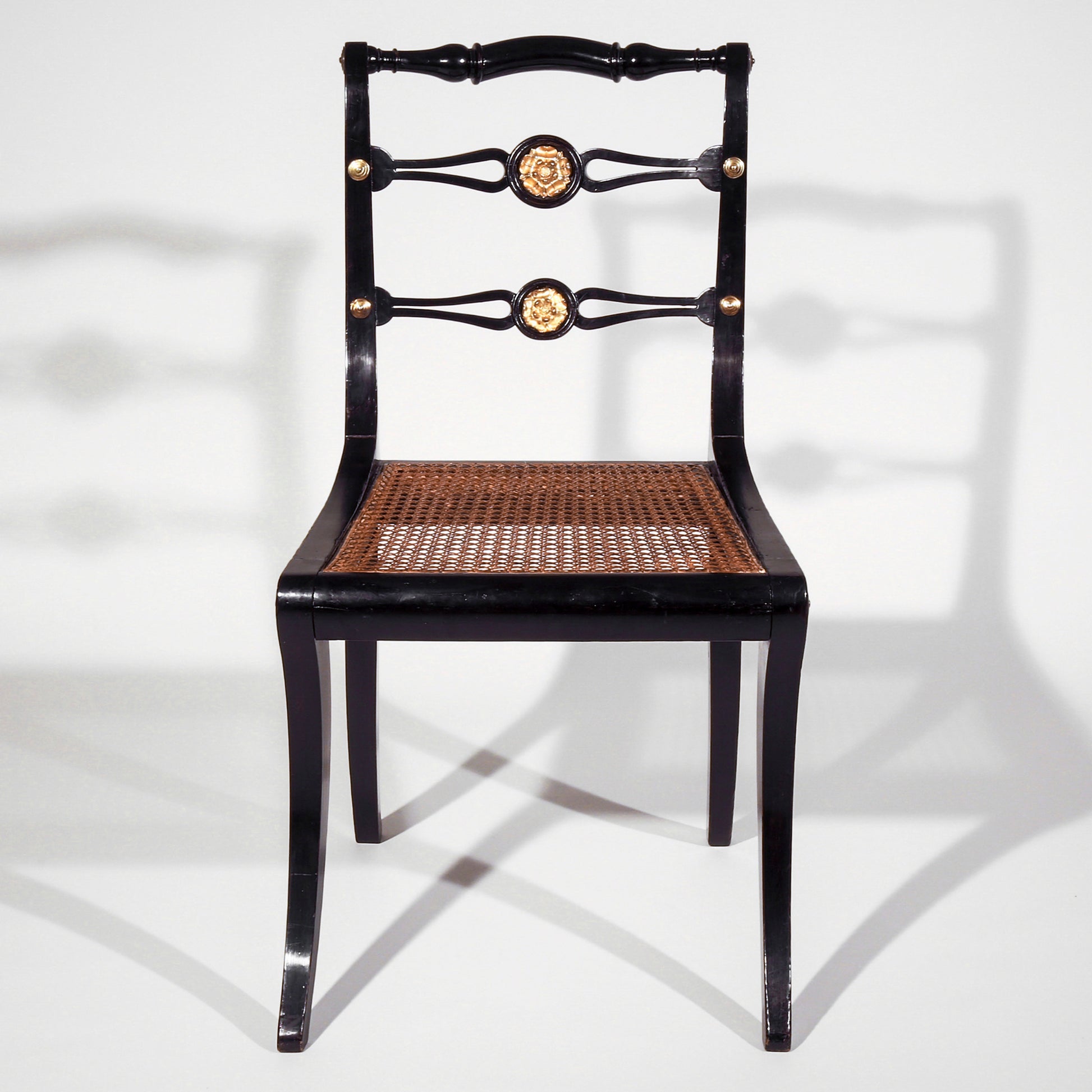 These black-japanned and cane-seated chairs, with Grecian boldly curved legs and gilt-brass paterae, are designed in the French antique fashion popularised by Thomas Hope and Henry Holland. Their superbly curved 'Sabre' legs derive from the Greek 'Klismos' chair, an epic timeles design, already popular in circa 400 BC, while the lustrous black japanning evoke the then newly fashionable fascination with Ancient Egypt.