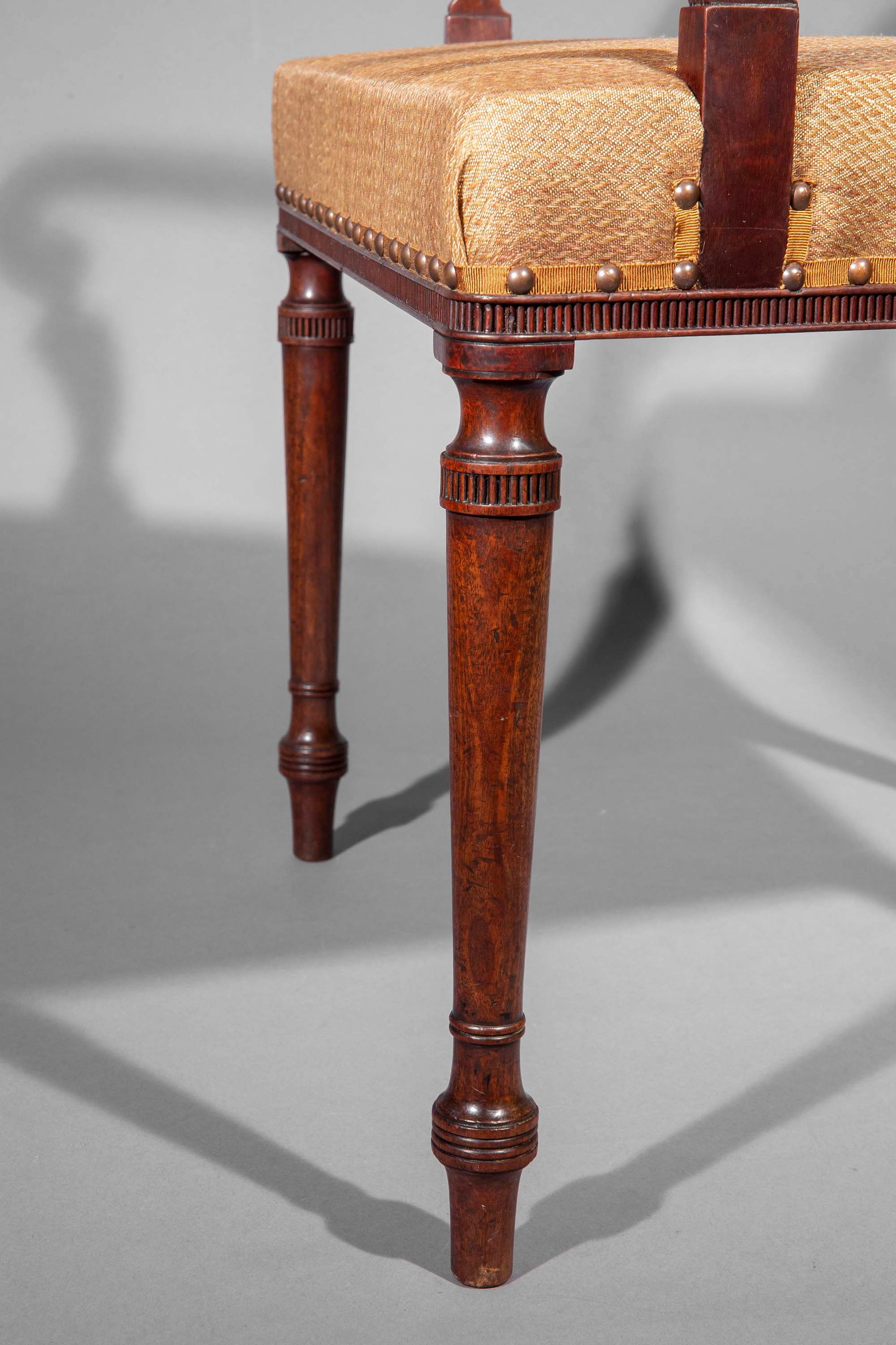 We love its slender, flowing design; its exquisite decoration of minutely carved reeded mouldings, and the unusual, supremely elegant armrests. Superb colour and patination of mahogany, remarkable state of preservation. Covered in sumptuous John Boyd Textiles 'Milzig' silk and horsehair fabric.