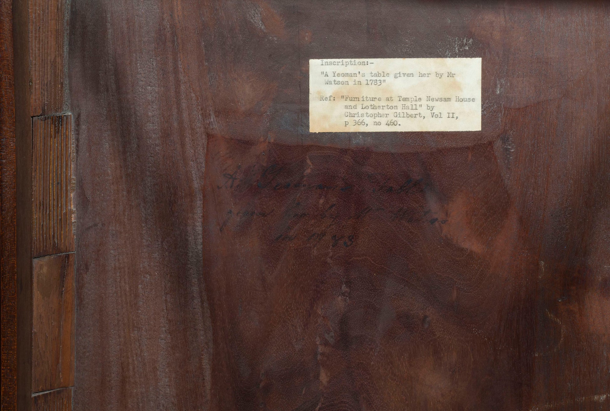 A related table was sold Christie’s London, 9 August 2011 lot 222. Notably, the table bears an 18th century ink inscription n the underside of the top, reading: 'A. Yeoman's Table given her by Mr Watson in 1783', and a later typewritten paper label, with the same inscription and a reference: 'Furniture at Temple Newsam House and Lotherton Hall' by Christopher Gilbert, Vol II, p. 366, no. 460 (where an almost identical table is illustrated, with a reference to the present table, owned by Harold Tweed of Bradford).