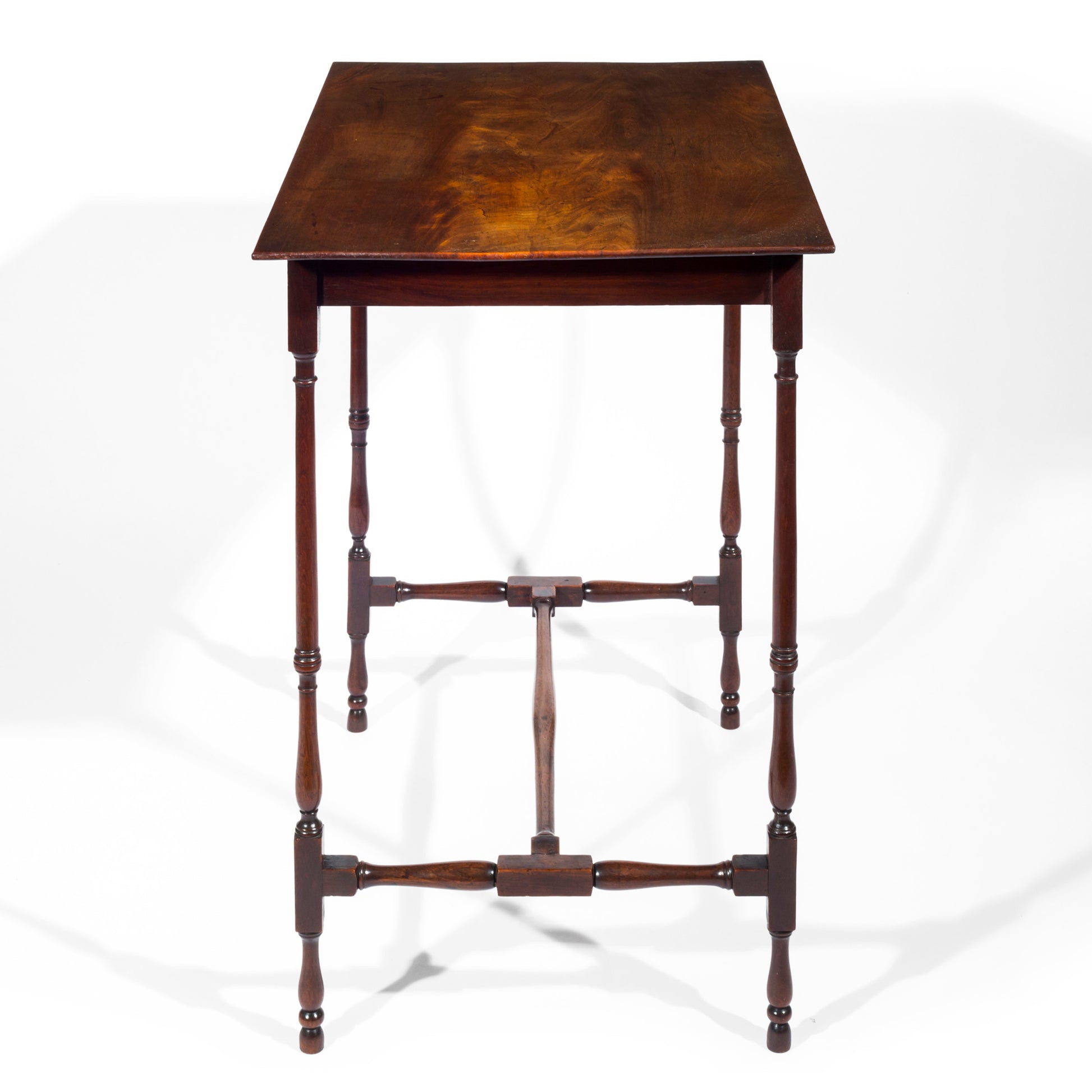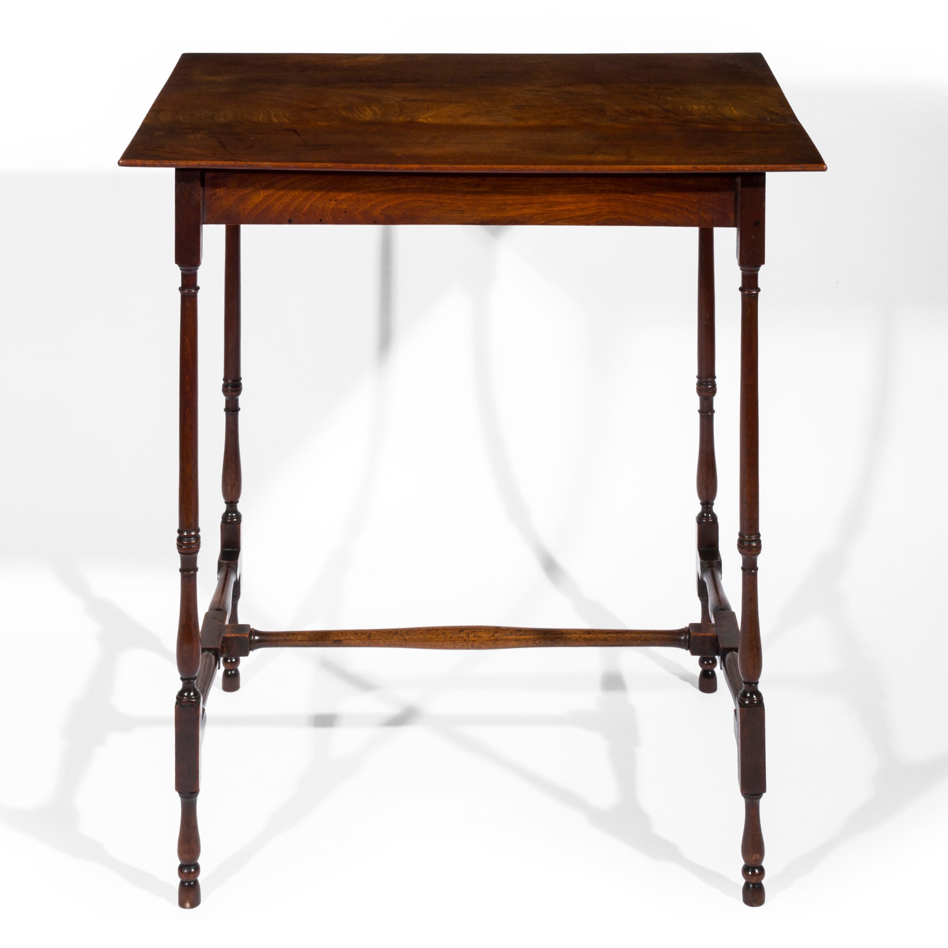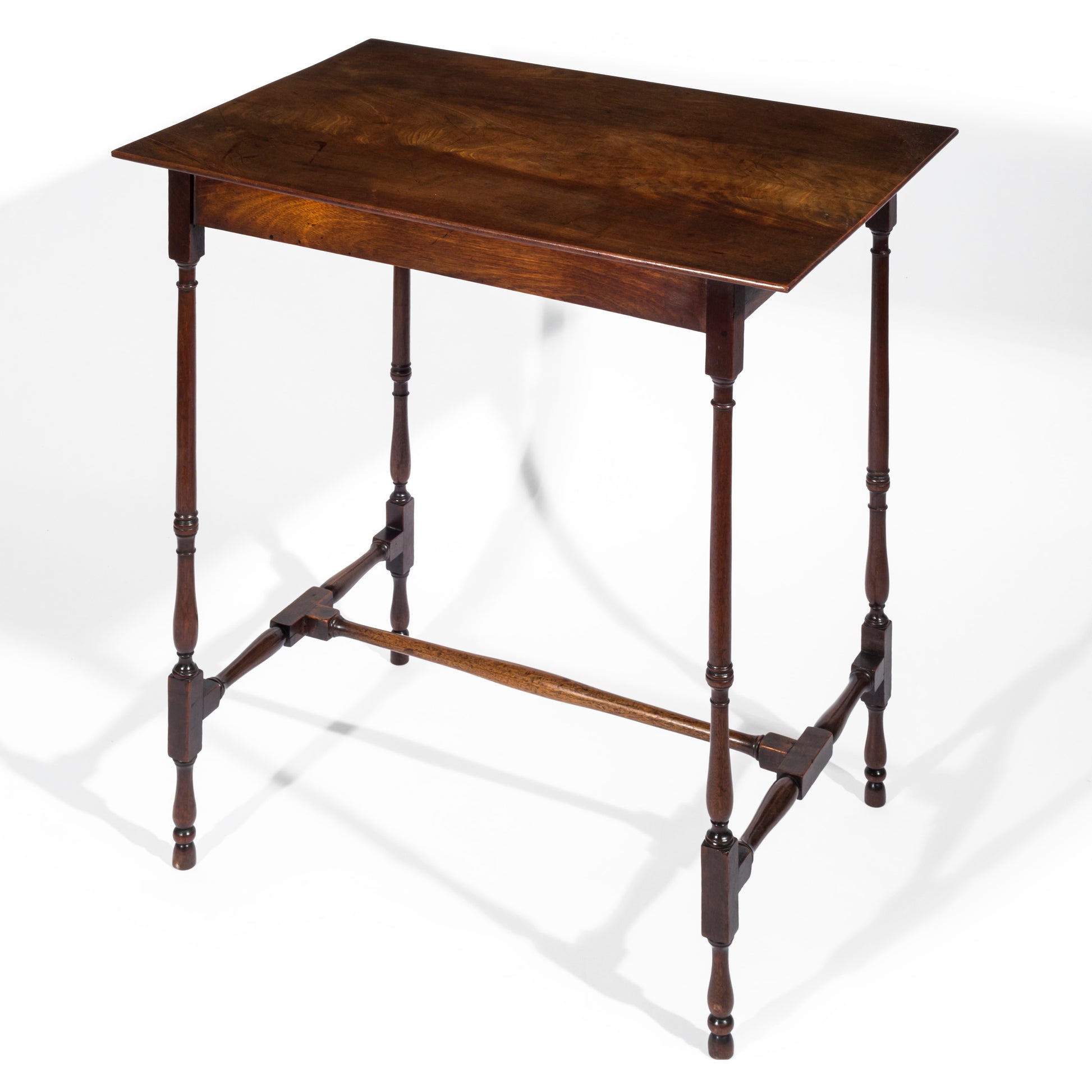 With an unusually thin, rectangular well-figured solid mahogany top, above a plain frieze, on slender, ring turned legs, joined by conforming stretchers, raised on tassel feet. A number of closely related side tables in mahogany, attributed to ‘The Dumfries House Cabinet-Maker’, possibly Thomas Chippendale, was supplied circa 1760 to Lord Dumfries (illustrated). A related table, distinguished by a superb quality of construction, and having same turned tassel feet, similarly constructed frieze and thin top, is at Fenton House (NT 1448858), possibly supplied under the guidance of John Fowler, who decorated the house in 1960's.