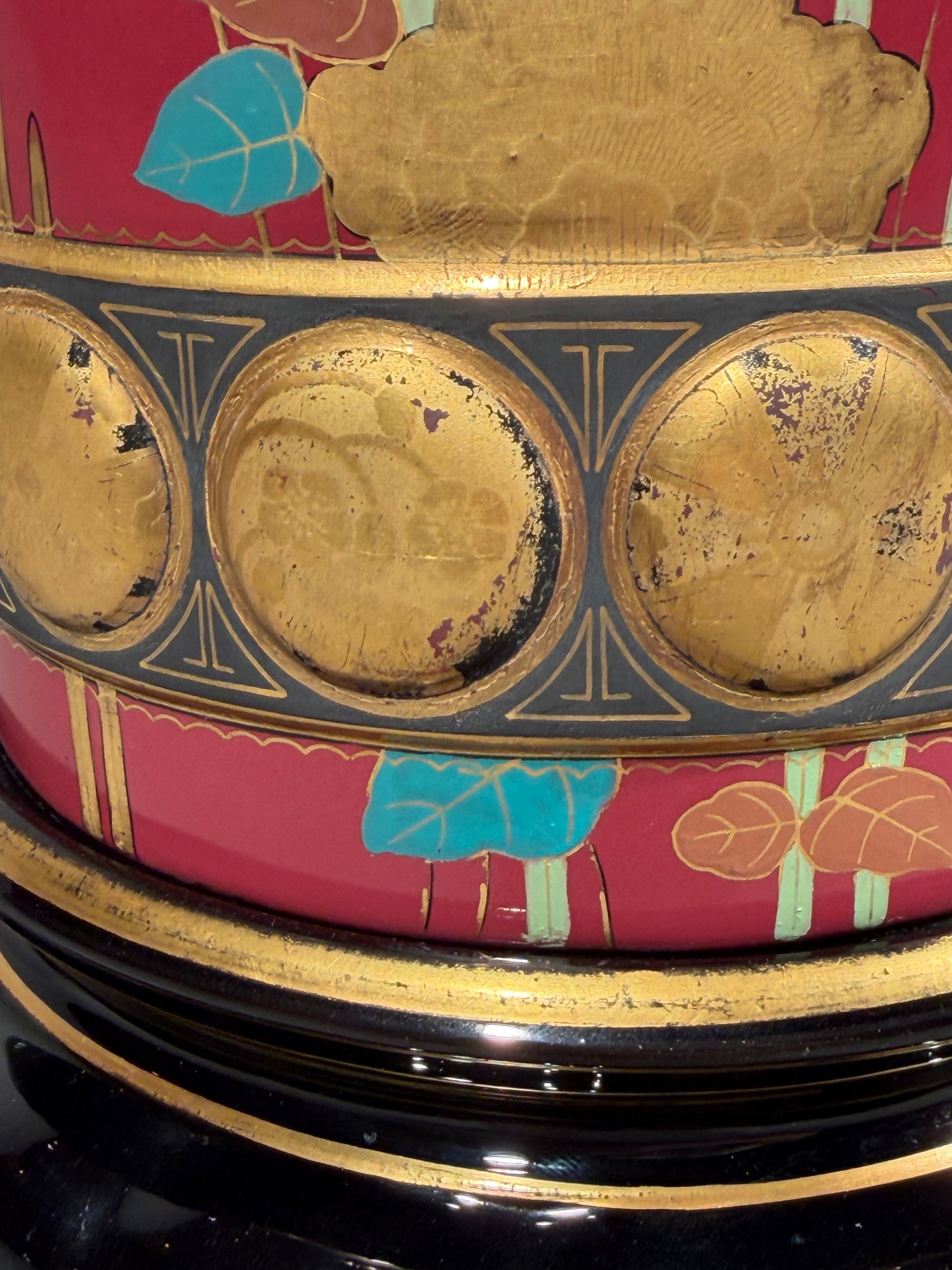 A large, exhibition-quality stoneware cylinder vase on a stand, with silver and gold leaf, and polychrome relief-decorated Japanese motifs over a deep purple-red ground. Unusually, the vase is also decorated on the interior, a feature typically reserved for exhibition rather than function pieces.
