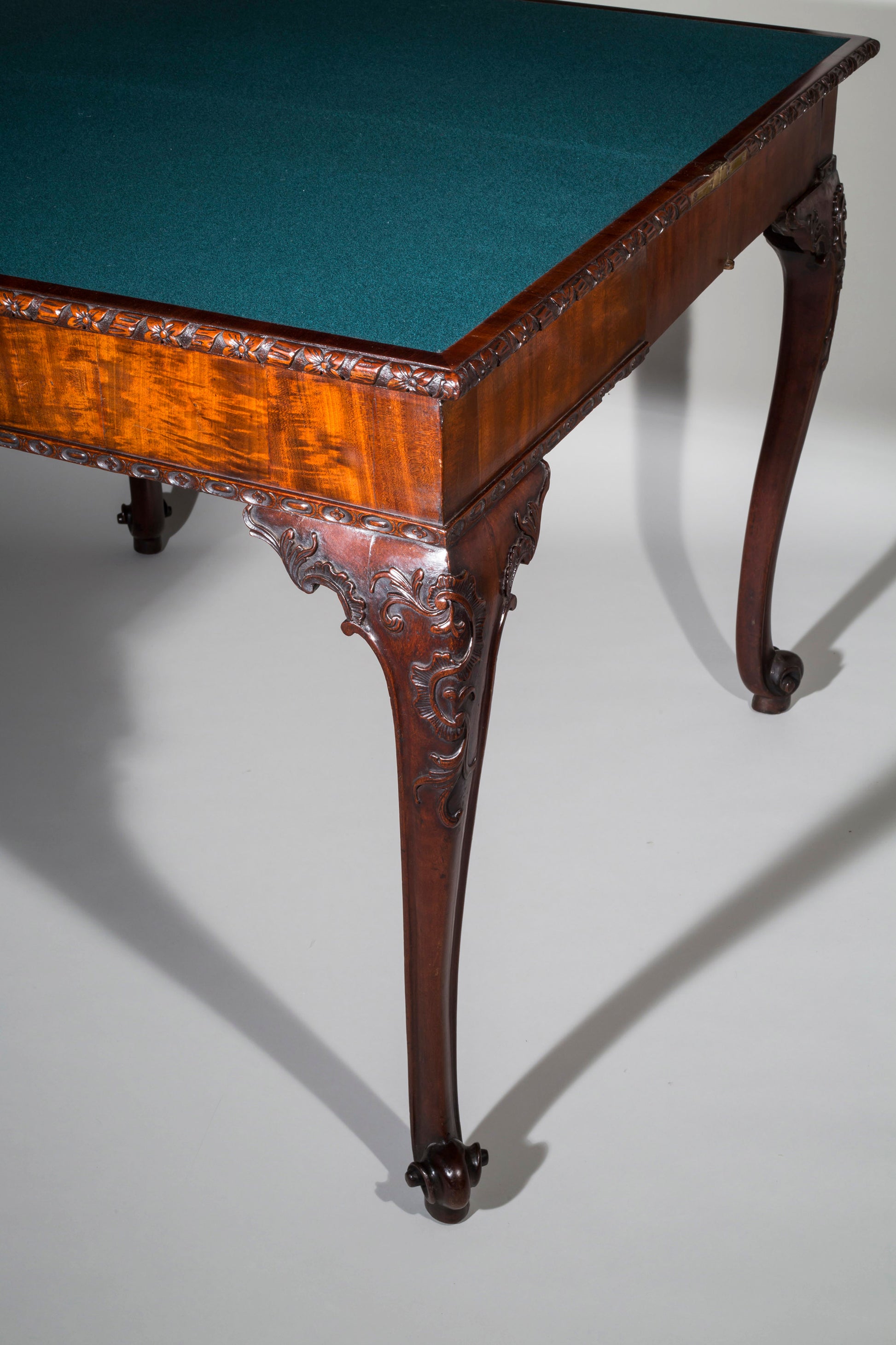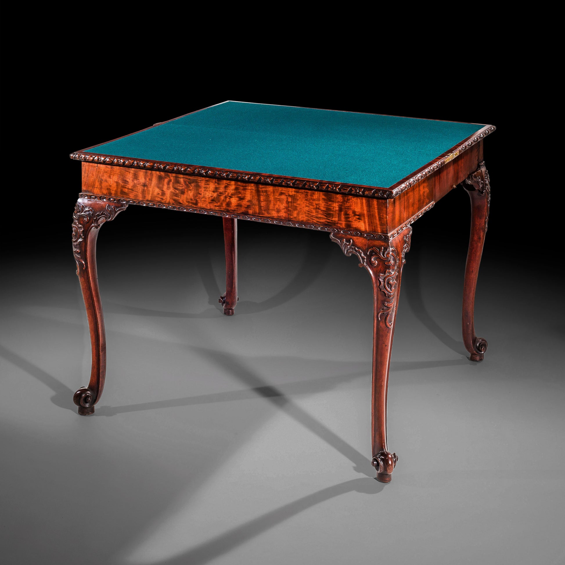 The finely figured mahogany rectangular foldover top, with a ribbon and floral-carved edge, opening to reveal a baize-lined playing surface, above a conforming frieze similarly veneered, with carved edge, standing on four cabriole legs headed by knees carved with acanthus, scrolls and strapwork and terminating in bold 'French' scroll feet raised on faceted pads; concertina-action support retaining the original oak slide, iron hinges stamped H.TIBATS.