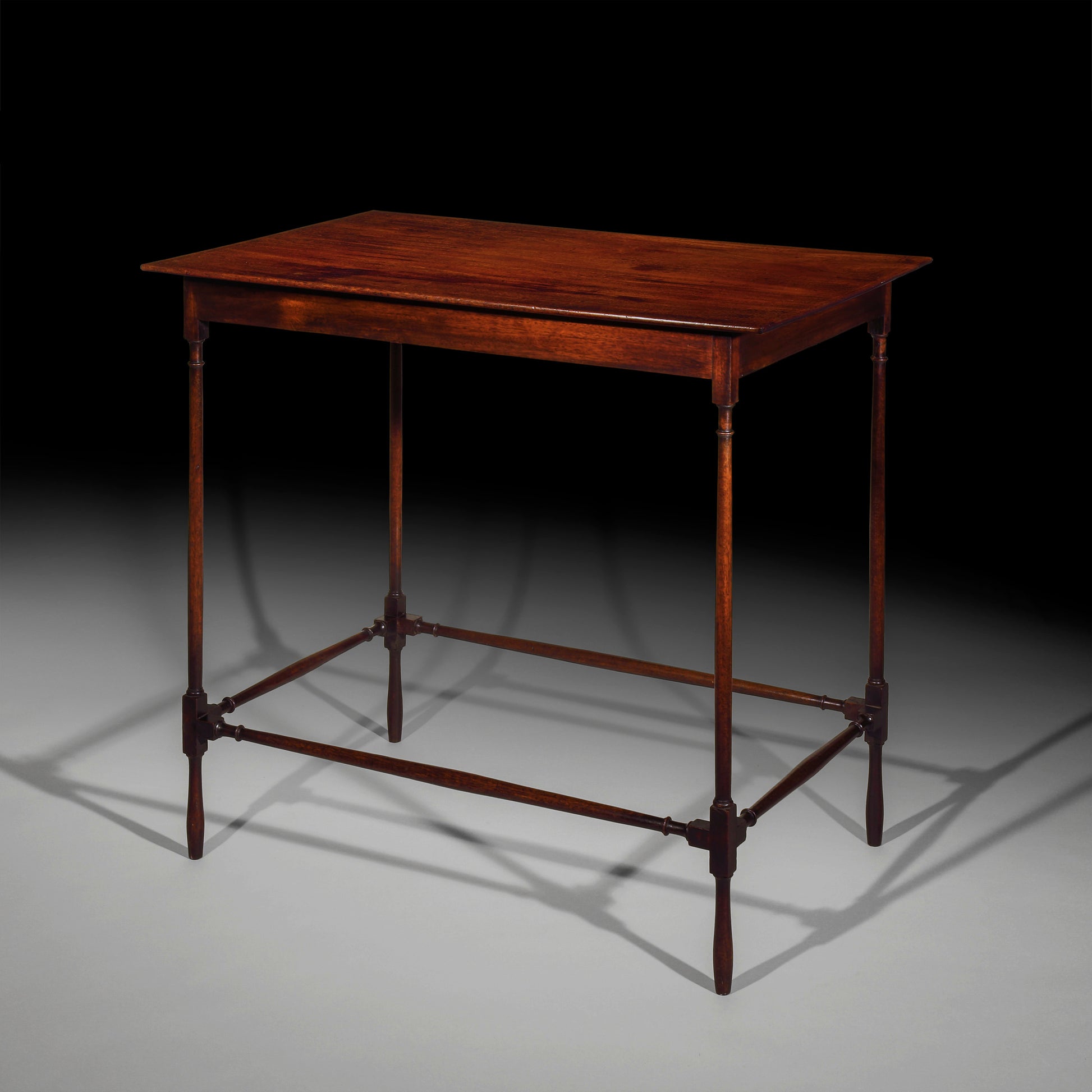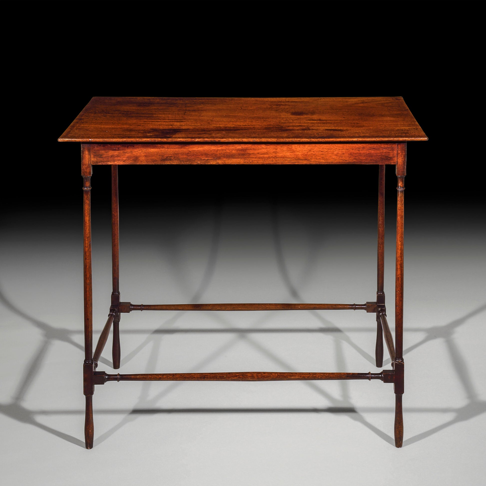 With an unusually thin, rectangular solid mahogany top, above a plain frieze, on slender, collar-turned legs, joined by conforming stretchers, raised on tassel feet.