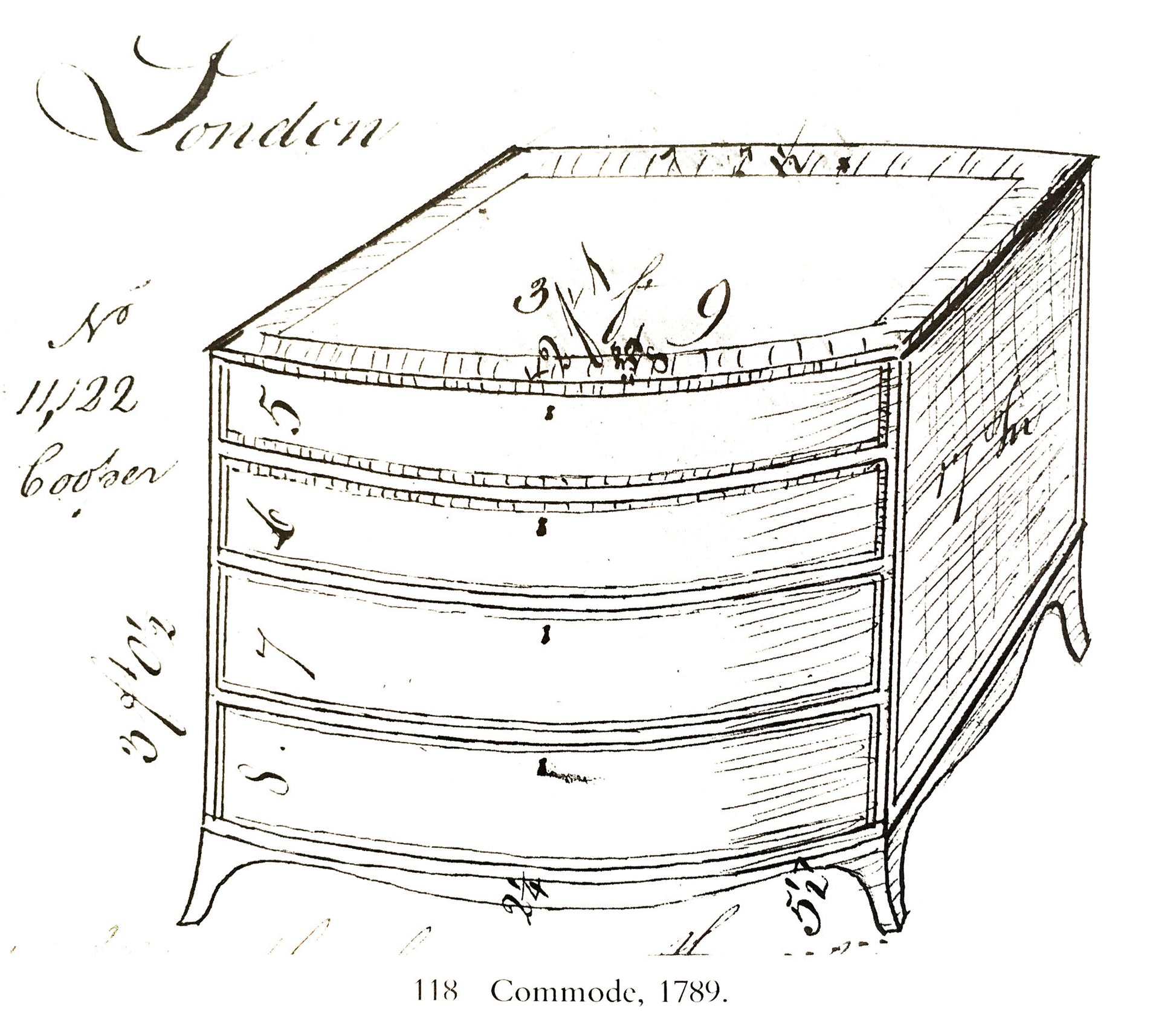 The form of this chest conforms to the Gillows design for a commode, dated 24.10.1789, made by Cooper for the London shop (see L.Boynton, Gillow Furniture Designs from 1760 to 1800, fig. 118); and also to another design for a satinwood chest of drawers, about 1789, (ditto, plate 11). The paneled or 'framed back' of present piece is typical of Gillows case pieces (ditto, fig. 117).