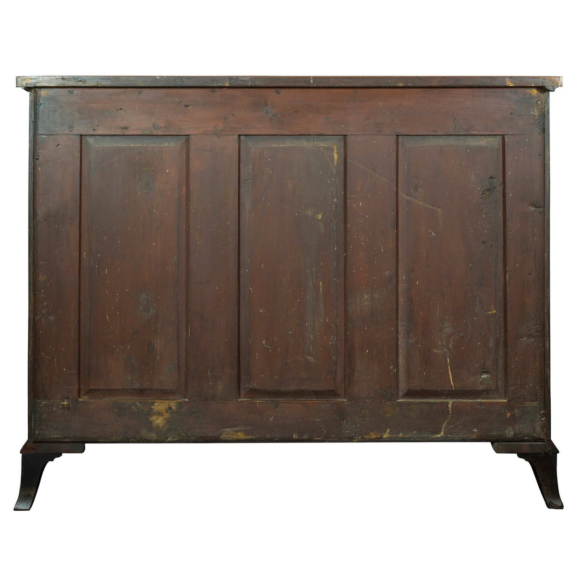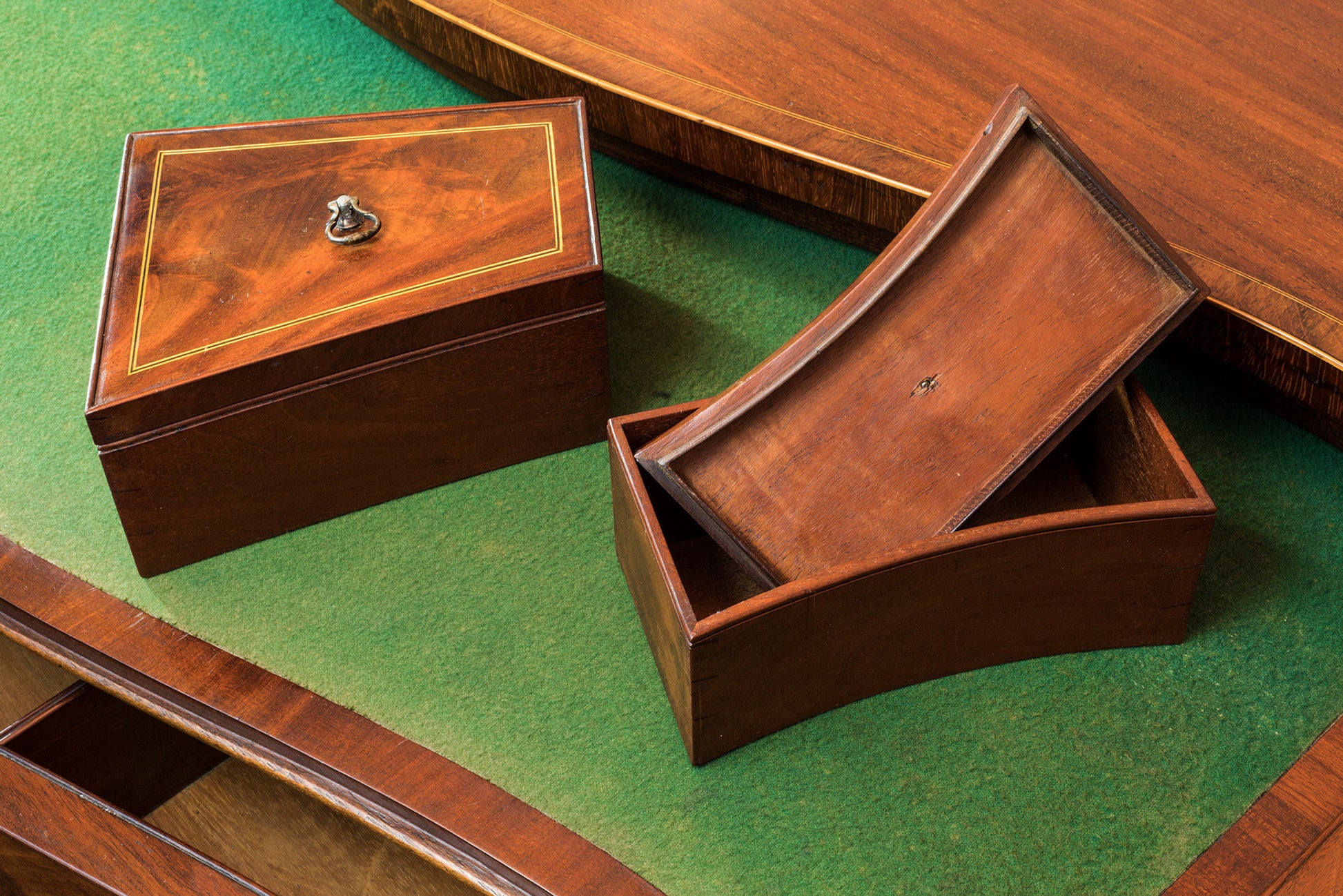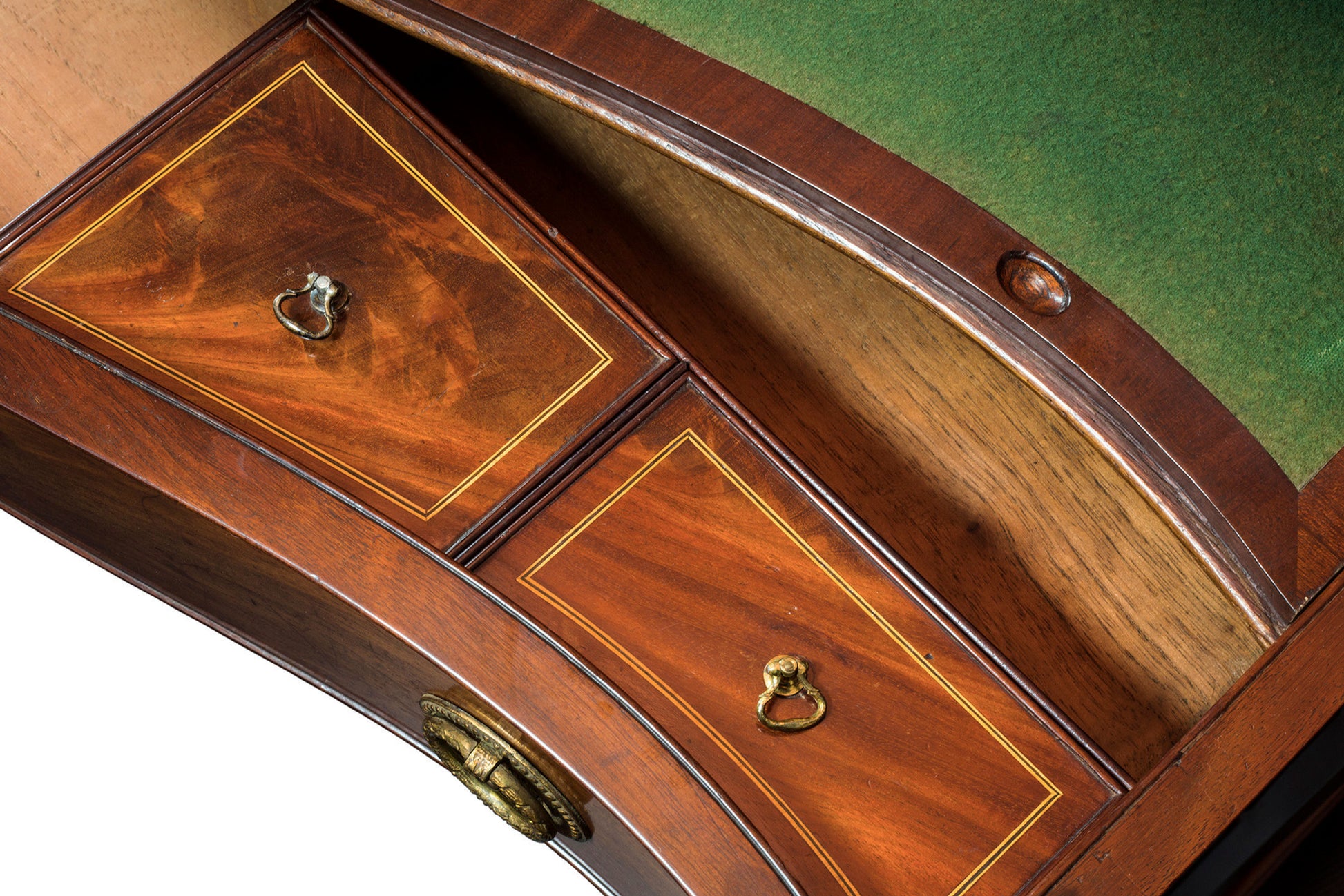 The serpentine shaped top, veneered in beautifully figured mahogany and crossbanded in tulipwood, with boxwood and ebony line stringing, above the four long graduated book-veneered drawers, retaining the original brass ring handles; the top drawer mahogany lined, fitted with partitions and lidded compartments beneath a baize-lined slide, retaining the original baize. The front is flanked by slim canted corners; the shaped moulding runs along the bottom edge, the whole is raised on four slender downswept bracket feet. The backboard is triple-panelled, treated with red wash, as often seen on high-quality furniture of the 18th century.