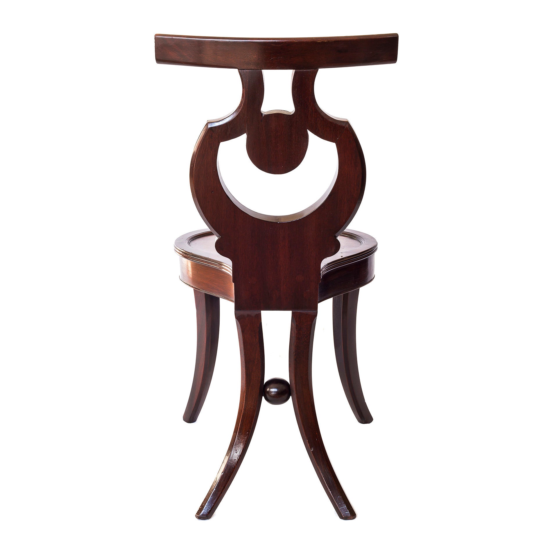 The shaped and pierced back, reeded overall, above the oval dished solid seat with reeded edge over fiddle-back mahogany veneered seat rail, raised on finely reeded sabre legs in front, and boldly curved outswept rear supports, united by a most unusual ball stretcher.