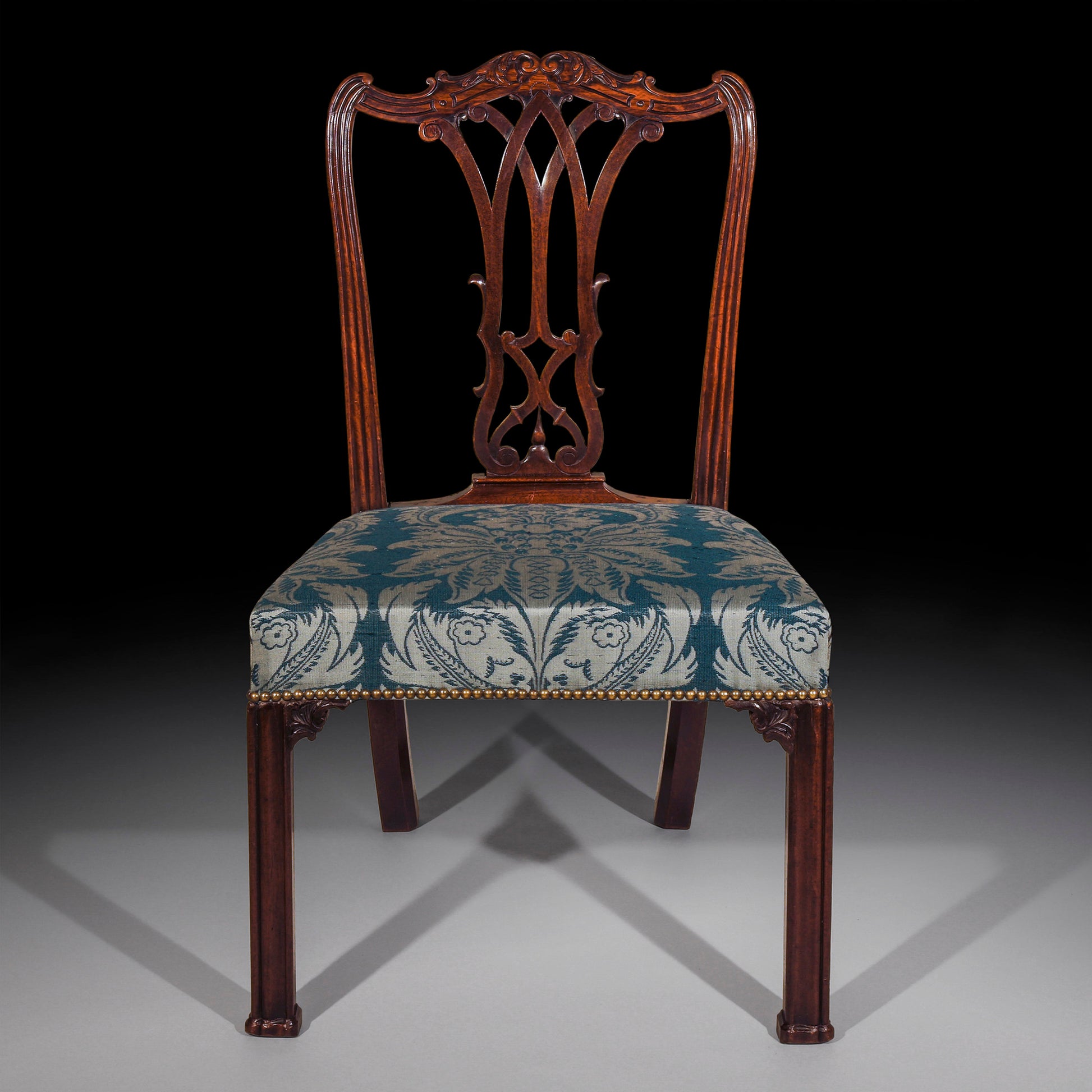 With a shaped foliate carved crest rail over a pierced gothic splat back and a traditionally uphostered seat, covered in blue Damask, on moulded cluster-column legs headed by a scrolled foliage carved ears. Superb quality of mahogany, crisp carving, original surface throughout, outstanding original colour and patination.