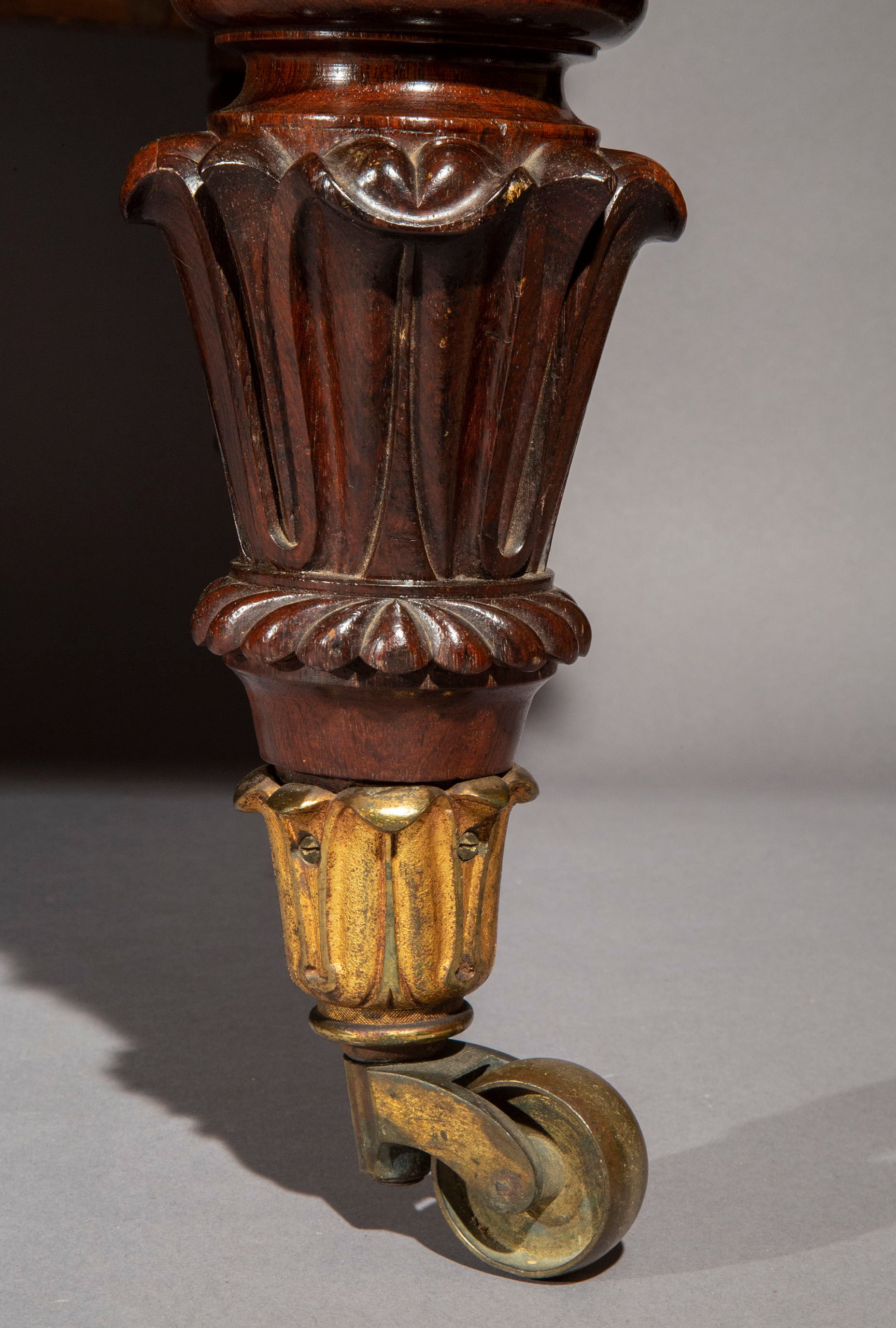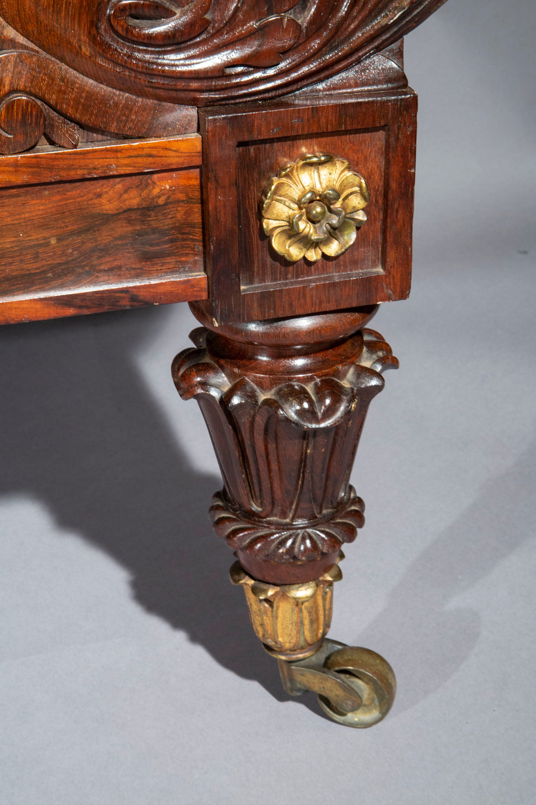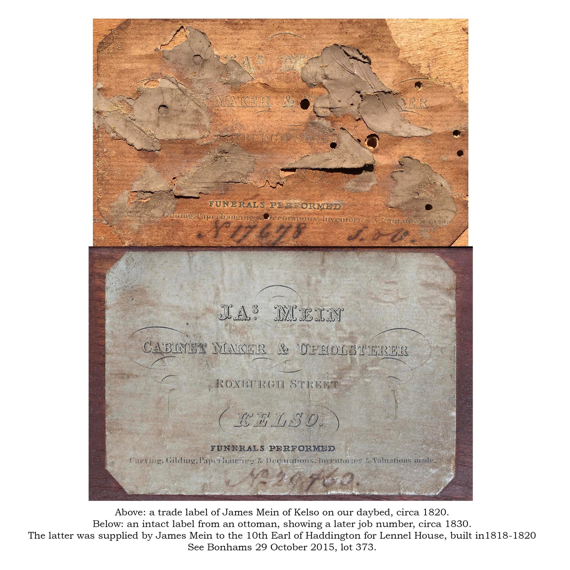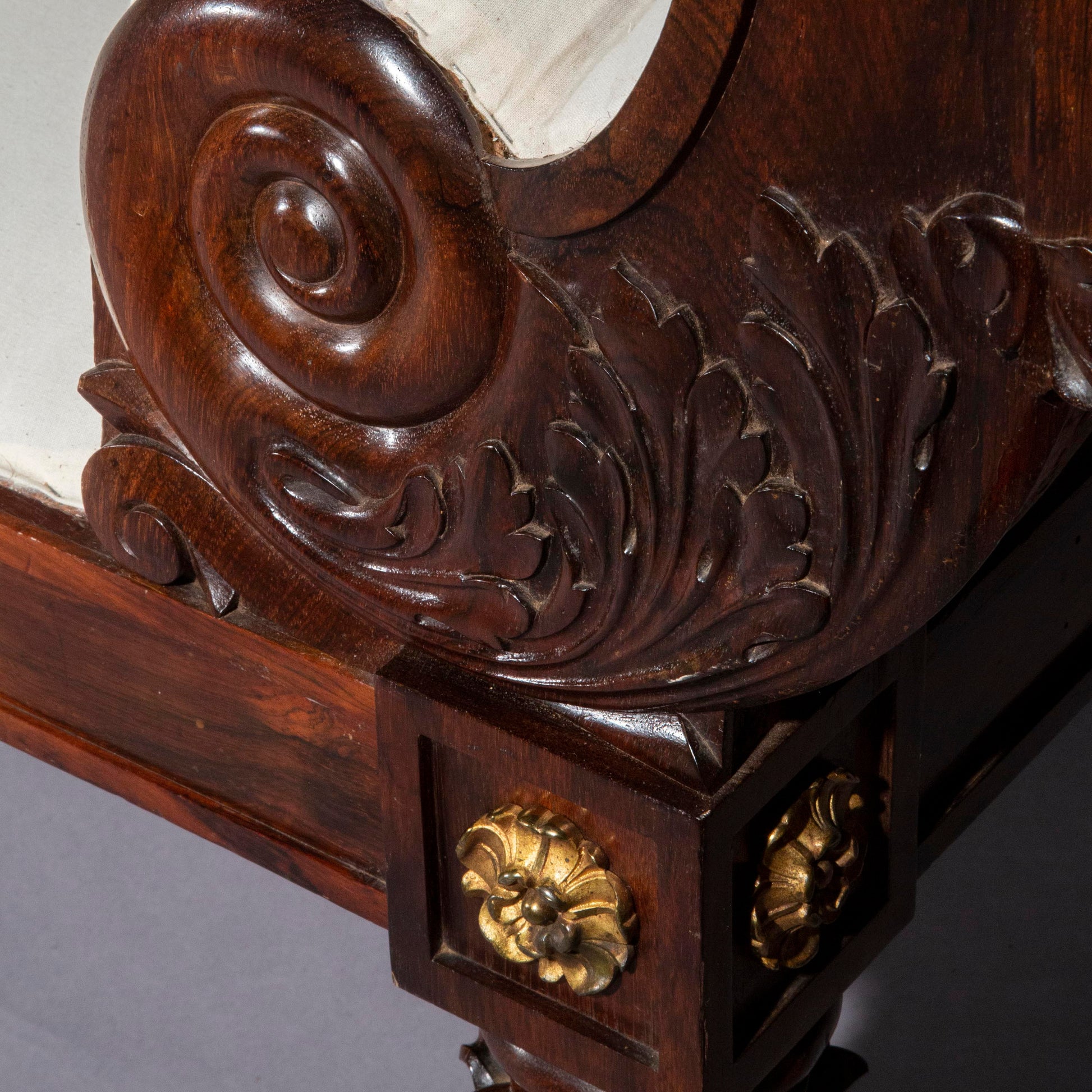 A very fine Regency period rosewood daybed or recamier, exquisitely carved and decorated with ormolu mounts and ornate Copes castors. Bearing the trade label of James Mein of Kelso.Scotland, circa 1820–25. Why we like itIts great, flowing design, superb quality and amazingly original condition with no restorations except reupholstery, make this rare, labeled piece of British furniture-making, a really special find. A beautifully versatile piece, can be used with or without the backrest. James Mein of Kelso (1759-1830) was one of the most prominent Scottish cabinet makers of the Regency era.Mein's work is in the collection of many established Scottish Border's families, notably the Duke of Roxburghe of Floors Castle and the Earl and Countess of Haddington at Mellerstain. Arguably Mein's most successful and recognisible style is a pared-down classicism that has been referred to as 'Scottish Biedermeier'.