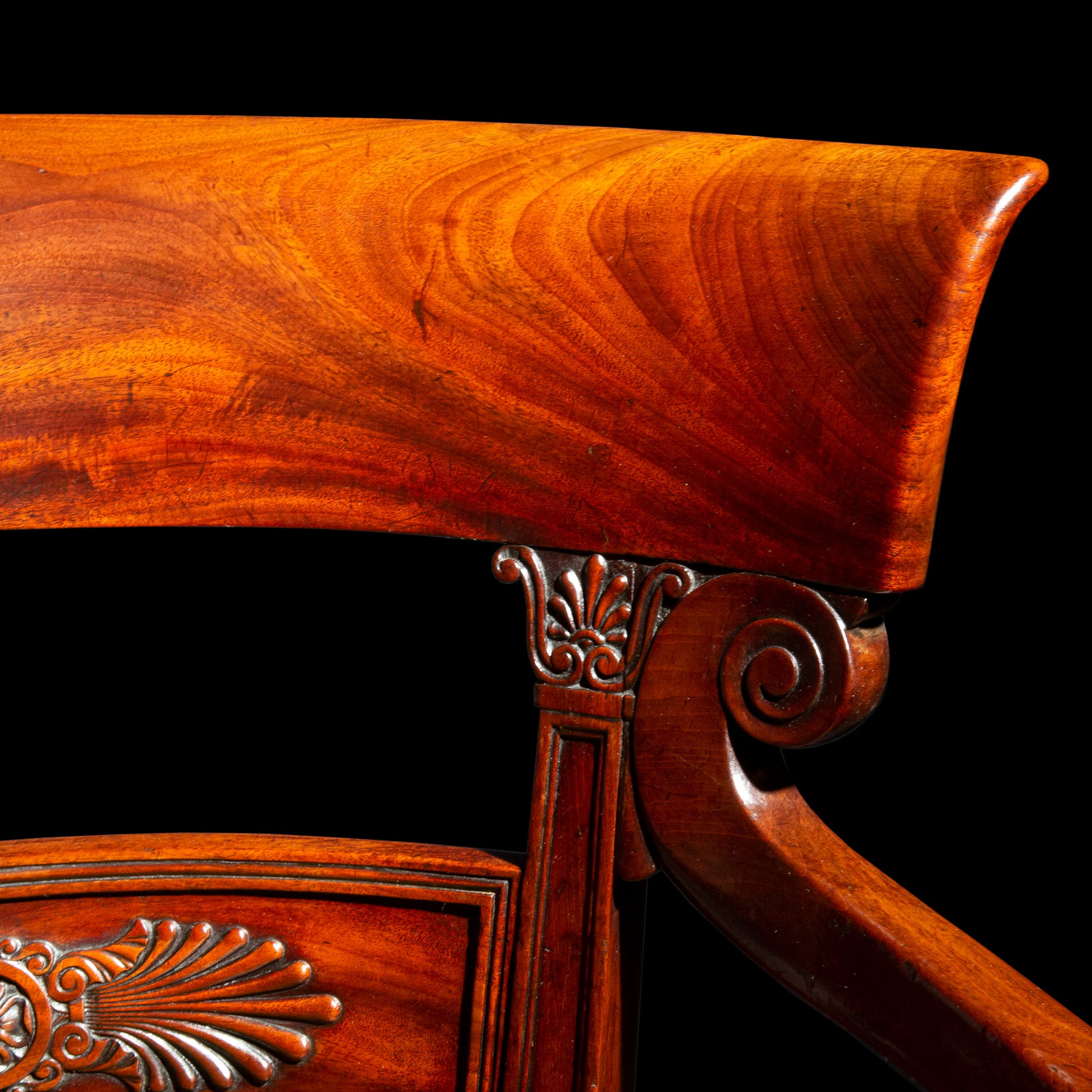 An exquisite English Regency period armchair of Klismos form, in mahogany.
