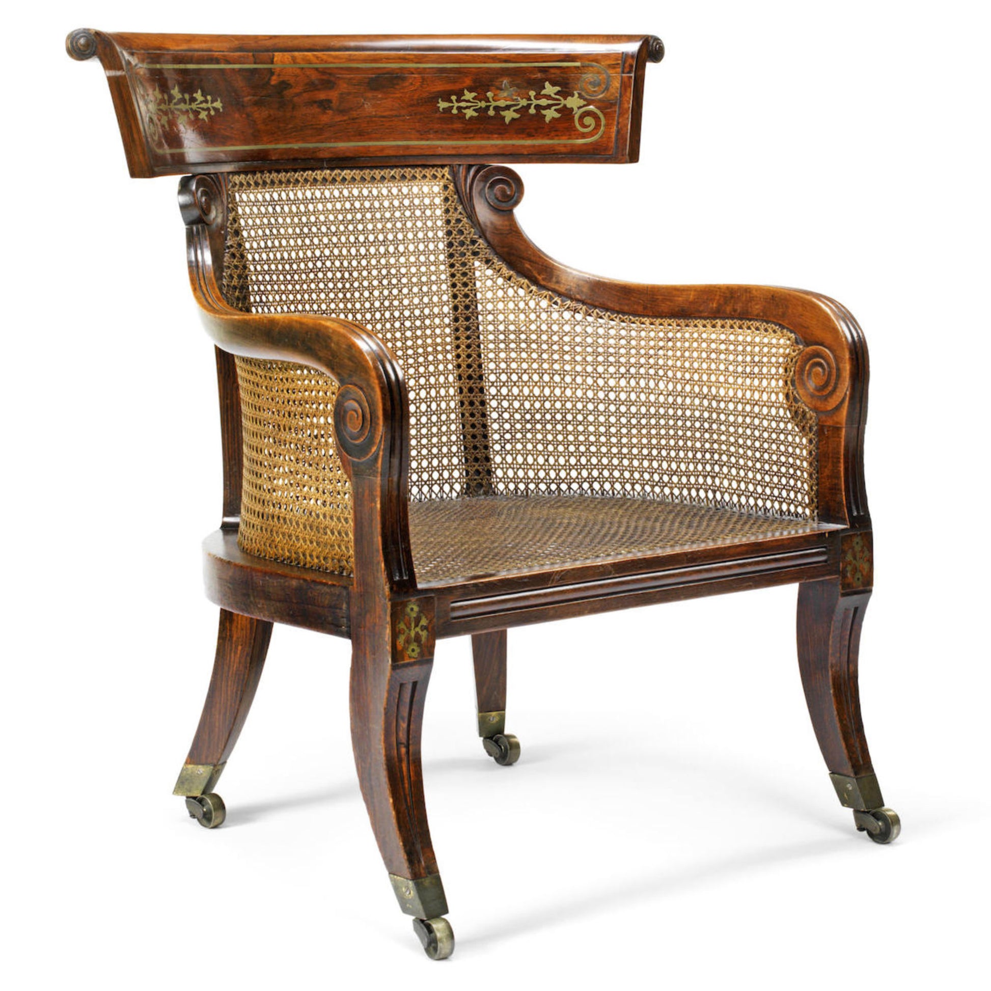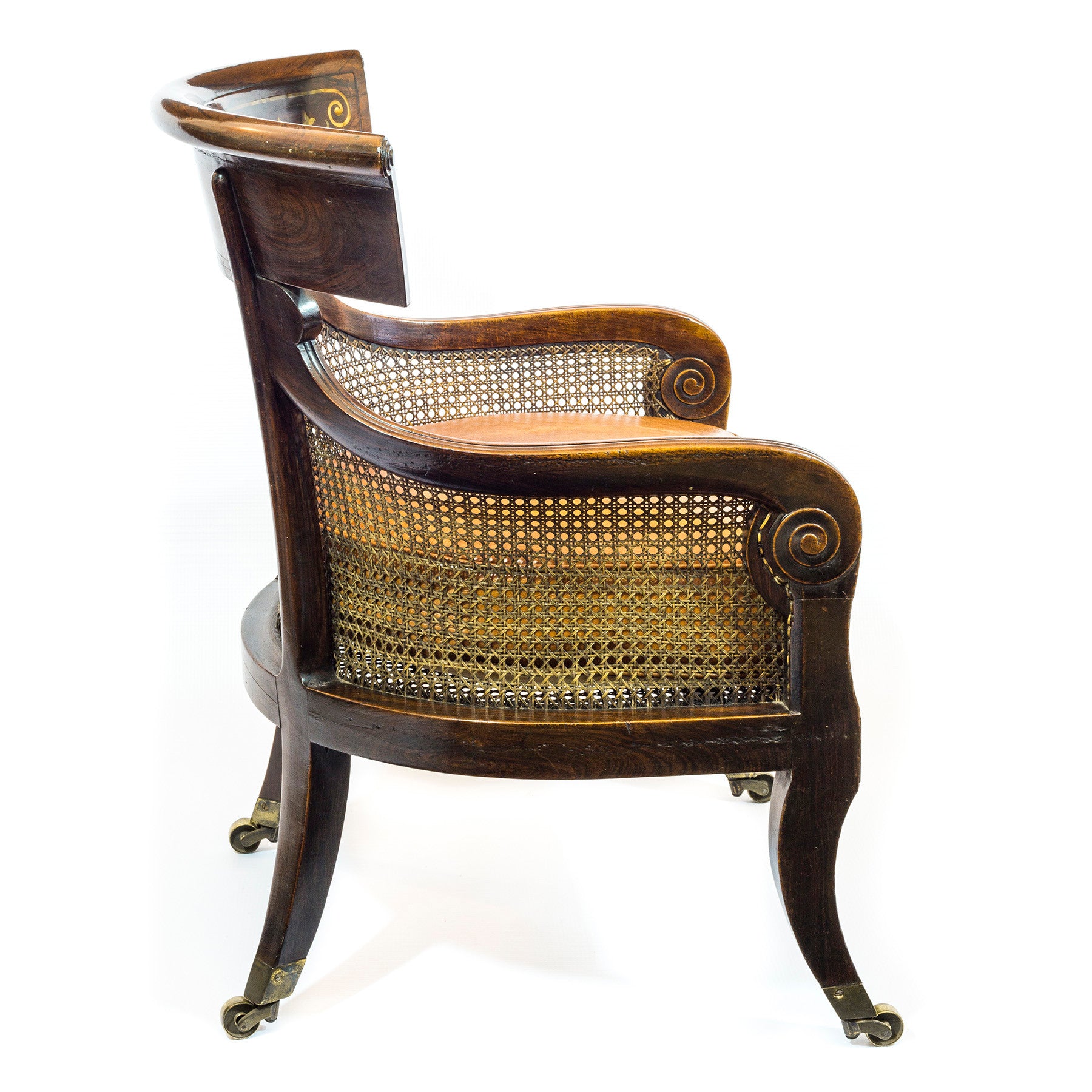 A fine Regency period simulated rosewood and rosewood library tub bergère, of Klismos form, attributed to William Wilkinson of Ludgate Hill, London.