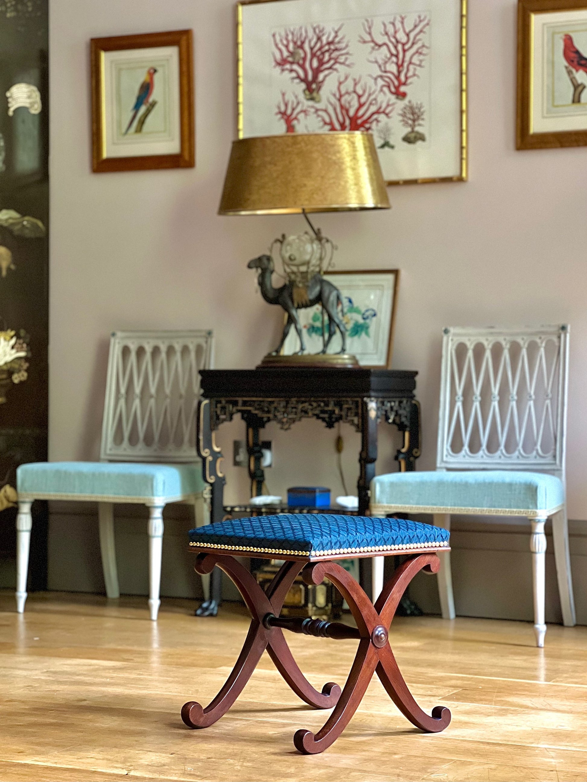 A finely drawn Regency period x-frame stool in Spanish mahogany, beautifully upholstered in the luxurious John Boyd Textiles blue horsehair fabric. Of Gillows style and quality, after a design by Thomas Hope.