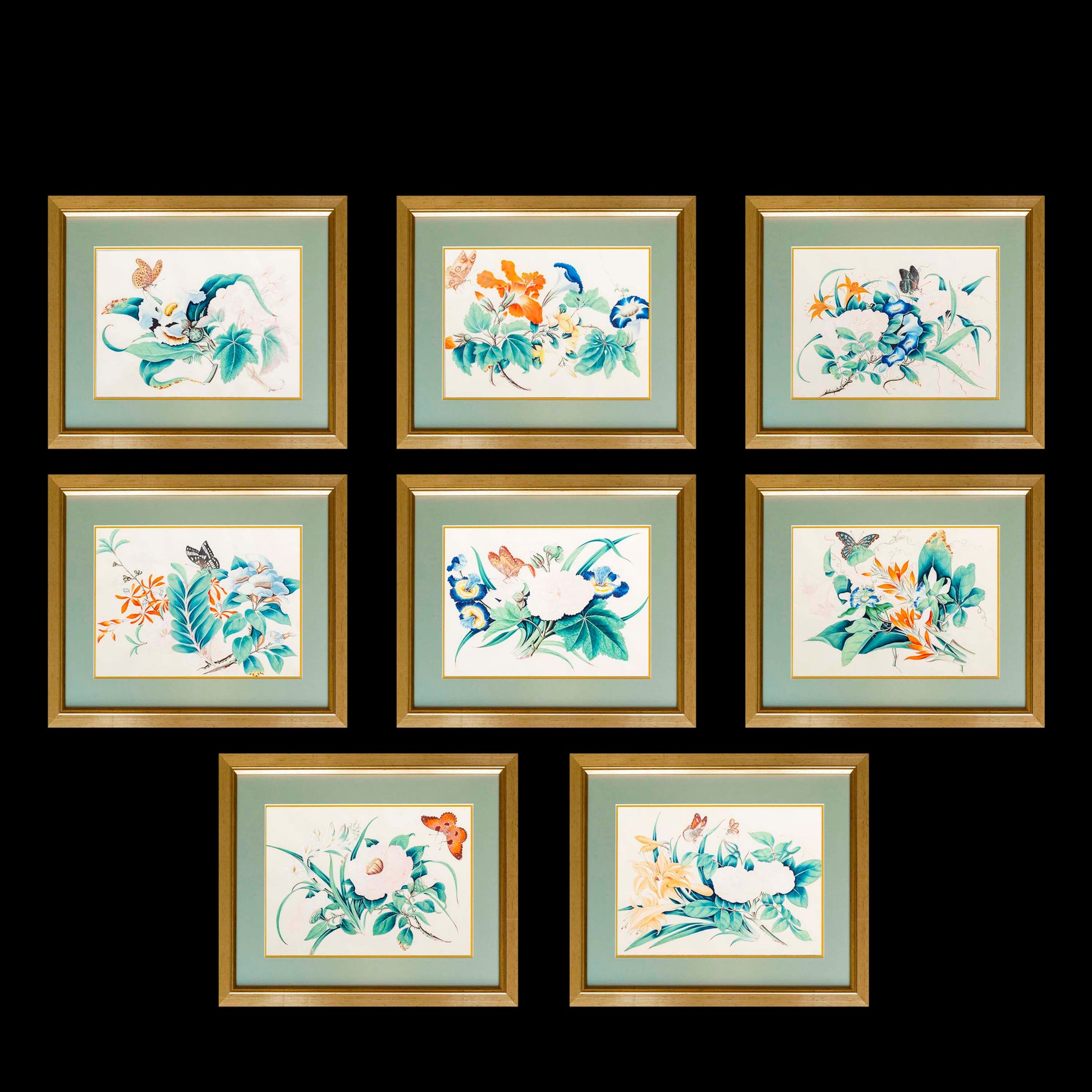 A set of eight exquisite hand-coloured botanical prints of exotic flowers and butterflies, early 20th century.