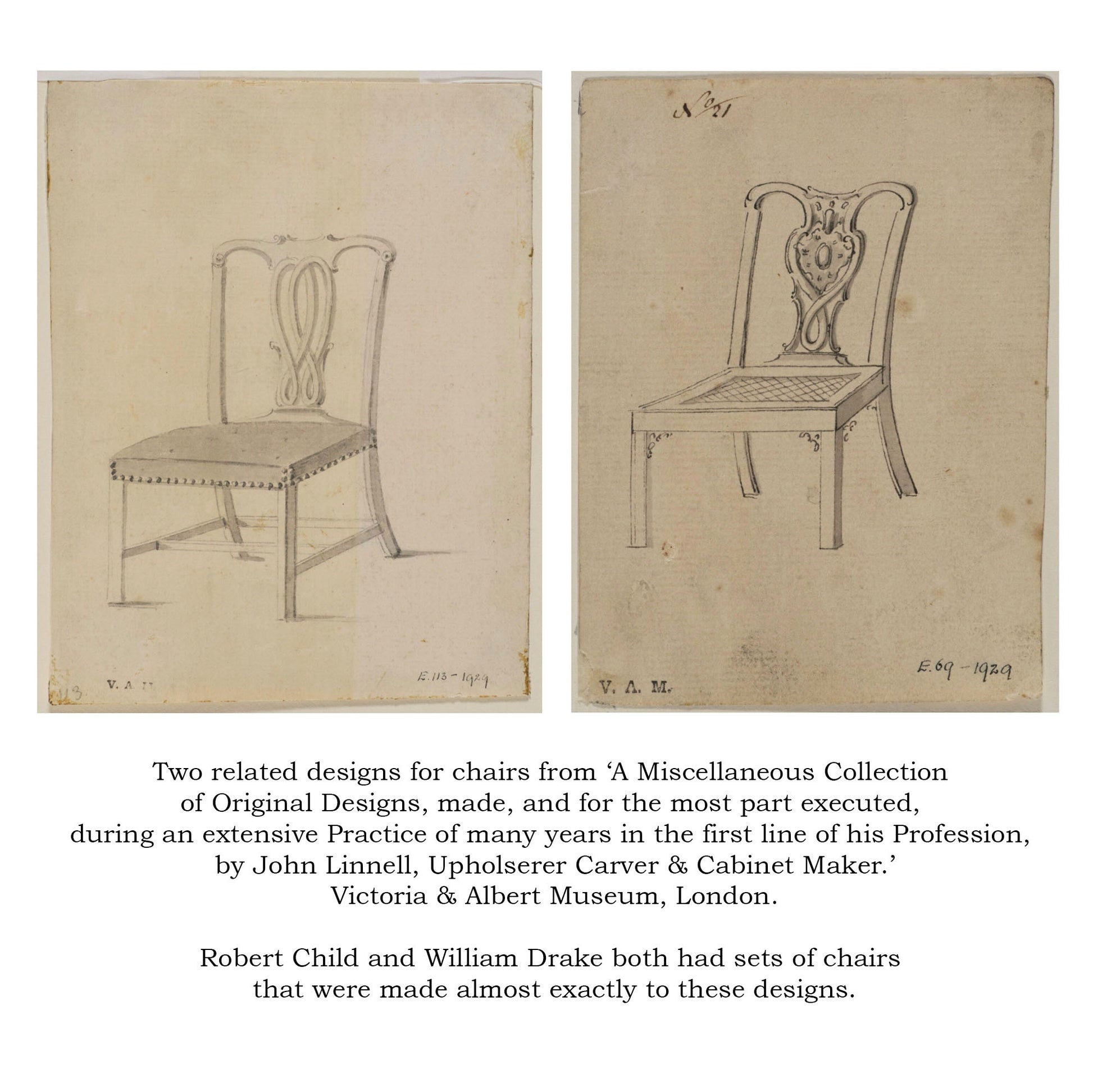 The design of this parlour chair can be firmly attributed to the Berkeley Square cabinet-maker John Linnell (d. 1796), the author of A New Book of Ornaments (1760). Linnell's similar design surviving at the Victoria and Albert Museum relates to chairs he supplied around 1760–67 to Robert Child for Upton House, Oxfordshire, and also to William Drake for Shardeloes, Buckinghamshire. A set of chairs with virtually identical backs was sold Christie's New York, 18 October 2001, lot 32.