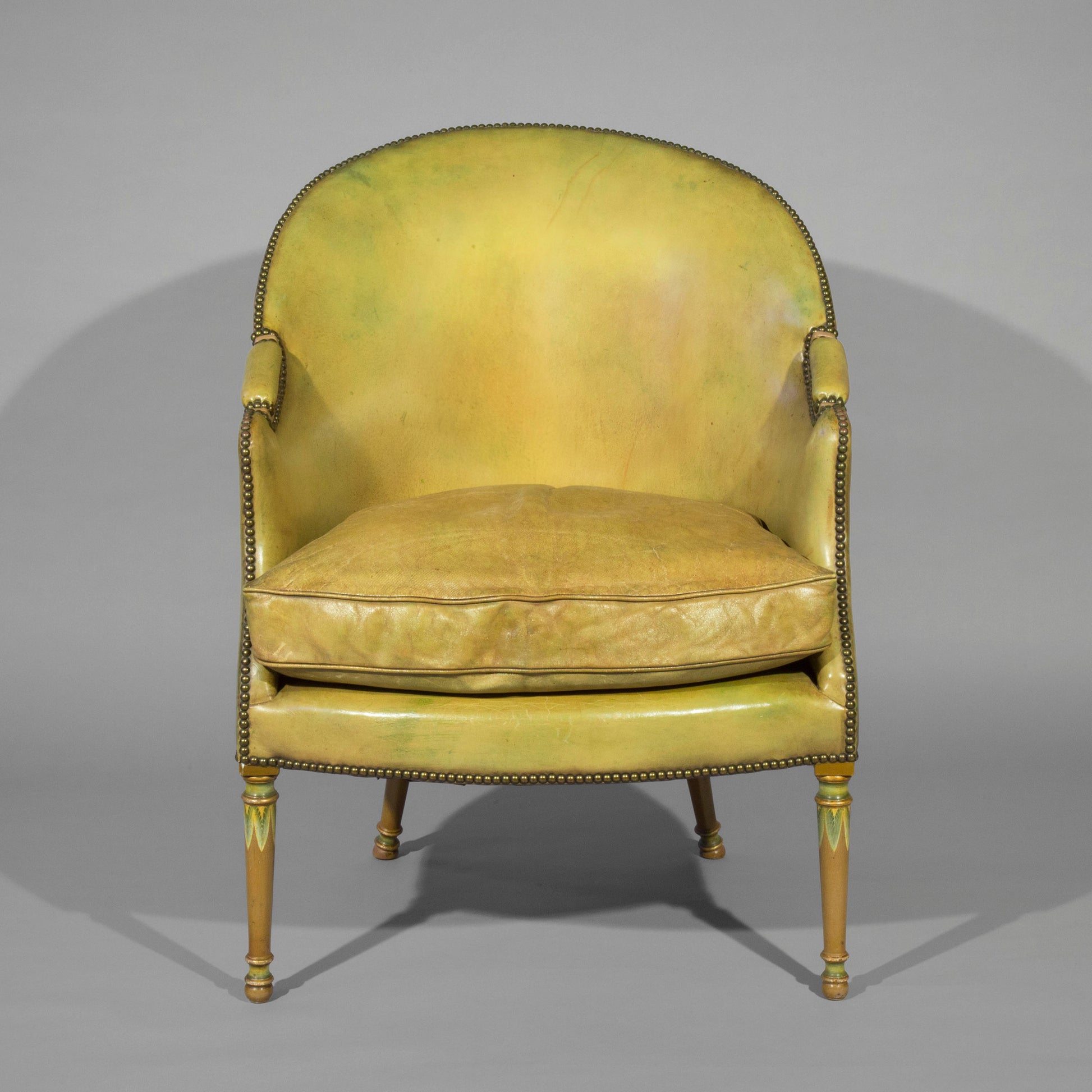 Its beautifully patinated studded leather, oversize proportions and extremely well drawn shape surely make this superb library chair a rare and desirable find. Unusually, the legs are painted to simulate satinwood with subtle neoclassical decoration (refreshed). This chair's most amazing graphic quality that gives it a contemporary feel, at the same time being very traditional. With its feather-filled squab cushion, it is very comfortable, too.